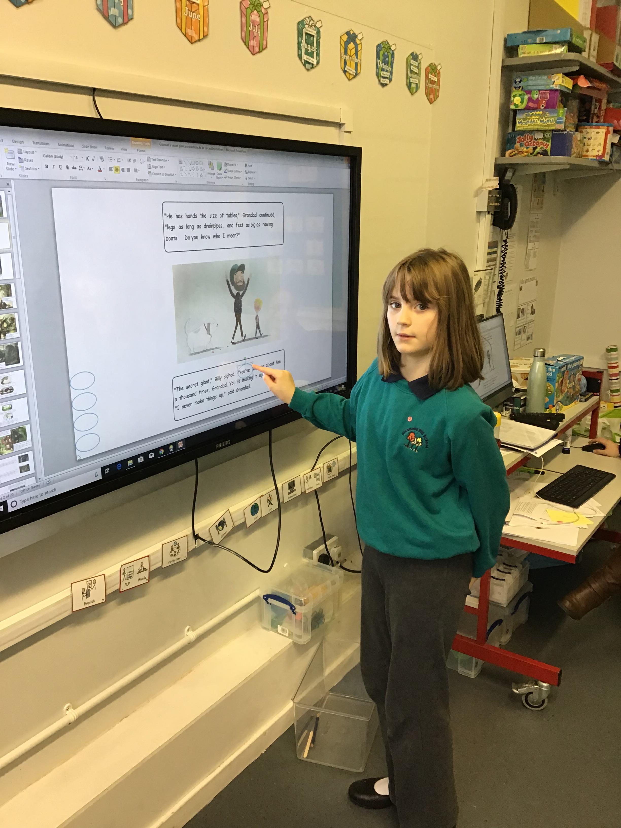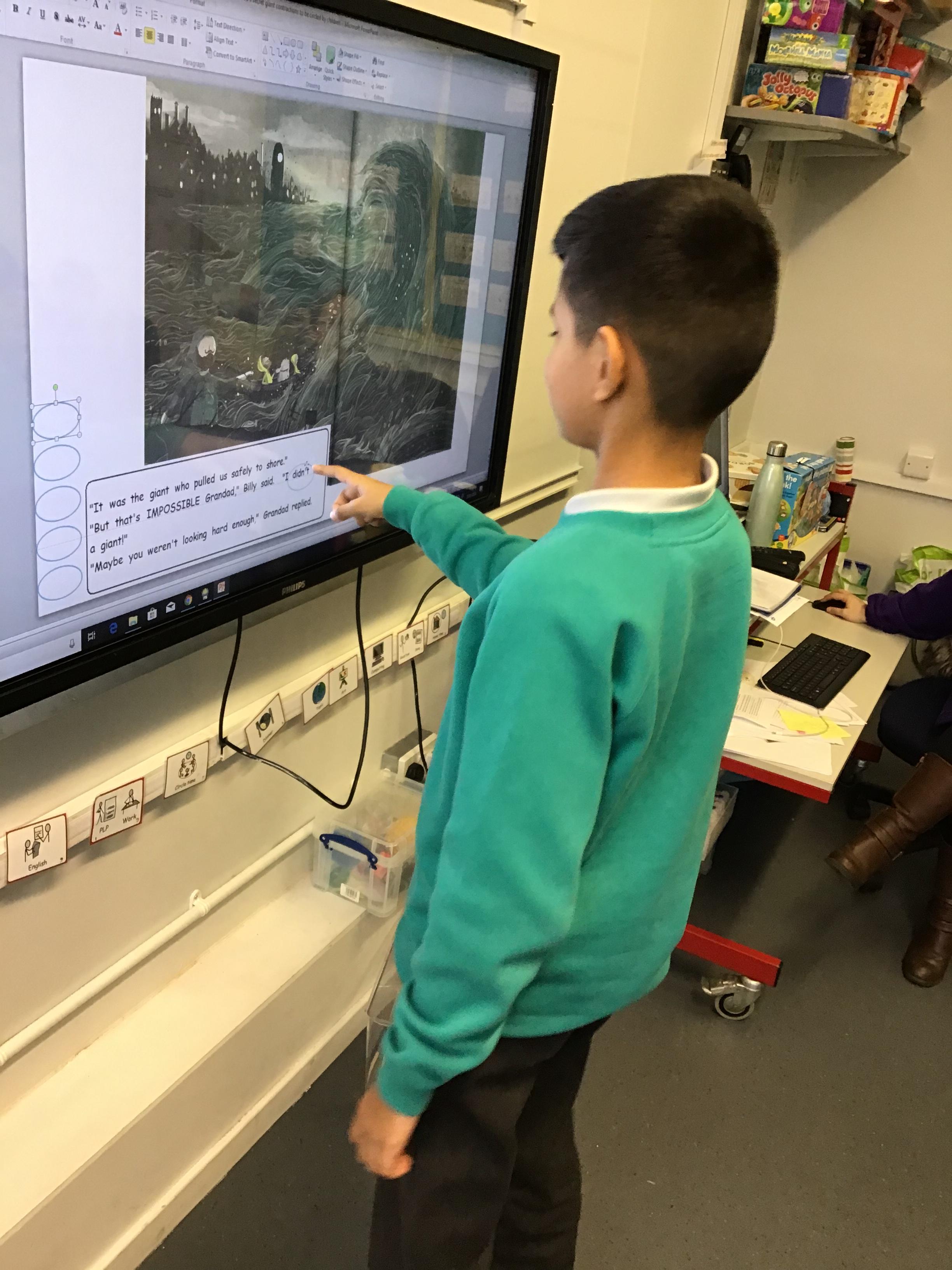 The children worked hard to find contraction words within the class story. They found lots, such as, didn't, won't and can't.