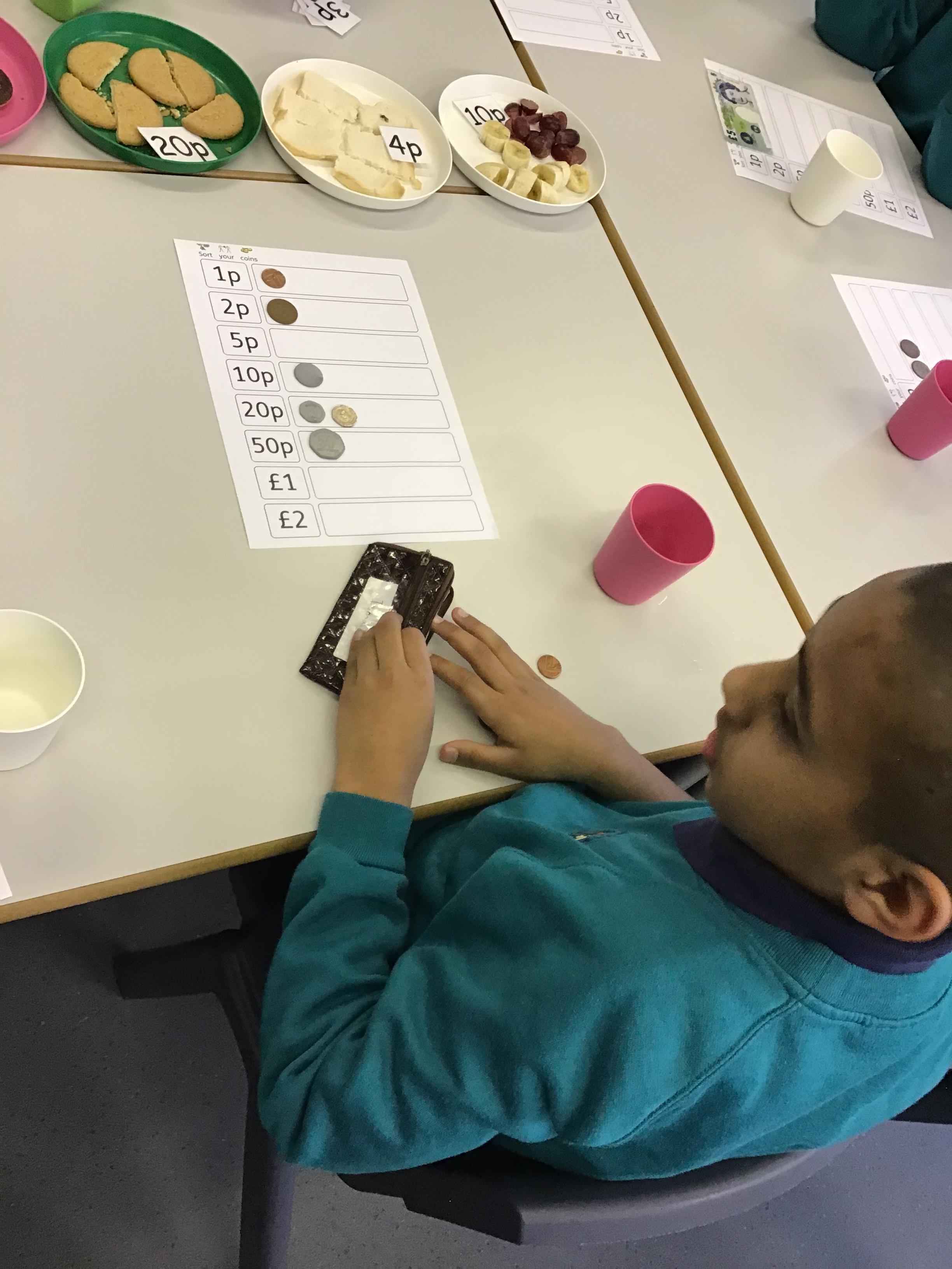 During many of our morning snack sessions the children use money to buy what they want to eat. They have to find the correct coins asked for by the shopkeeper.