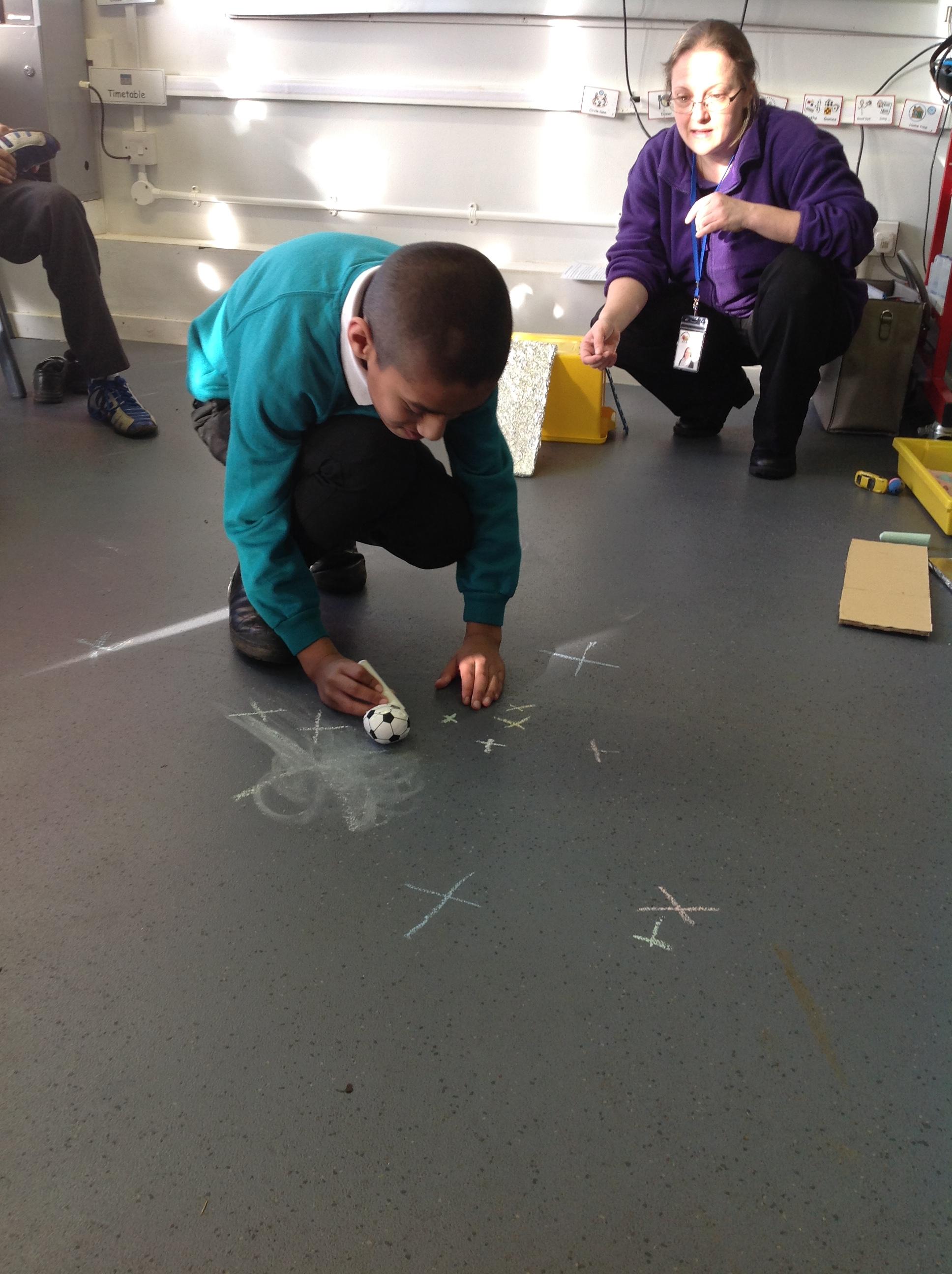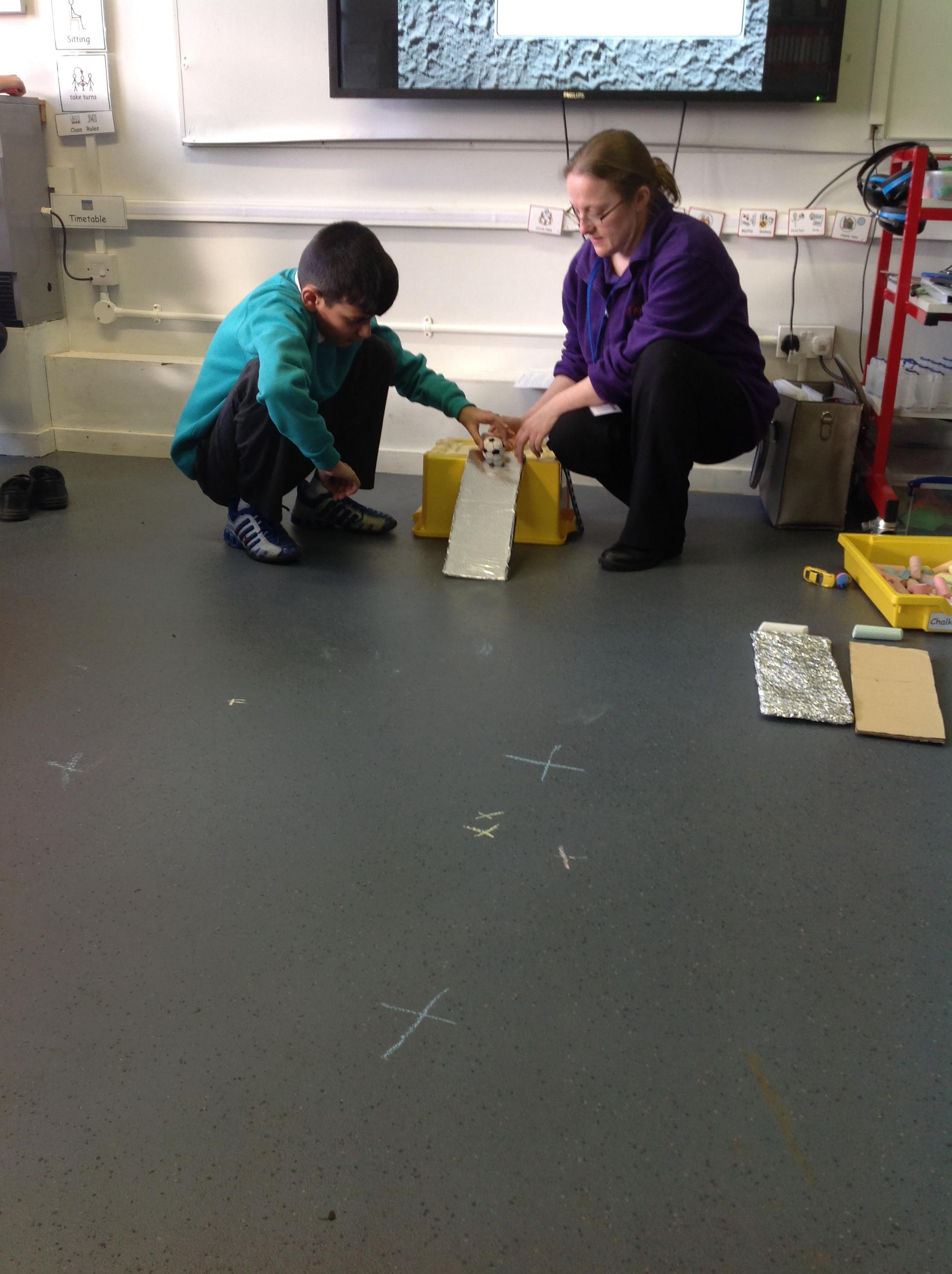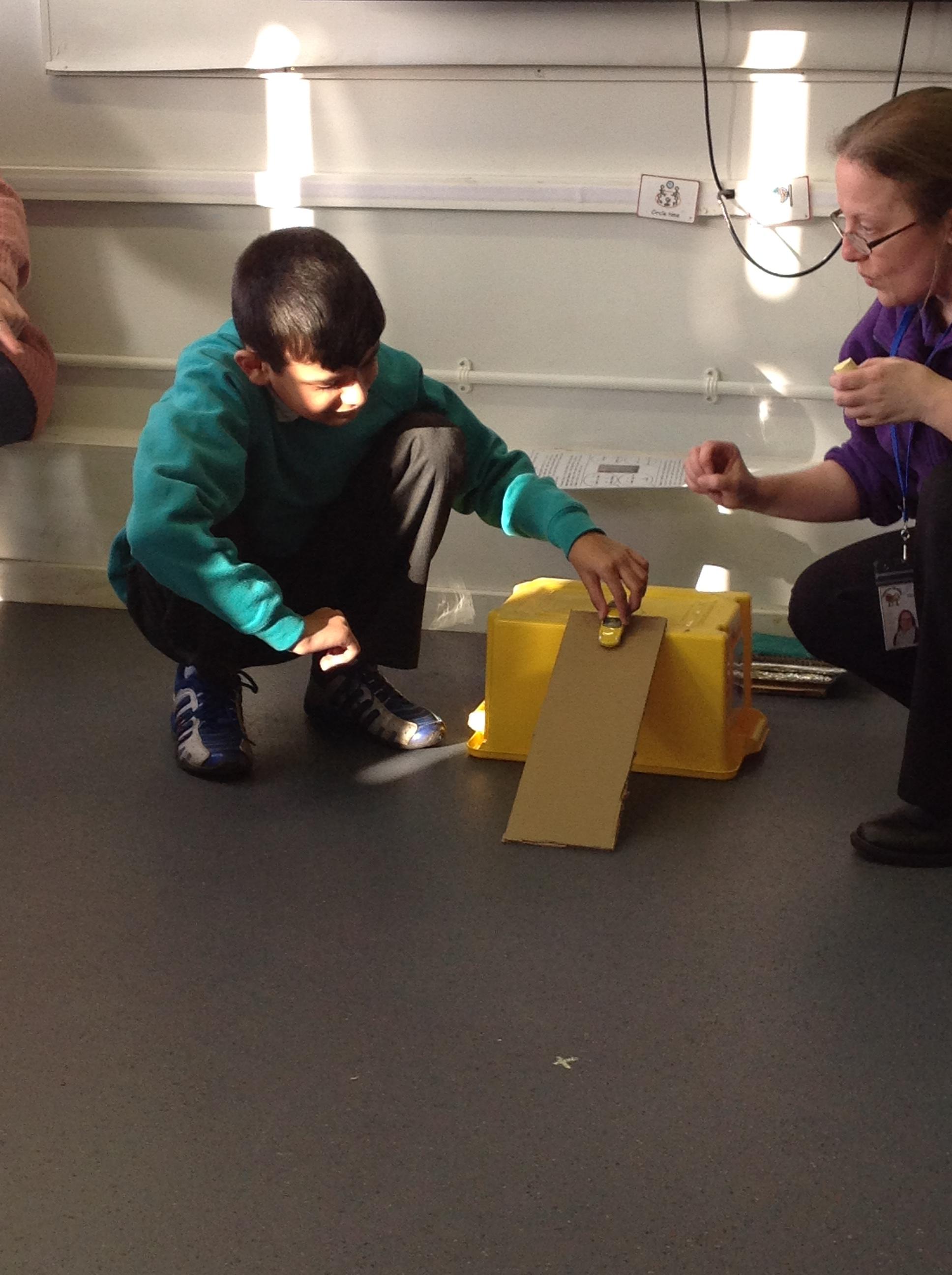 The children took turns rolling a car, then a ball, down different textured ramps. They recorded how far each one traveled. They discovered that the smooth tin foil ramp made them travel the furthest!