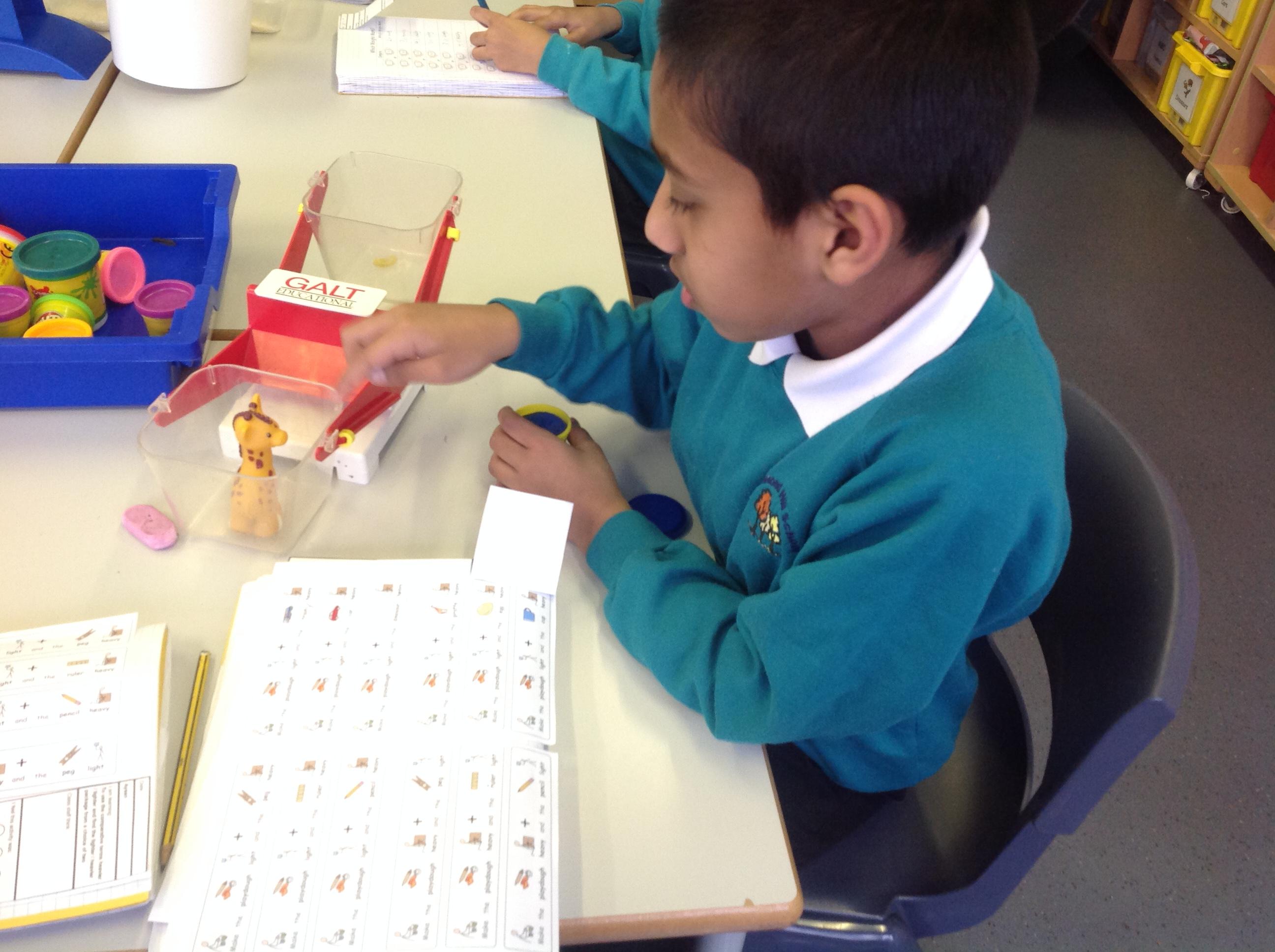 The children have been using balance scales and comparing a variety of objects and containers to find out which is heavier and which is lighter.