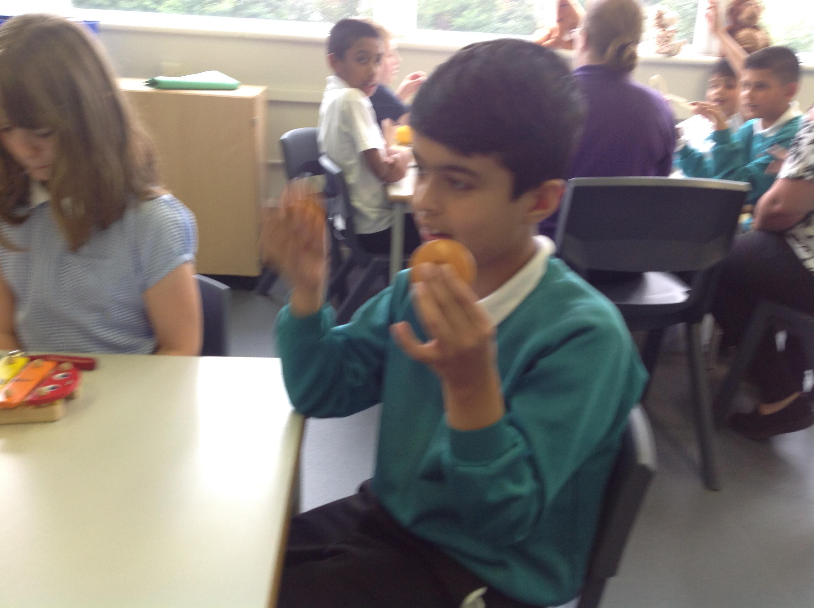 Some of the children have been investigating different ways to start and stop sounds using musical instruments. Other children have explored making their own wind chimes. They experimented how to make a louder sound or quieter sound with their wind chimes.