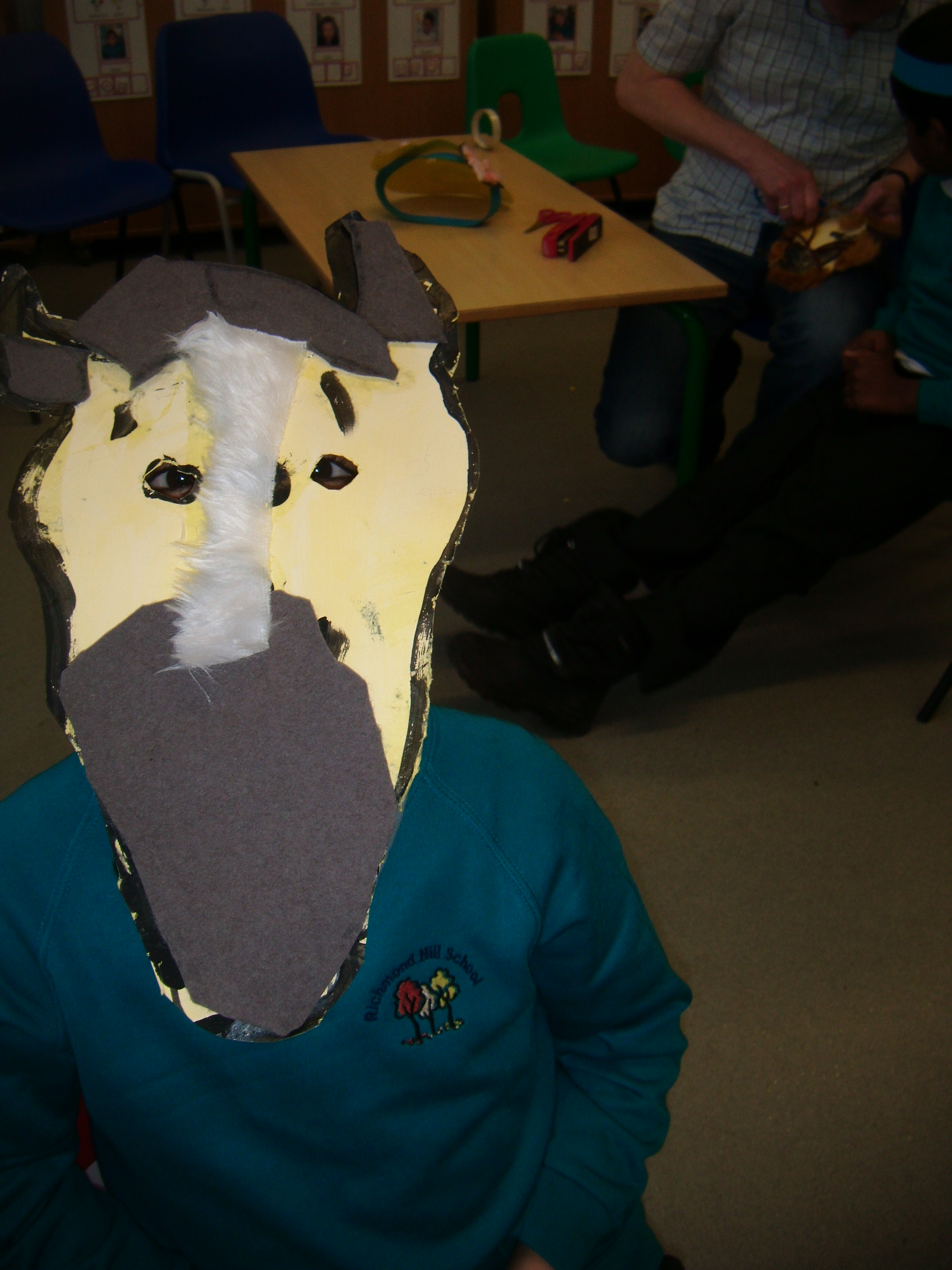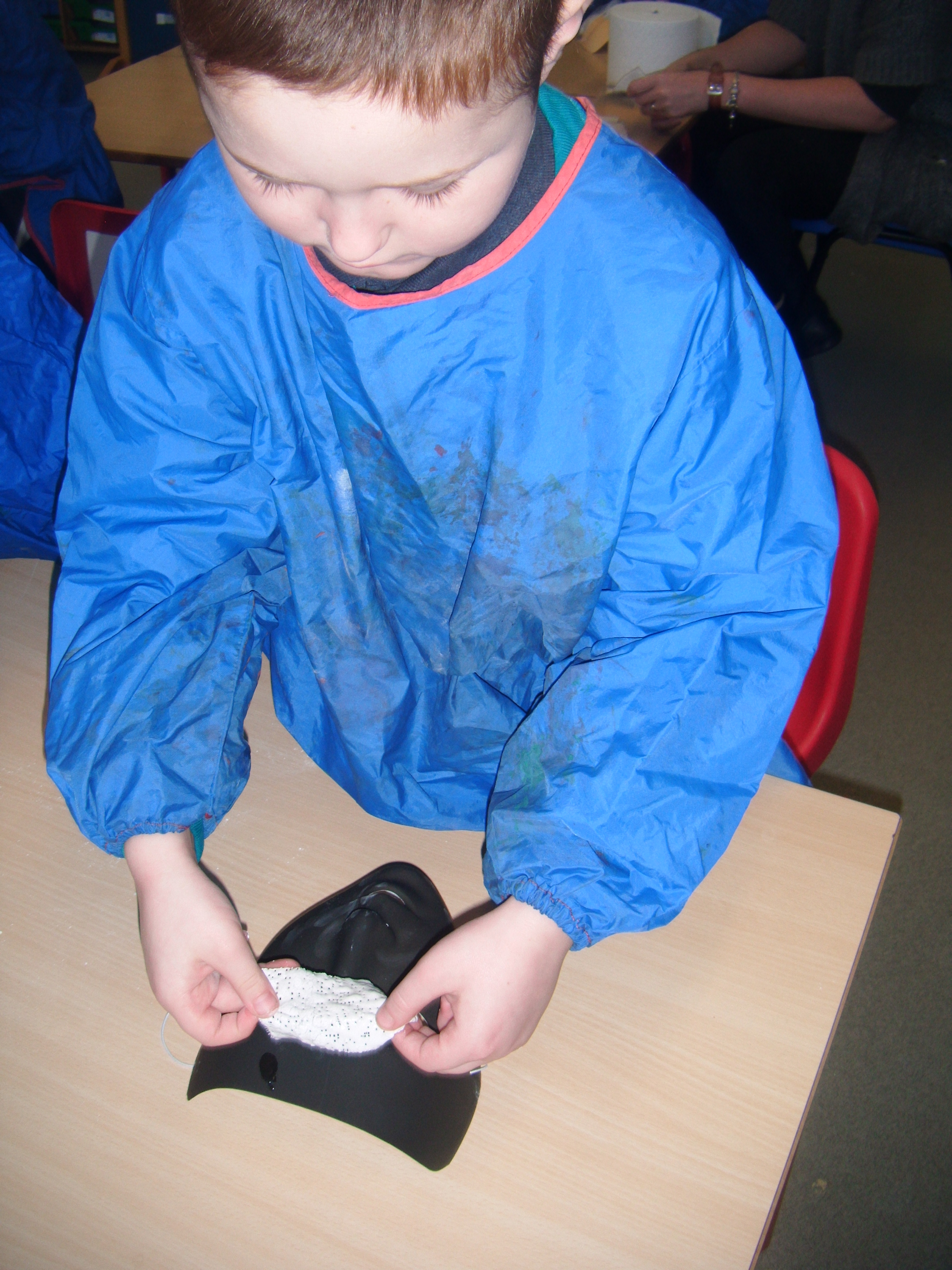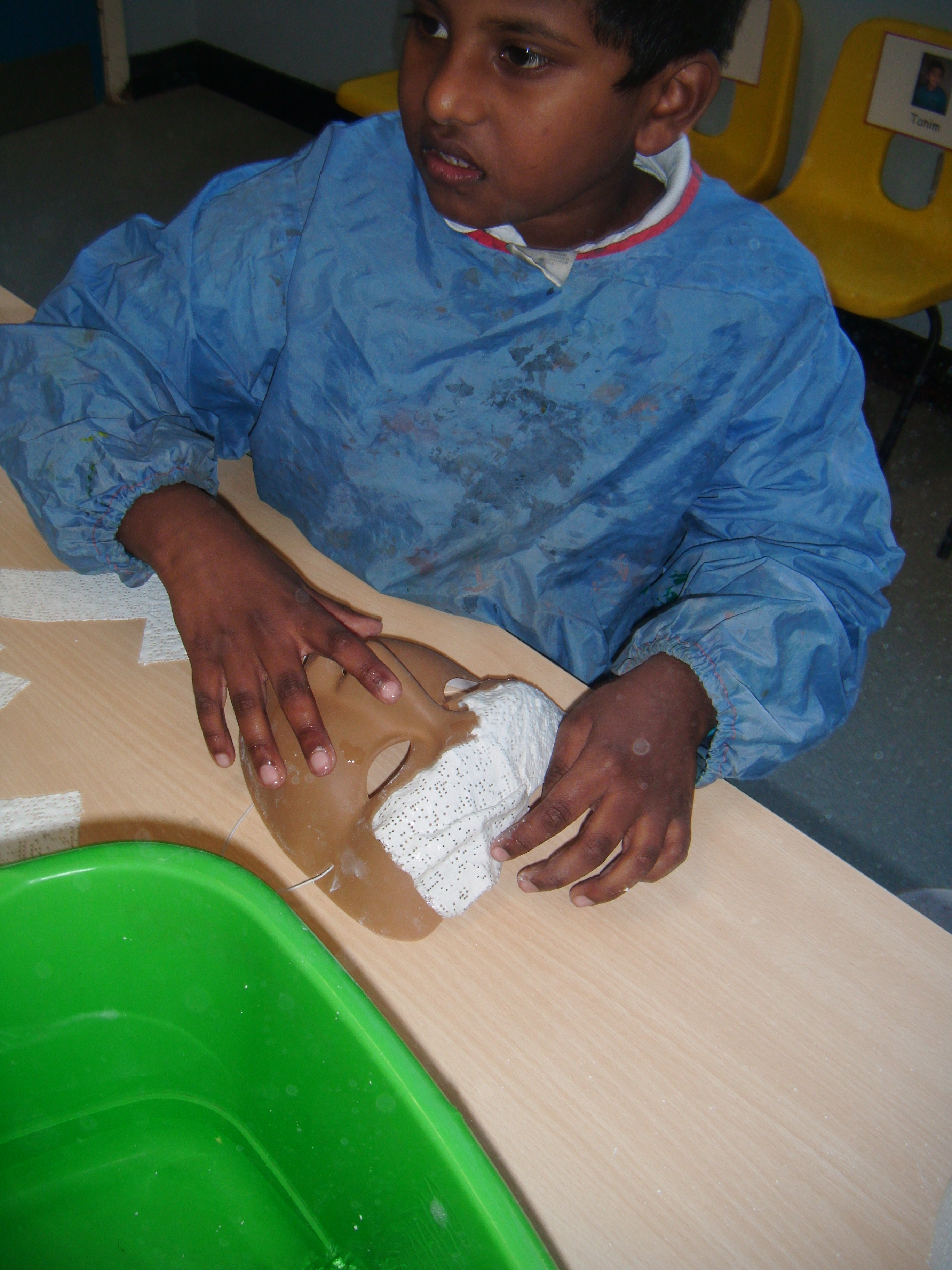 Pupils took turns wearing a range of masks, engaging in role play and looking at themselves in the mirror. They used Mud-Roc to make and decorate their own character masks.