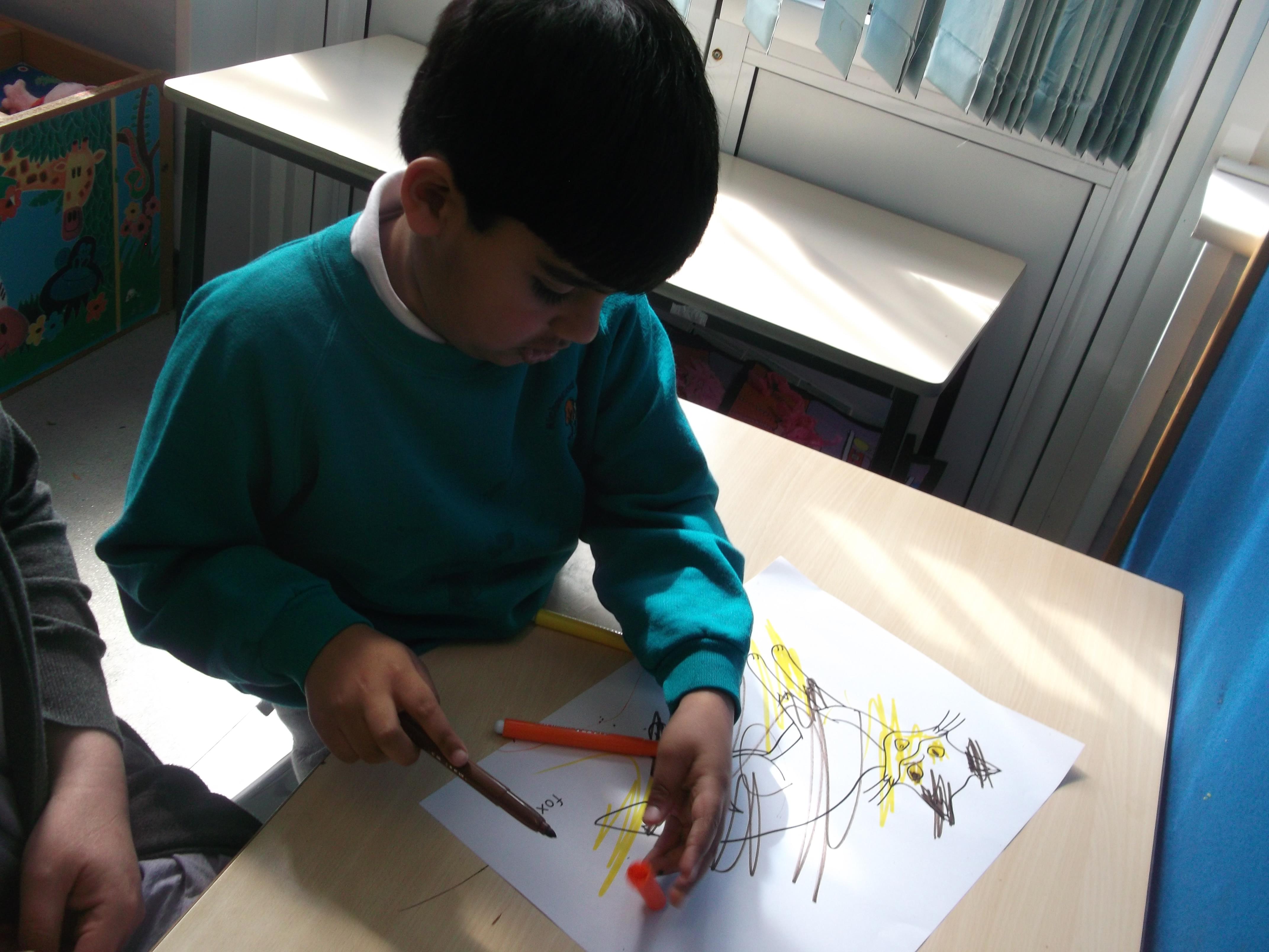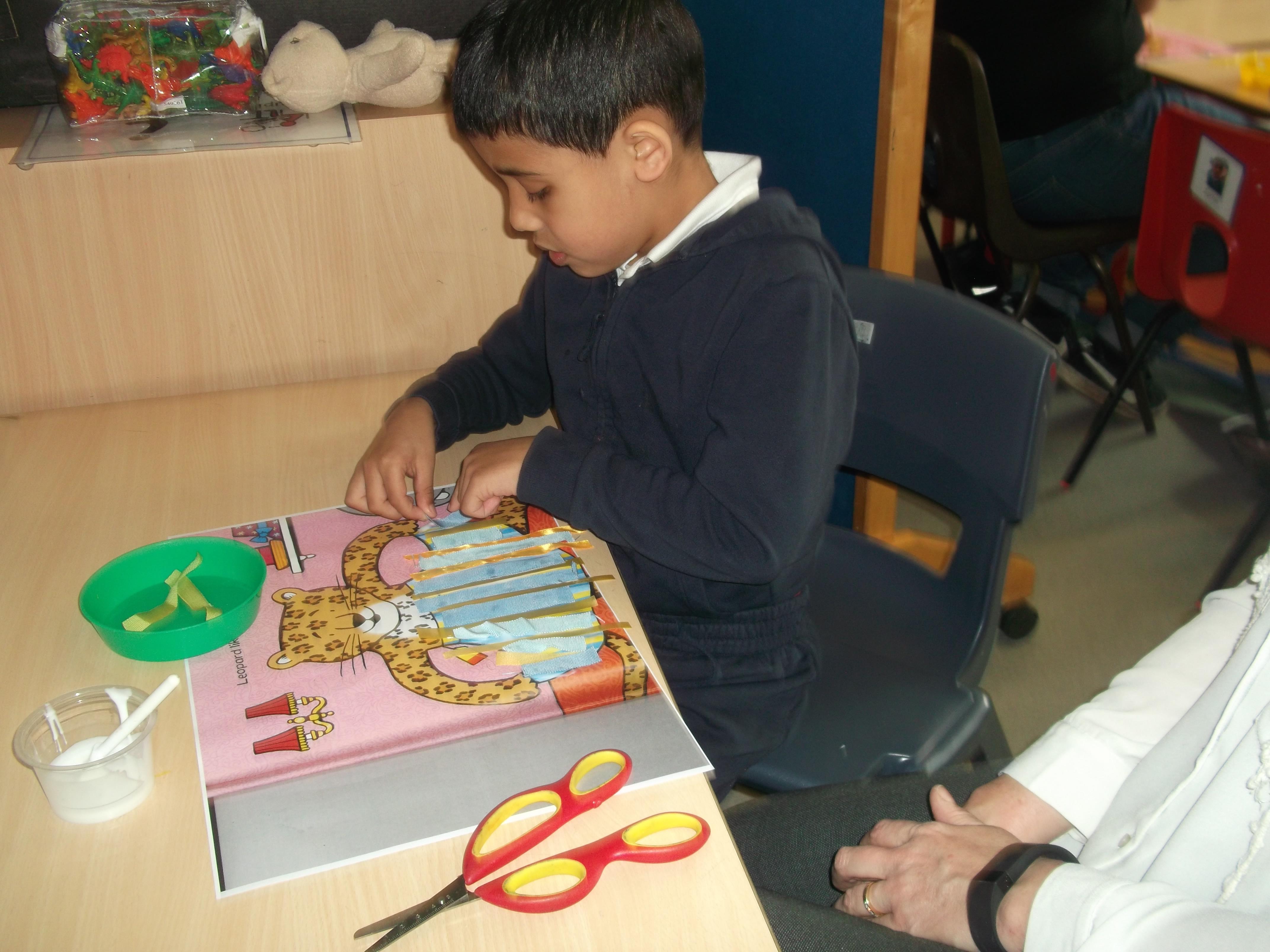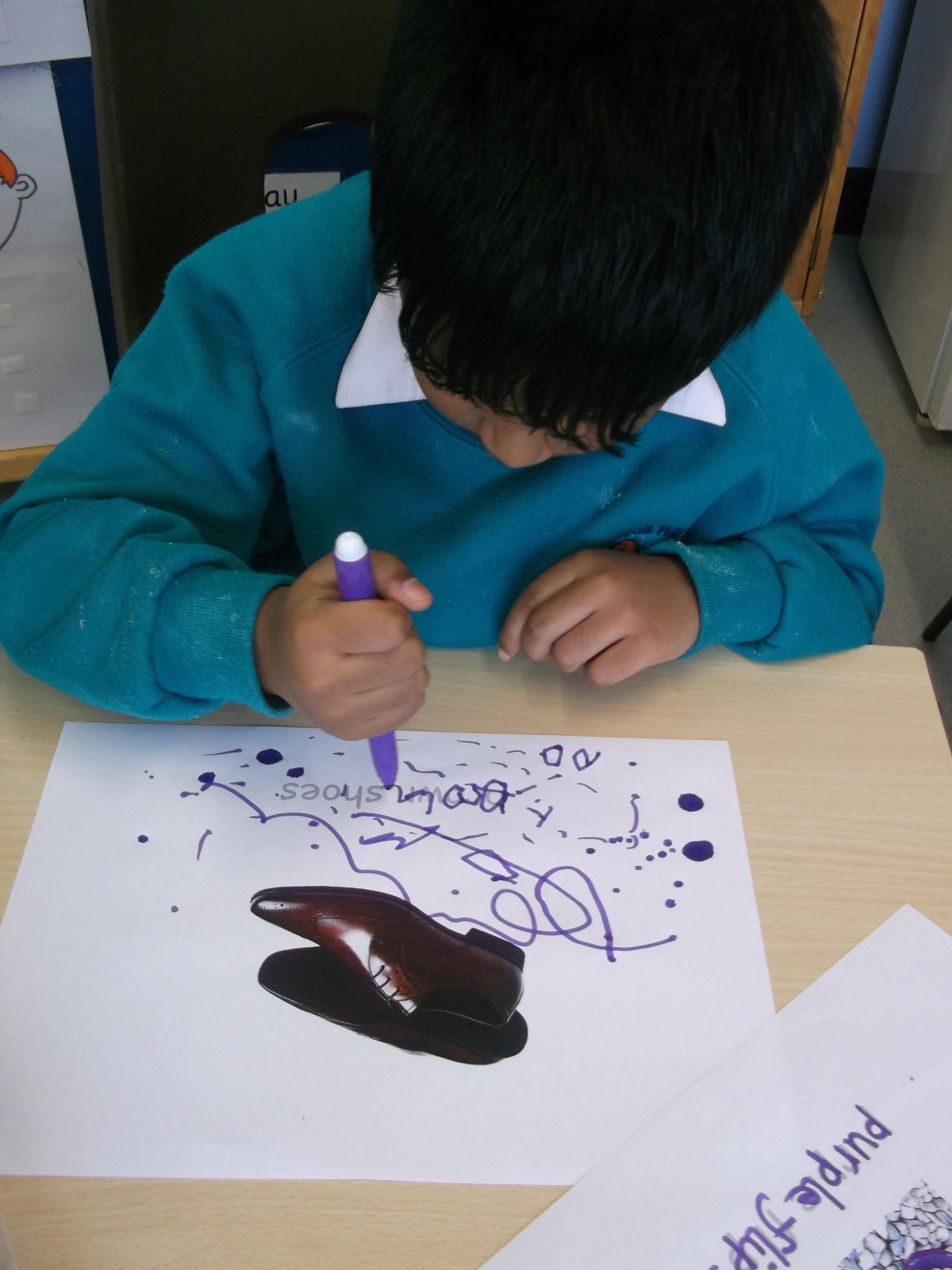 using the pictures, actions and plot as a stimulus. Pupils will move on to developing their awareness of letters and sounds. During writing lessons pupils will engage with patterns and shape formations from the story. In more formal sessions pupils will develop their skills at over writing, copy writing and early letter formation skills.