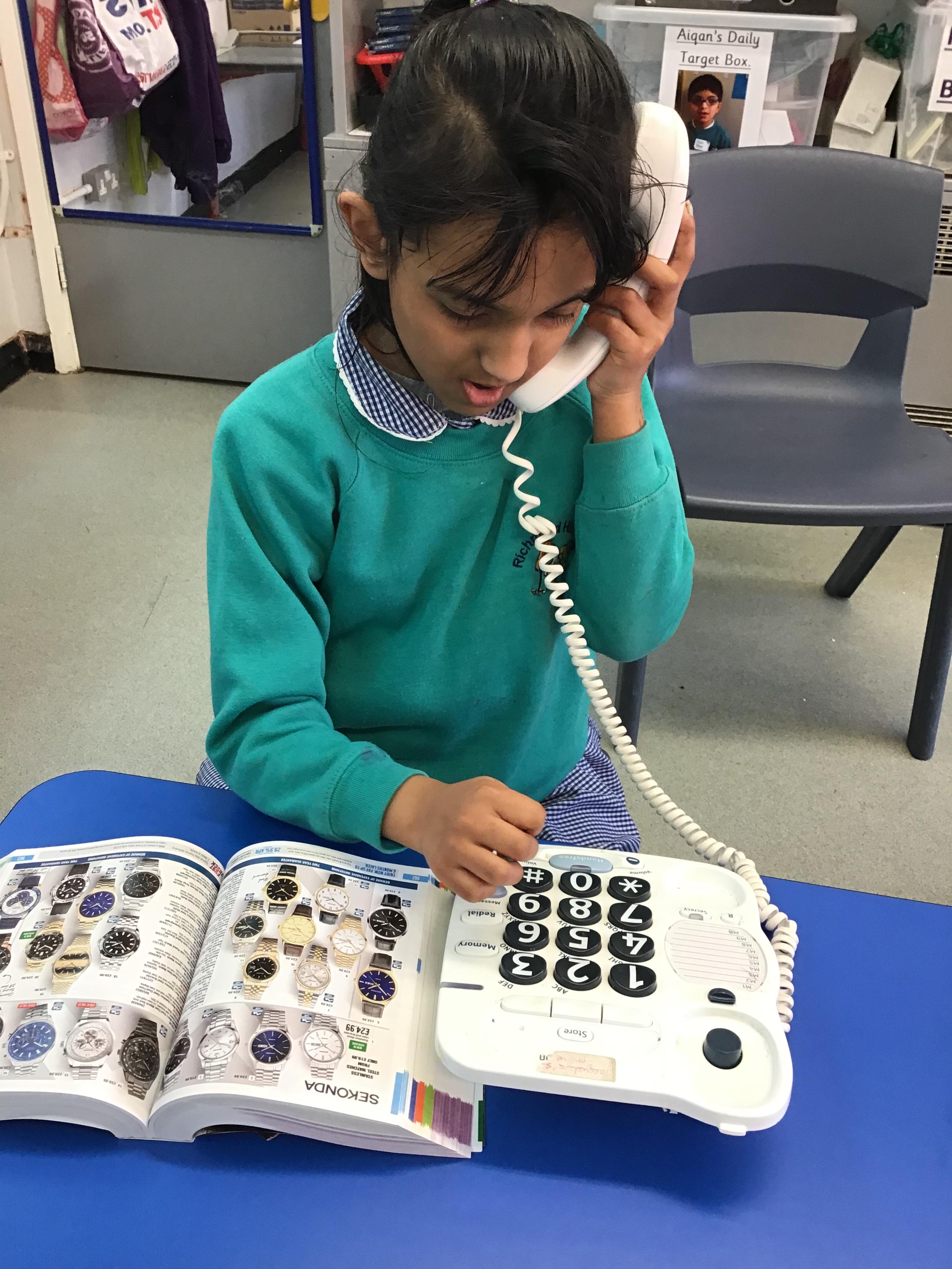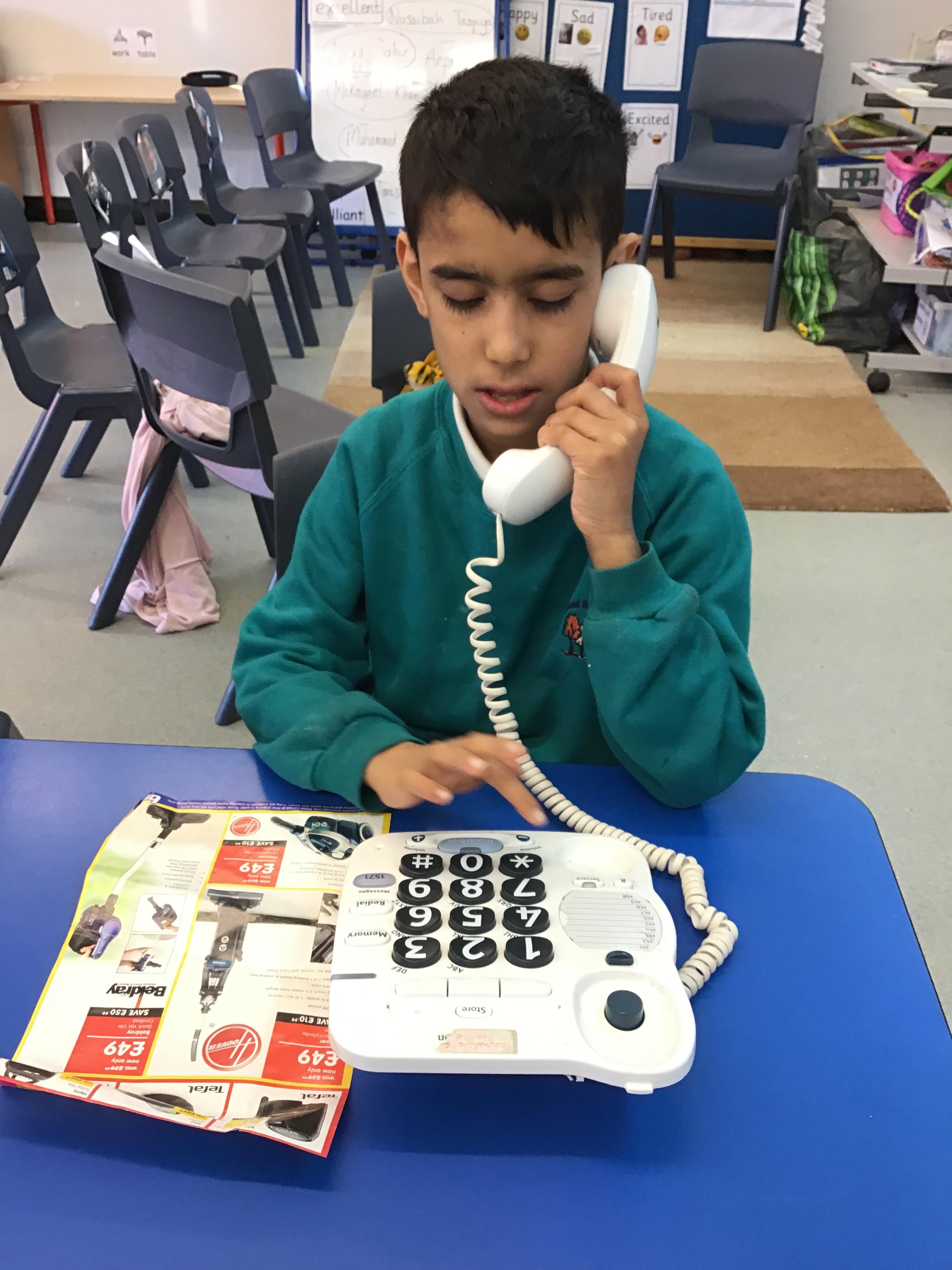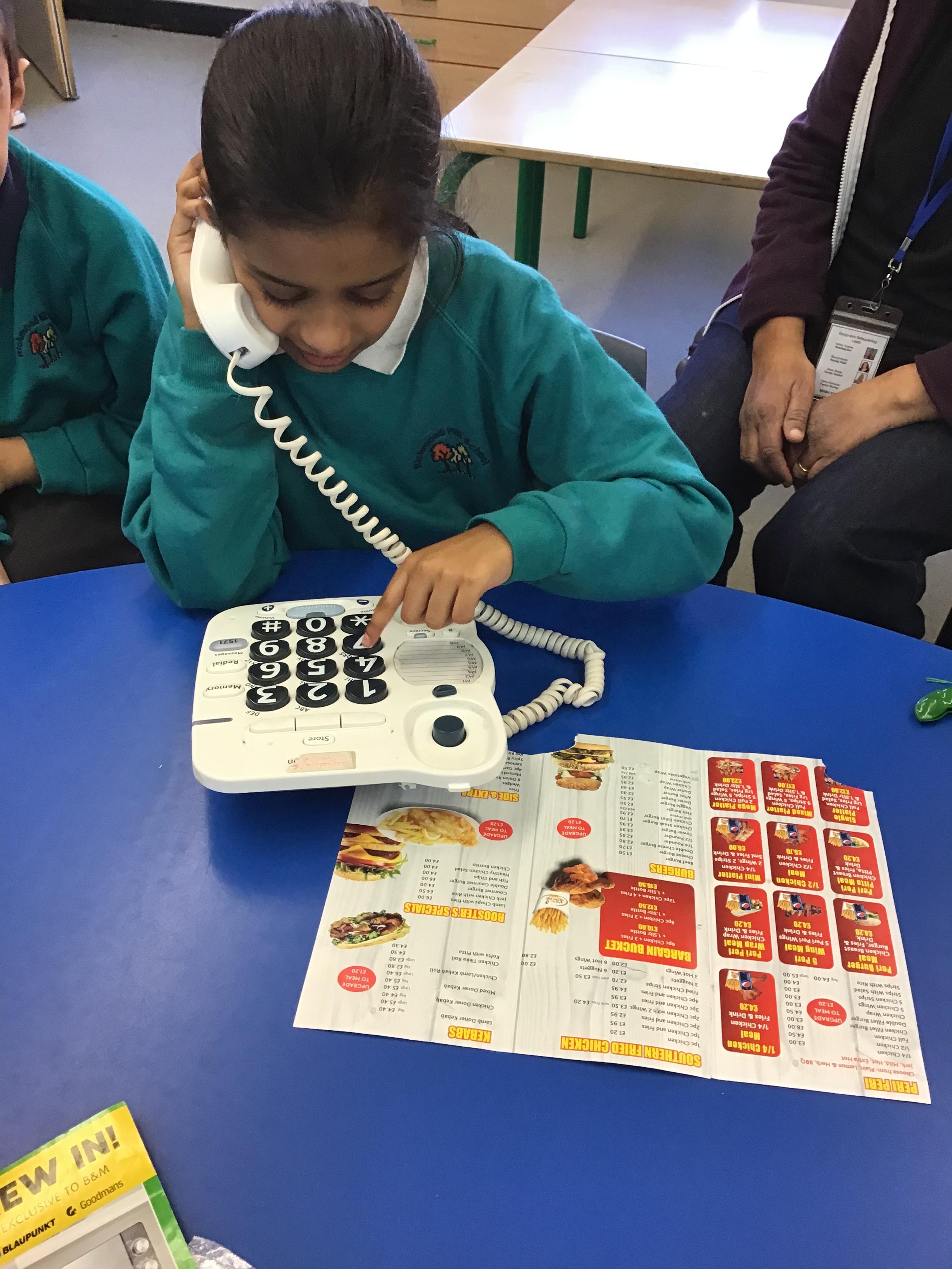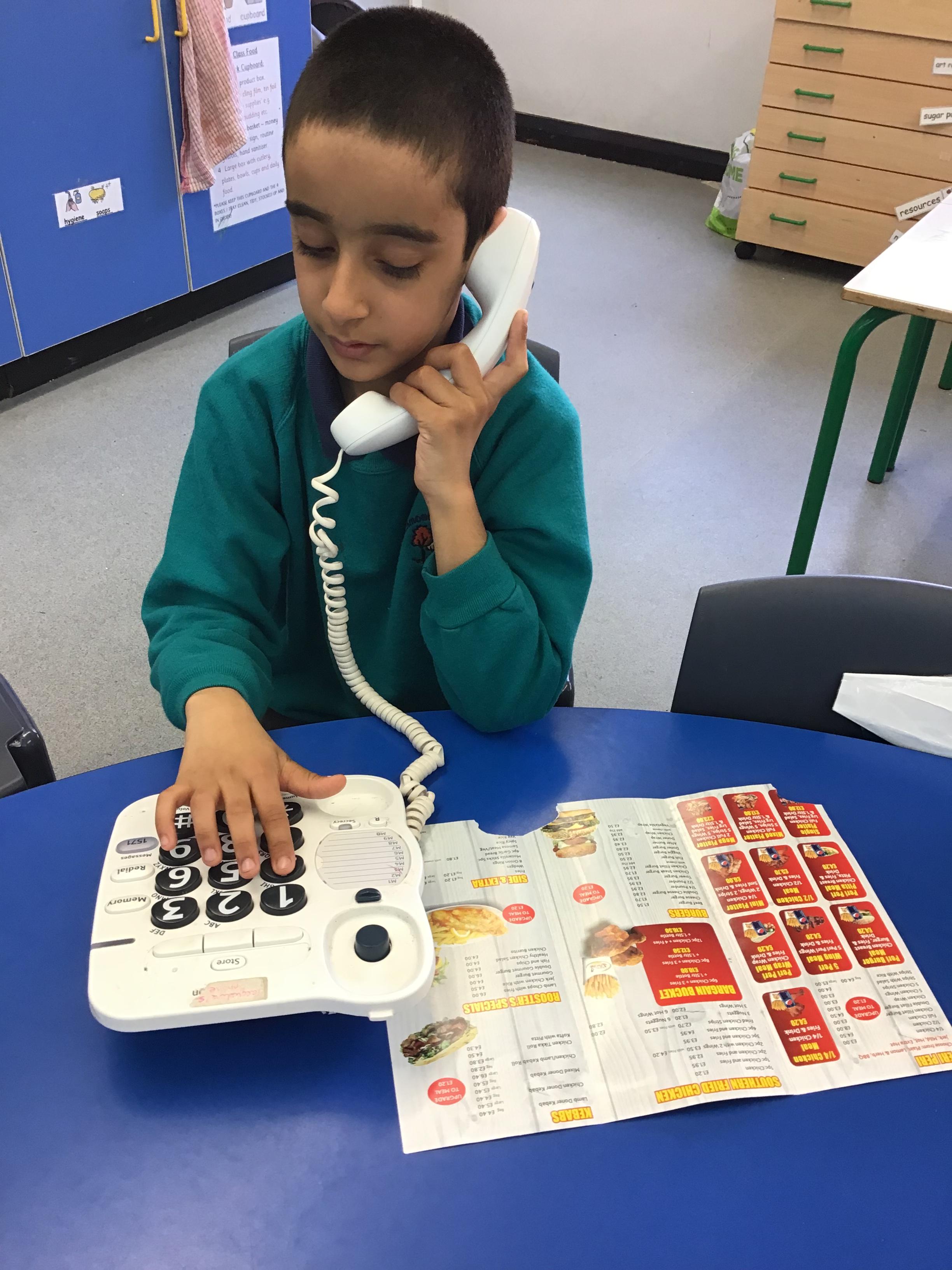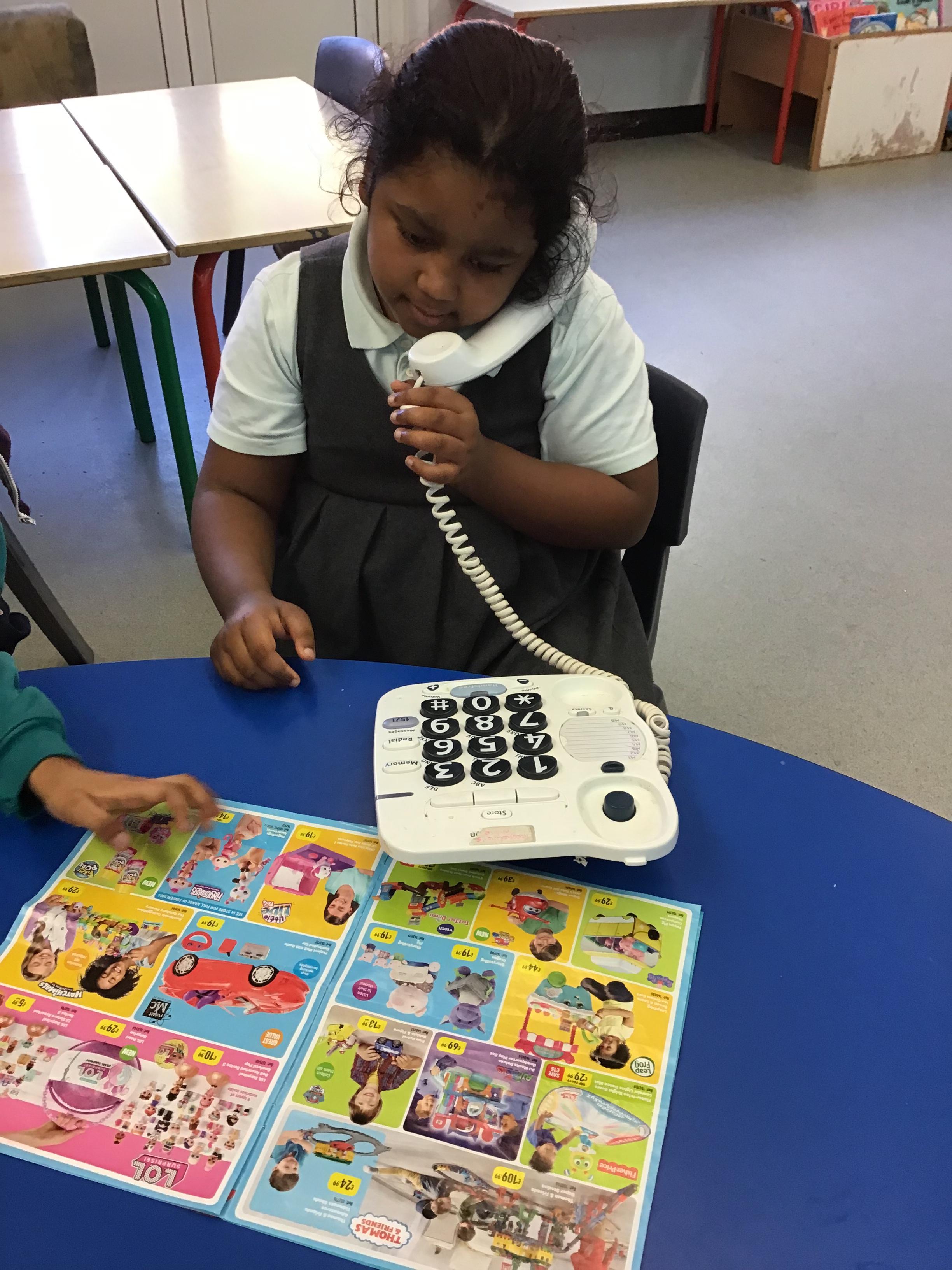 In our weekly speaking and listening lesson they used telephones to order food or toys from restaurant menus or catalogues such as Argos - they were FANTASTIC. This activity is speaking and listening focussed but also practices a lot of maths skills including numeral recognition when 'dialling the telephone number' and answering measurement questions such as a large or small pizza? how many? hot or cold? halal or non halal? how much money? etc.