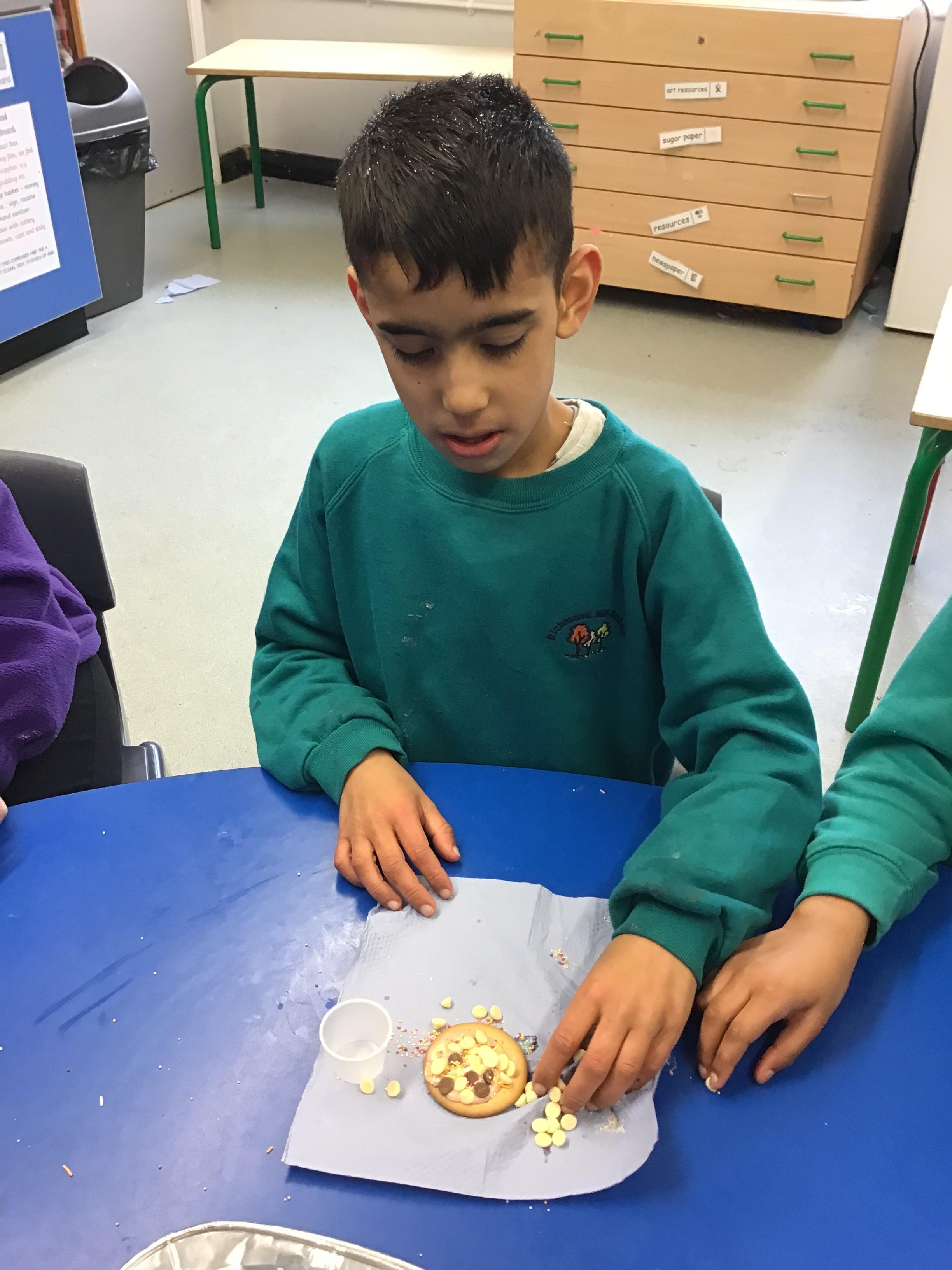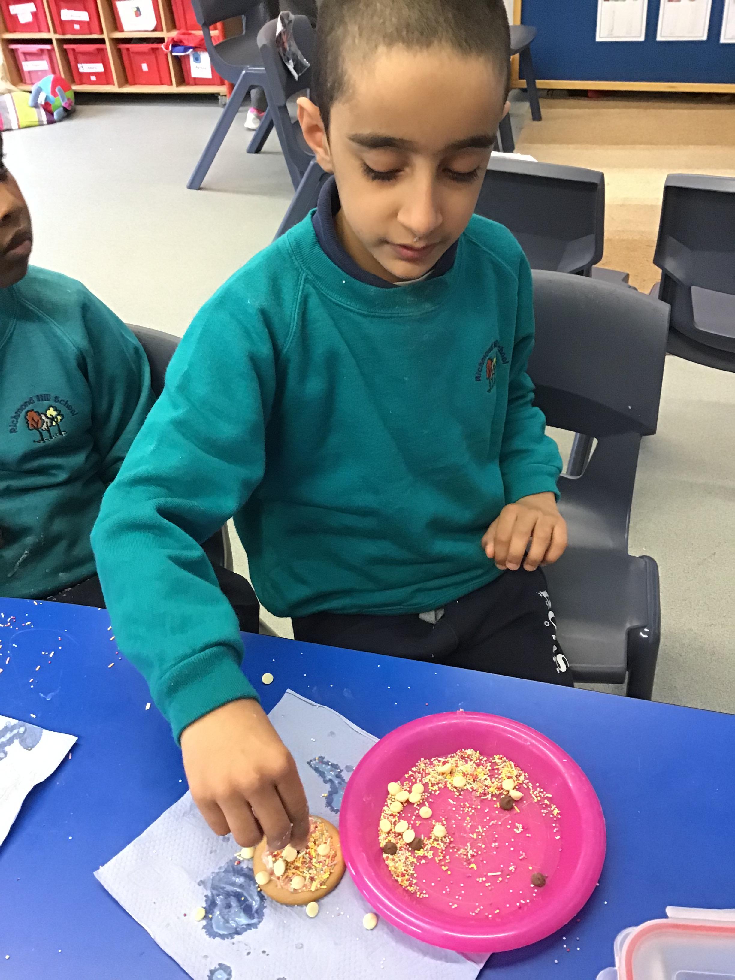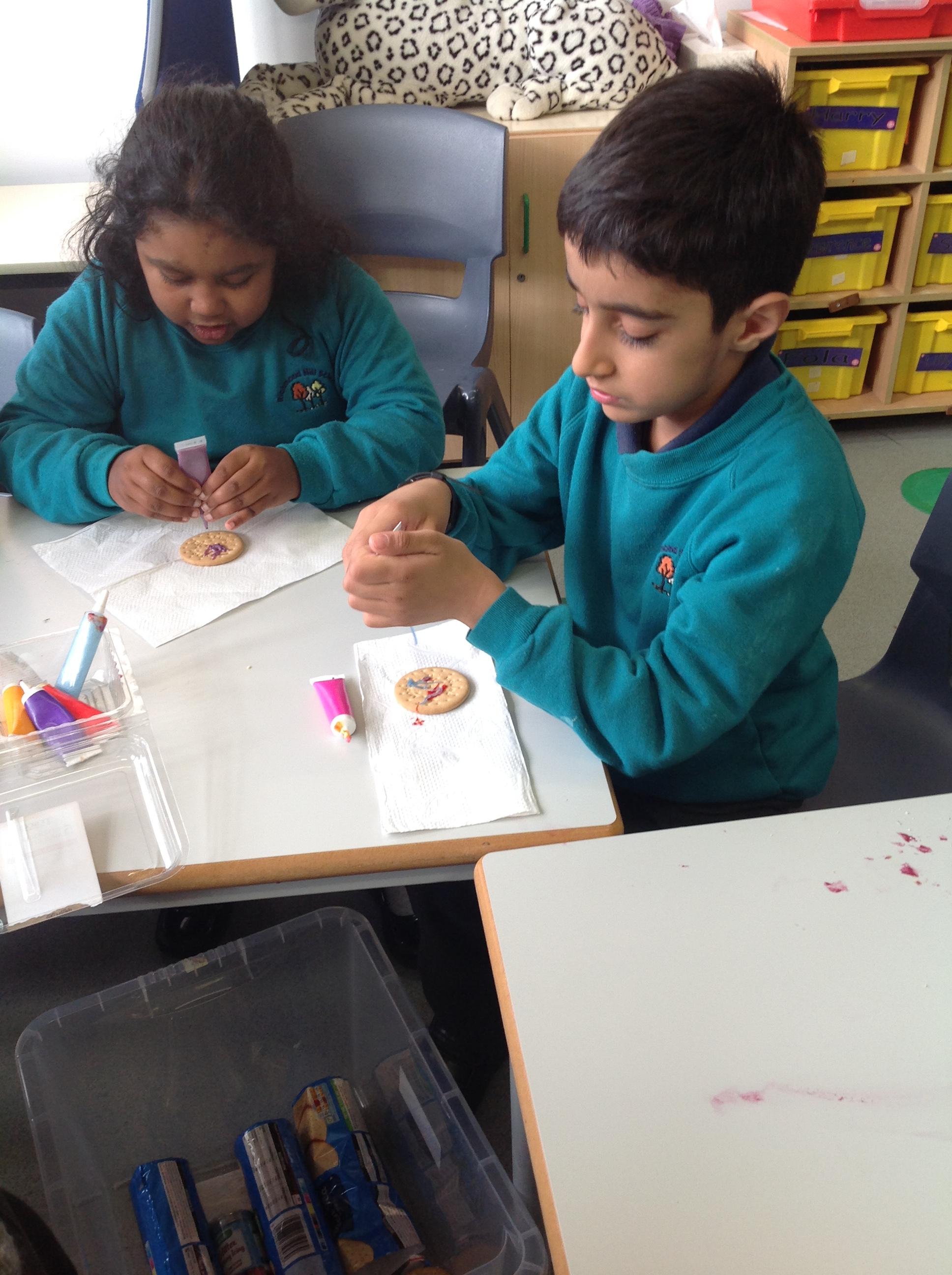 Blue class prepared posters for this year's Enterprise Fair - they posted them around school. The children decorated biscuits with icing and sweet toppings. This formed part of our science lesson with a focus on colour changing. Blue class also made popcorn cones and filled them with sweet popcorn. Our total profit was £13.74!!!