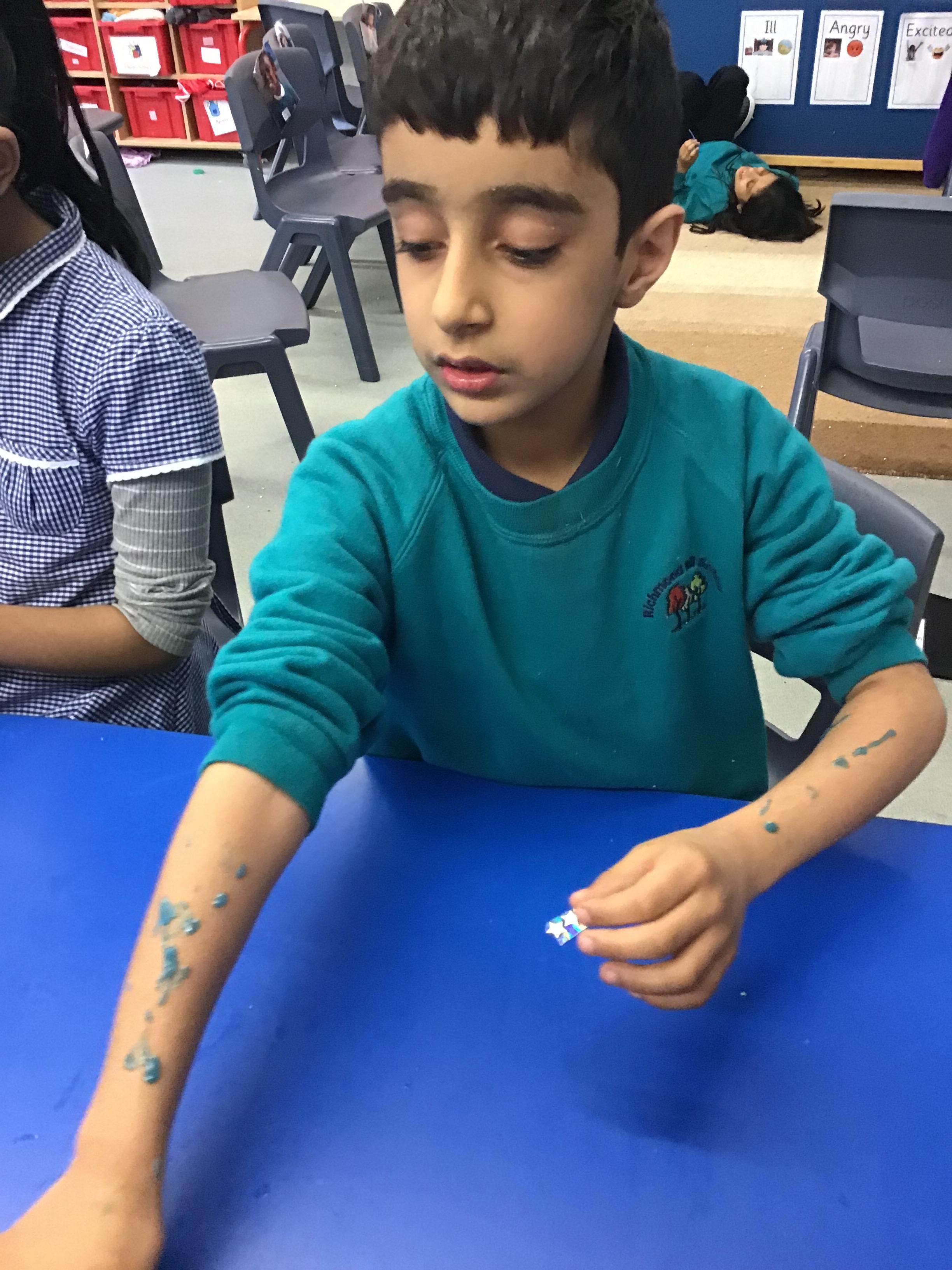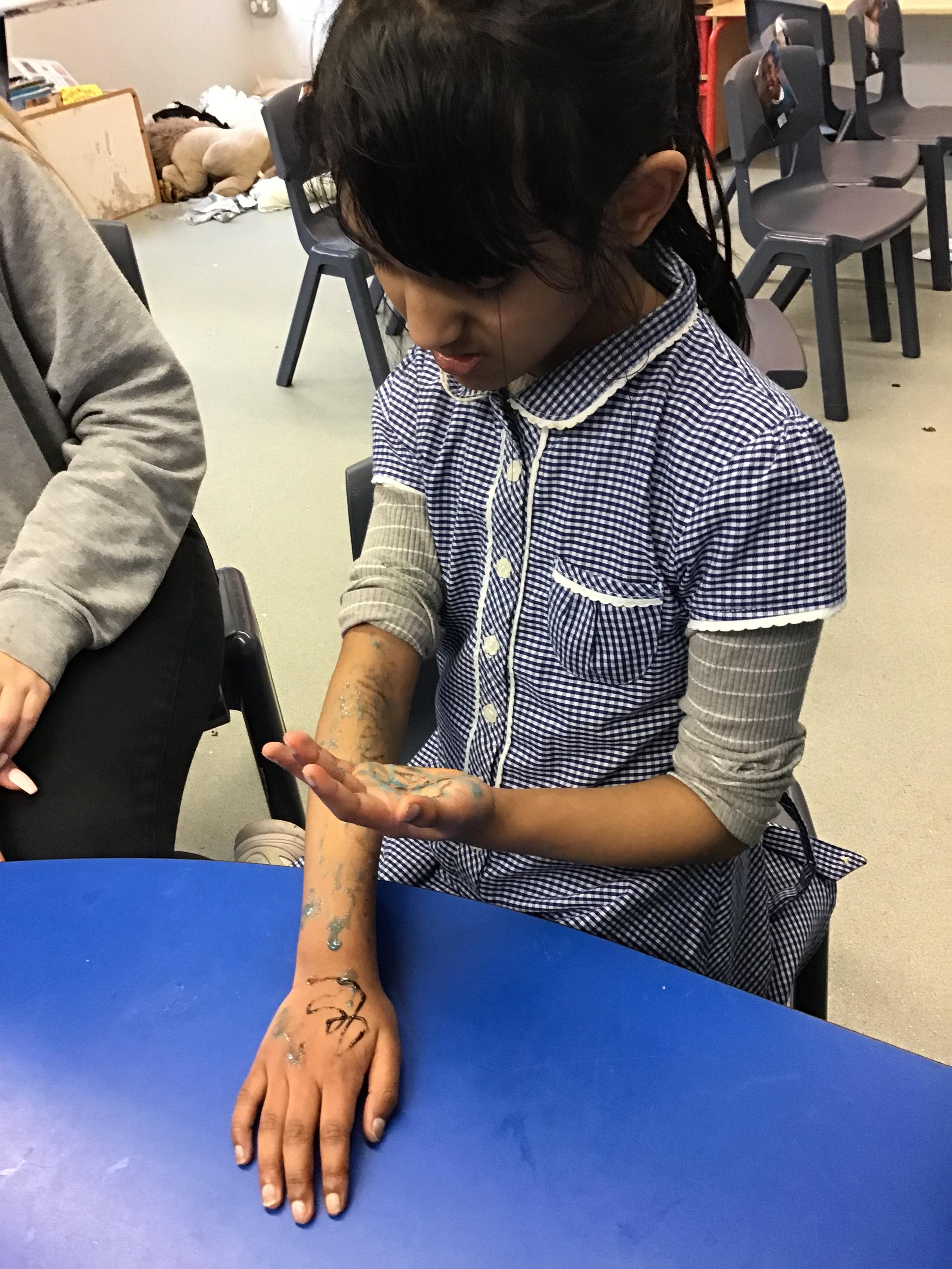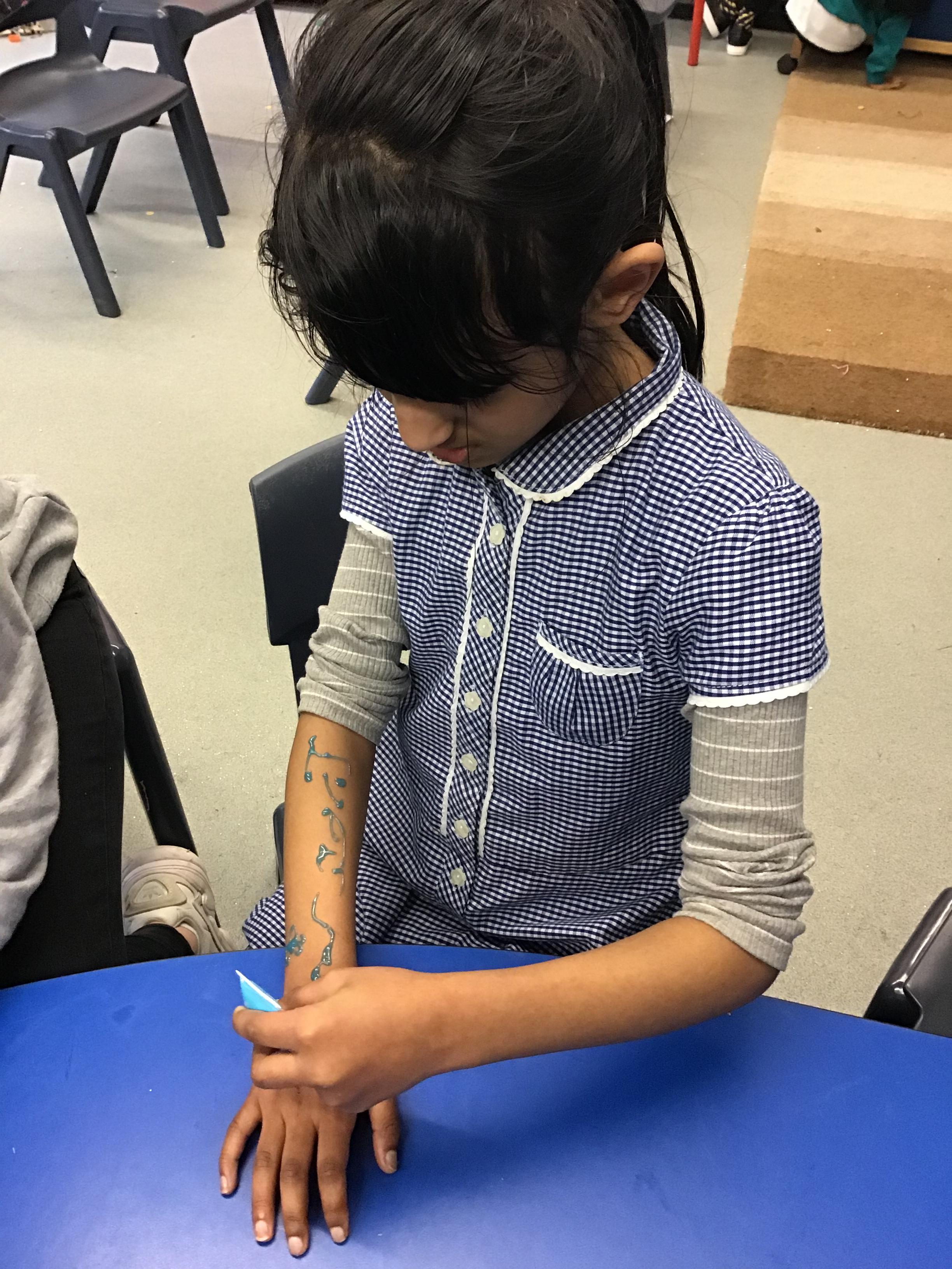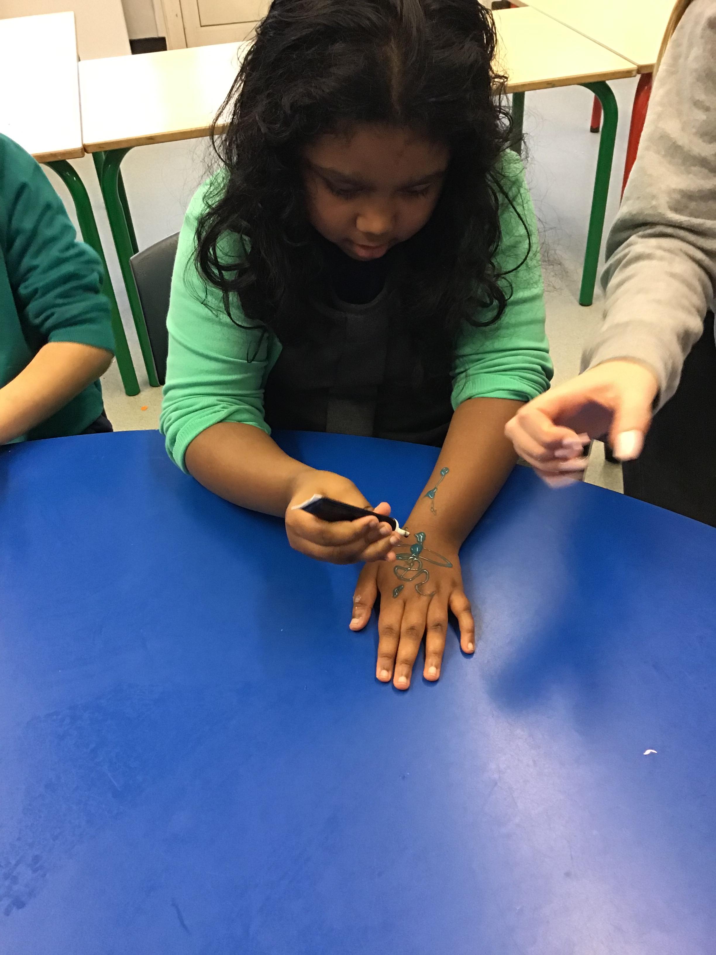 Blue class have been developing their fine motor skills and art skills by applying mehndi/henna to their hands. The children LOVED doing this. They used squeezy icing to apply their patterns to their arms / hands. They had to sit very still to allow it to dry!