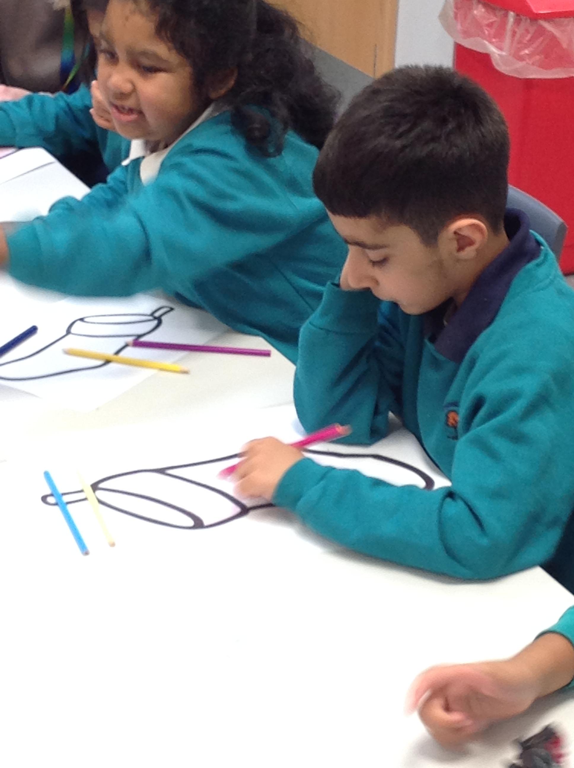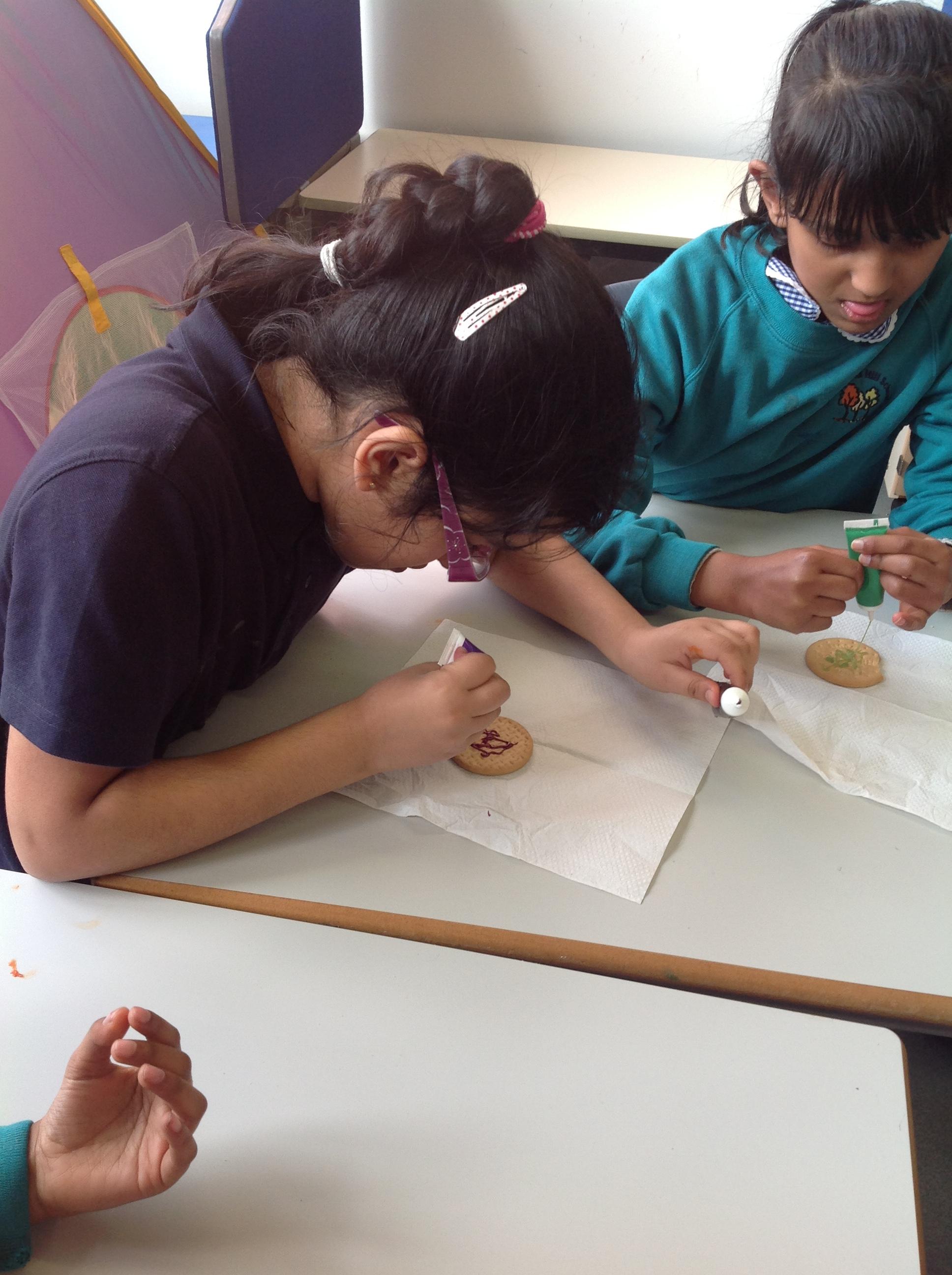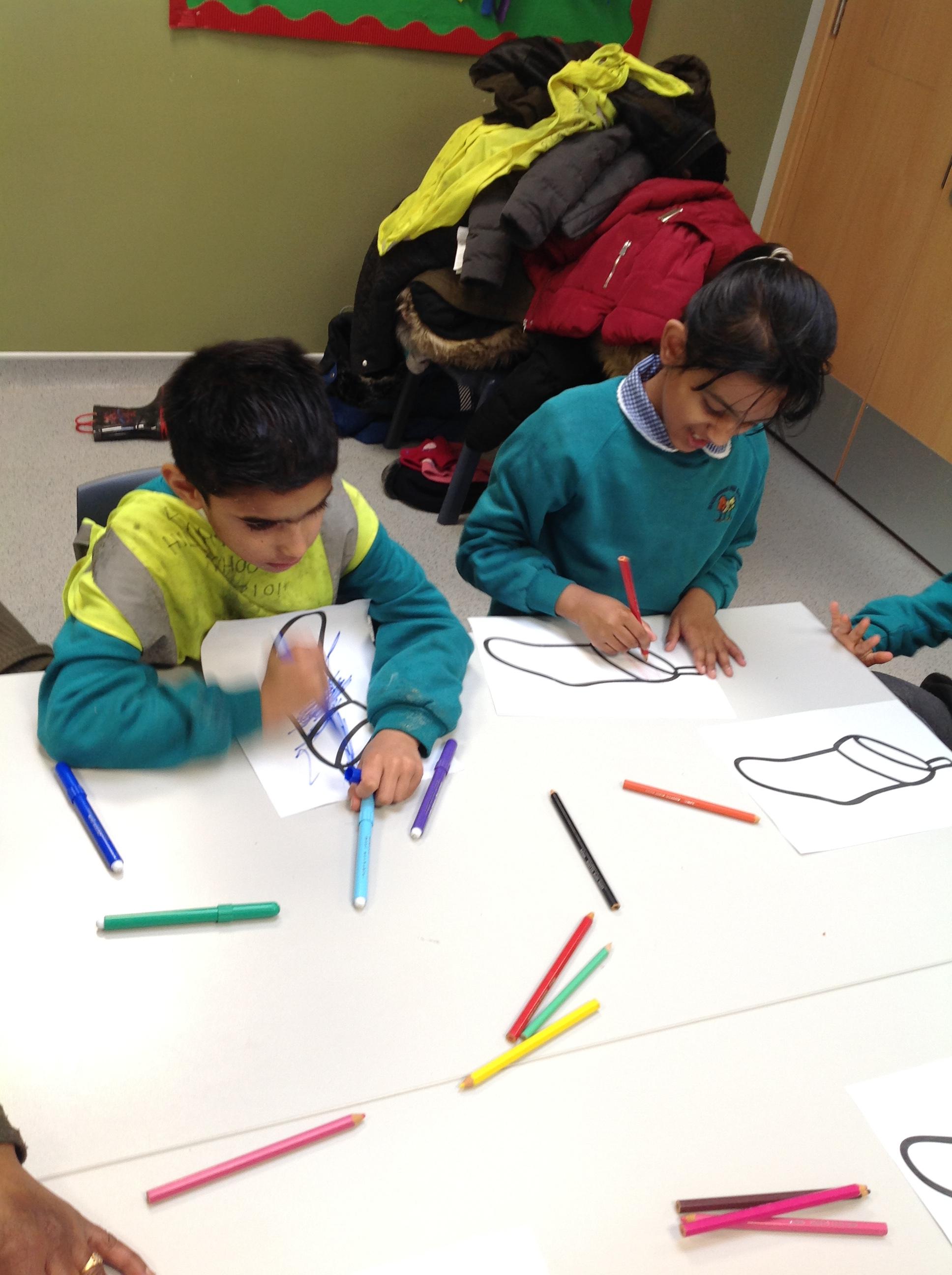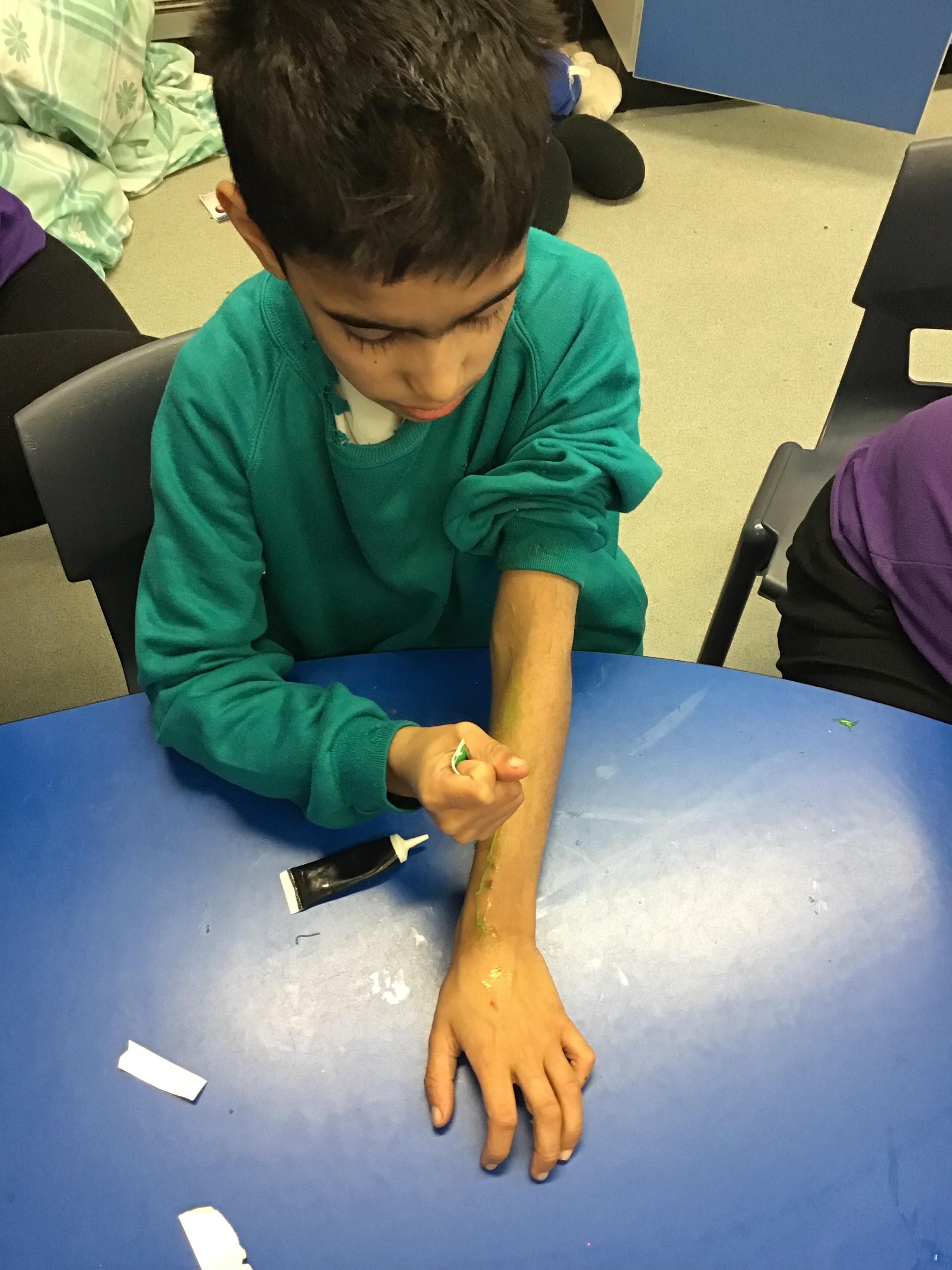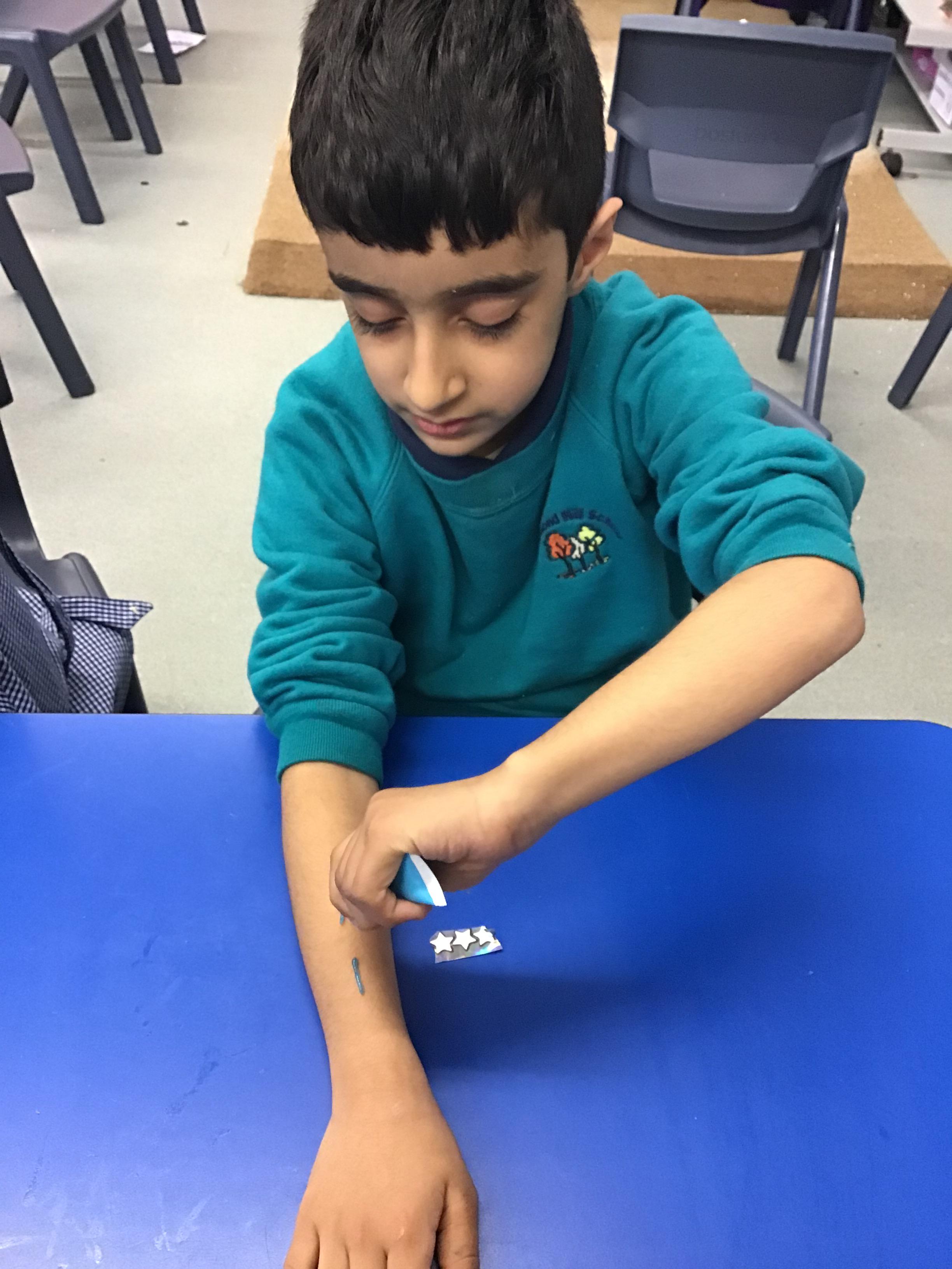 Blue class have been developing their fine motor skills and art skills by applying mehndi/henna to their hands. The children LOVED doing this. They used squeezy icing to apply their patterns to their arms / hands. They had to sit very still to allow it to dry!