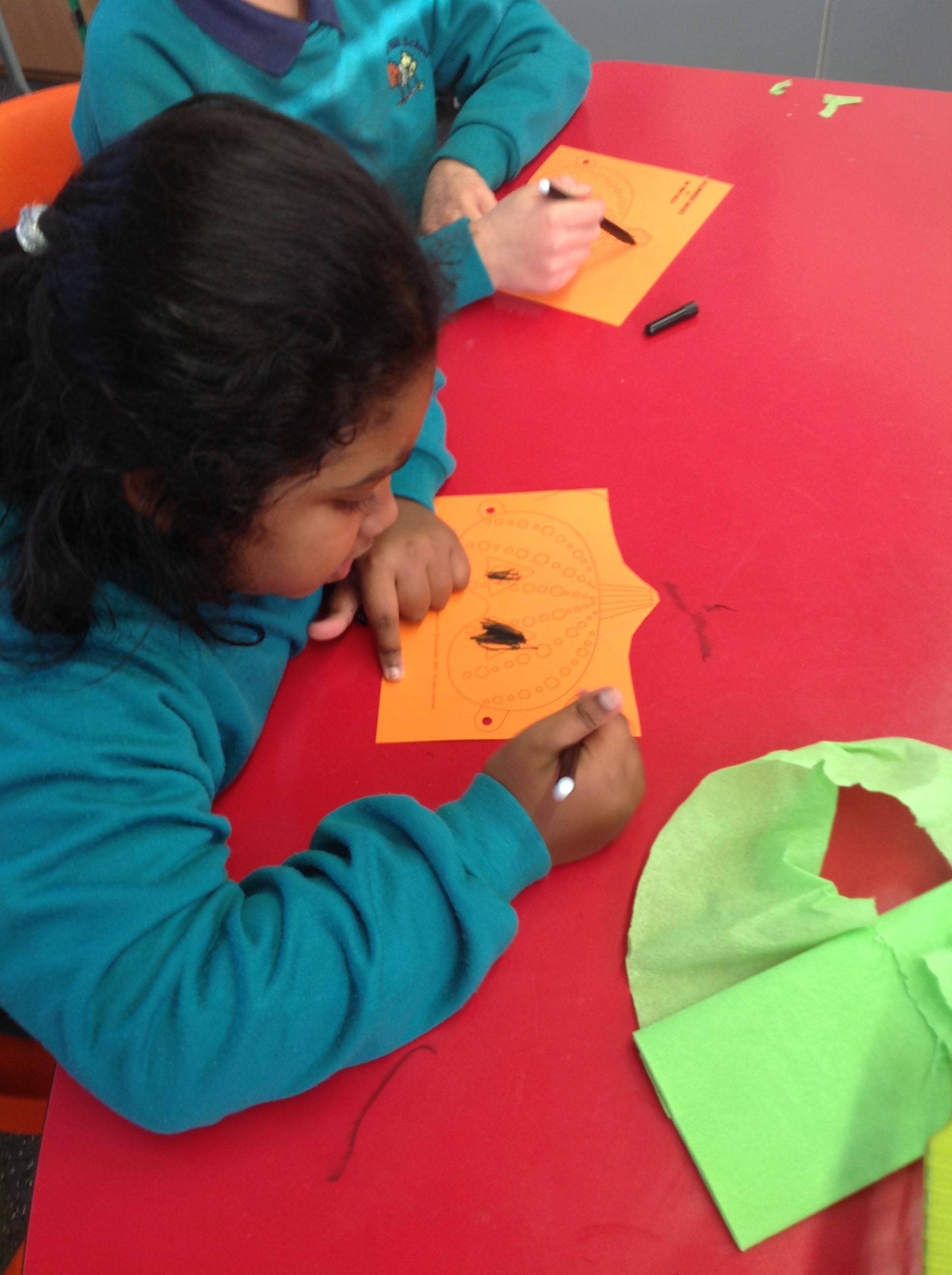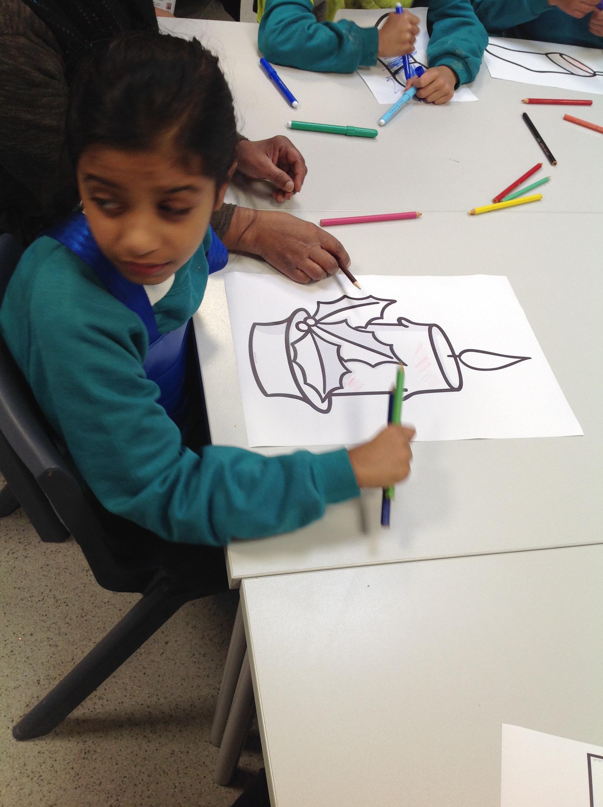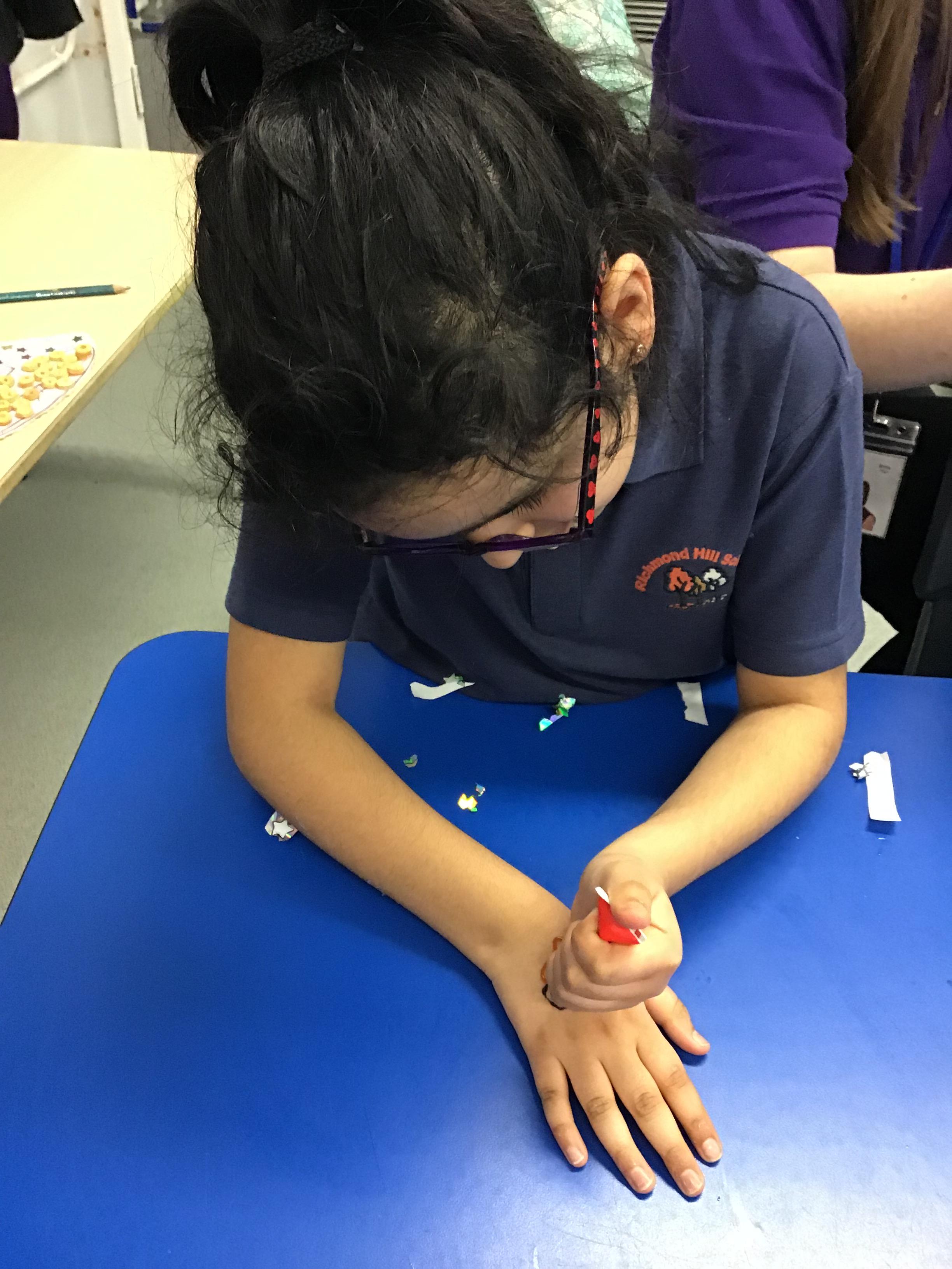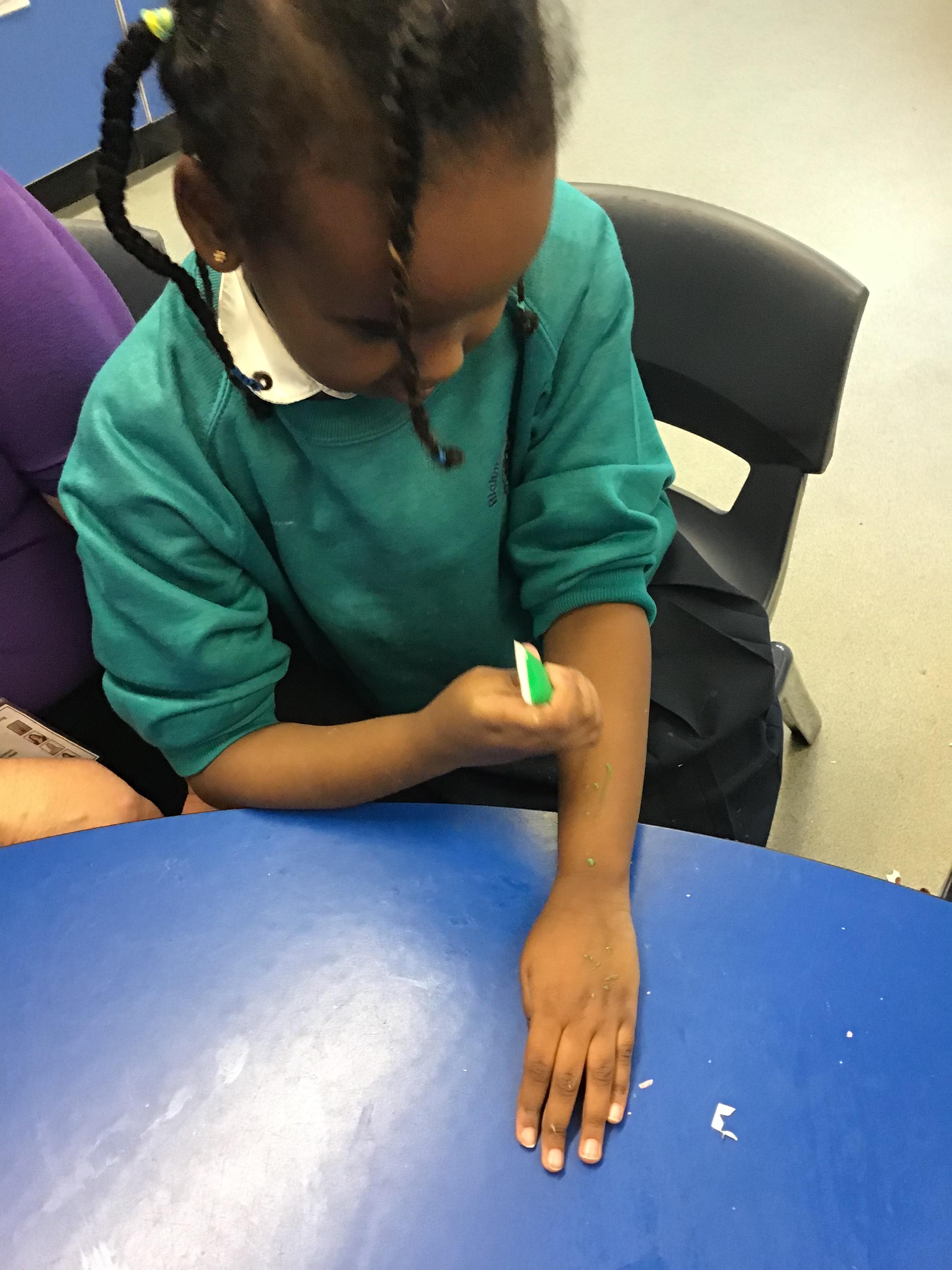 Blue class have been developing their fine motor skills and art skills by applying mehndi/henna to their hands. The children LOVED doing this. They used squeezy icing to apply their patterns to their arms / hands. They had to sit very still to allow it to dry!
