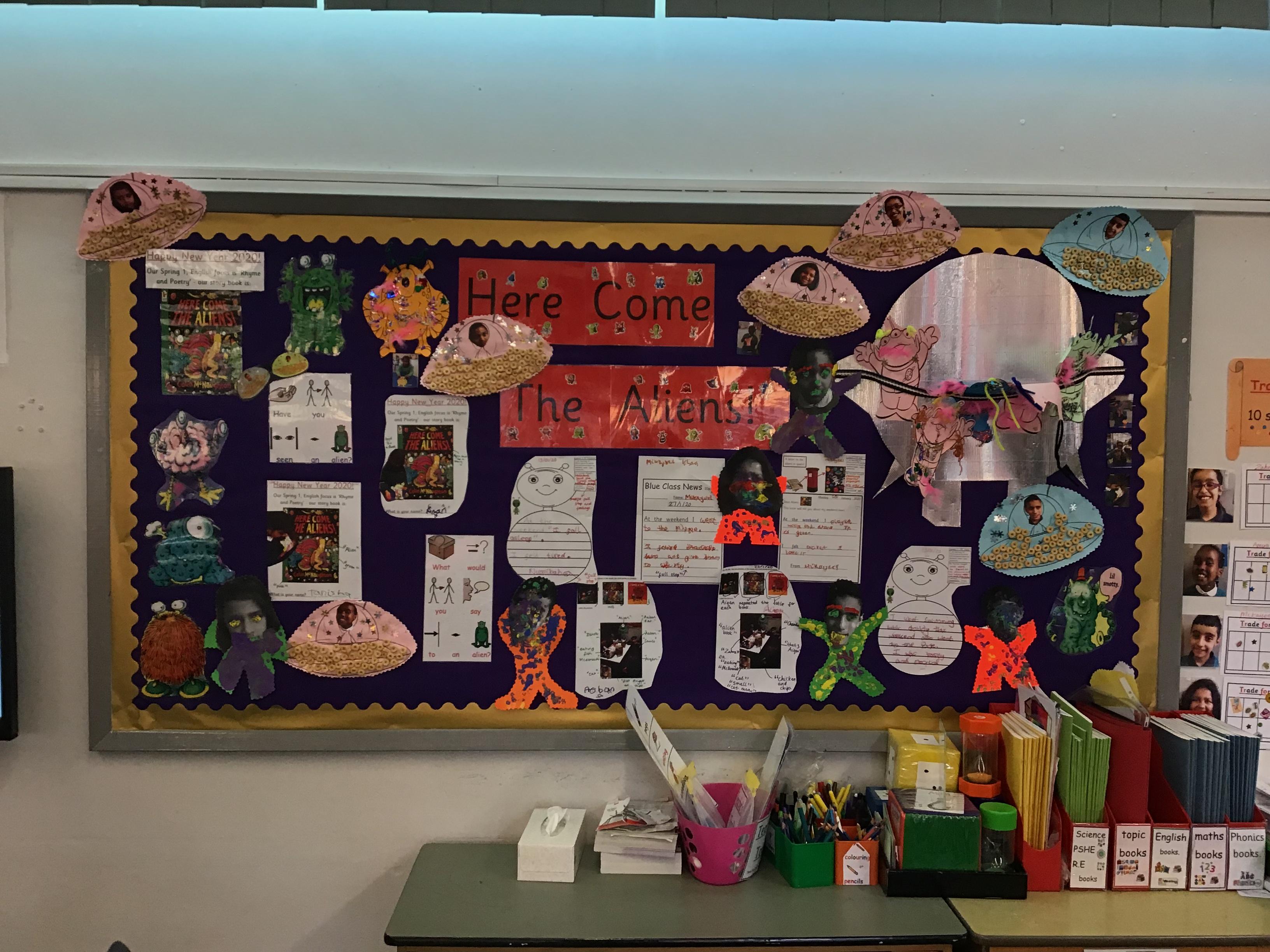 The children already love the rhyming story and love the individual alien characters. Each child created their own alien for our display board.