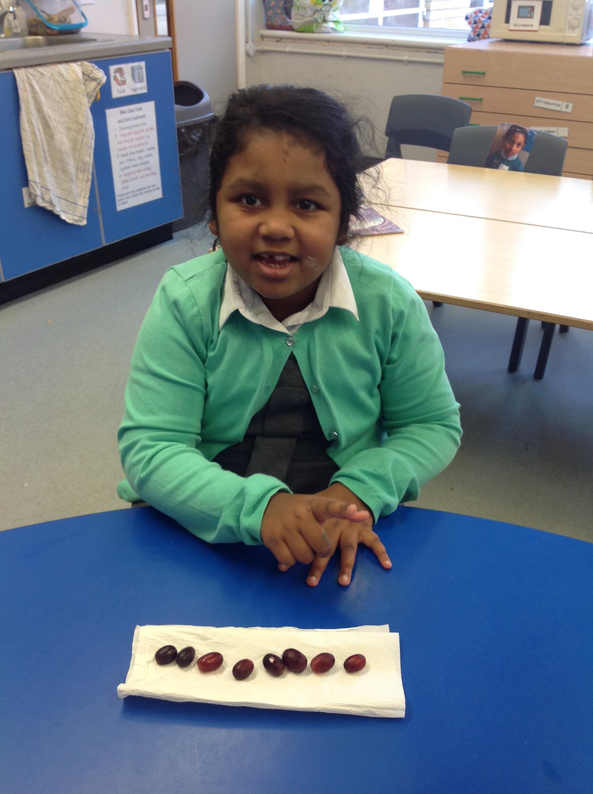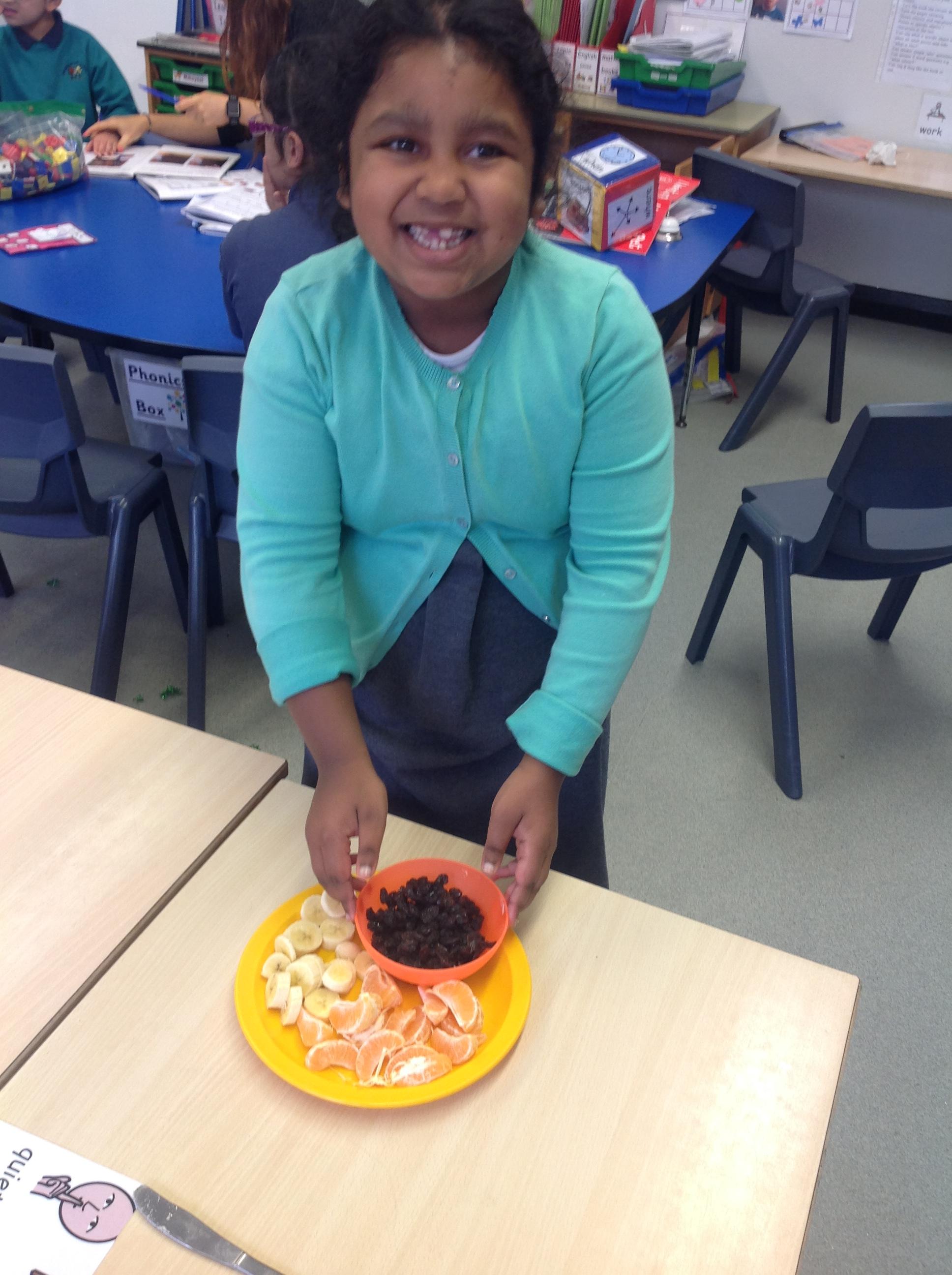 We also prepared our healthy snack and sorted the banana and raisins into two groups.