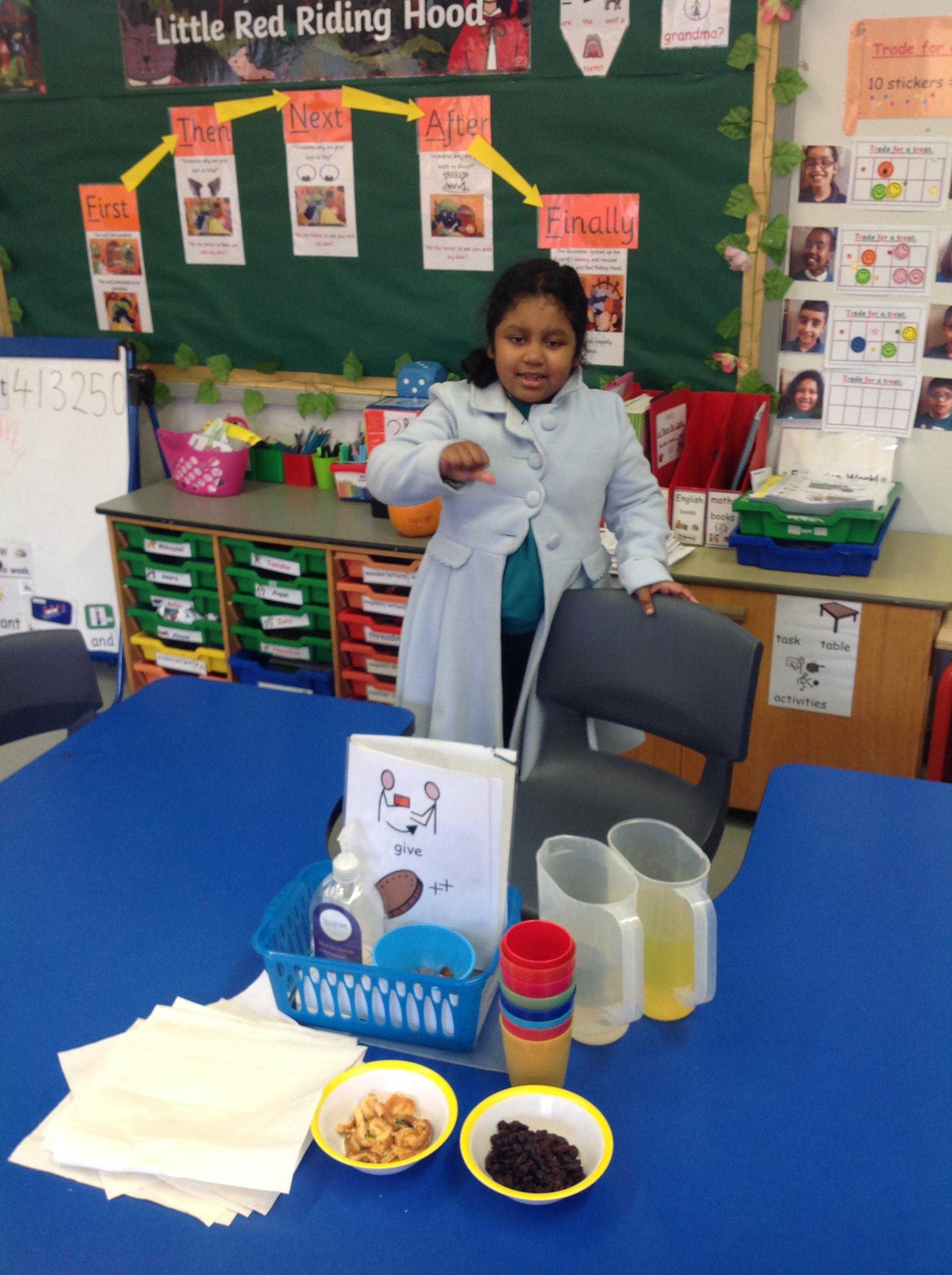 This covers a range of cross curricular targets. Using vocabulary more, less, stop, too much, too little, hot, cold, big cup, small cup, colour names, yes please, no thank you, request language; "I want x please", how many; 3 cups, naming utensils and kitchen equipment.