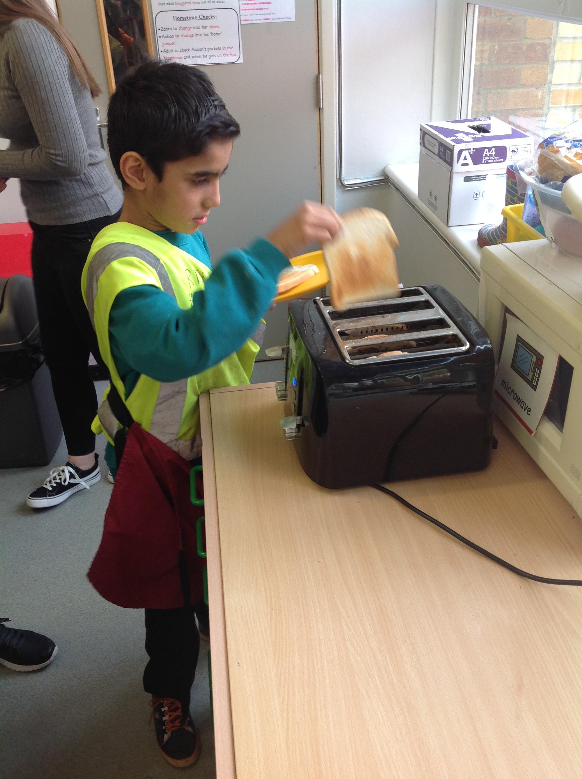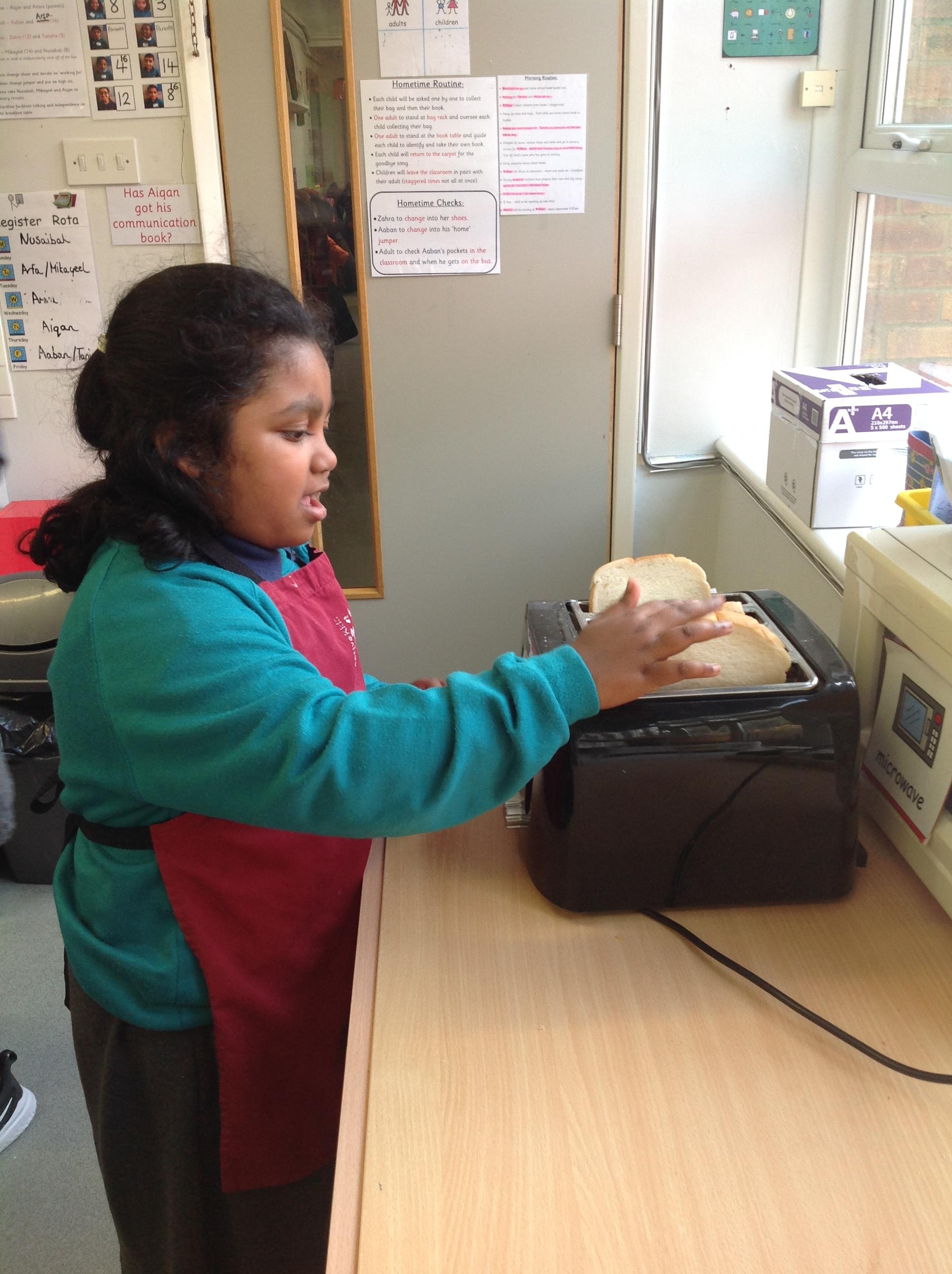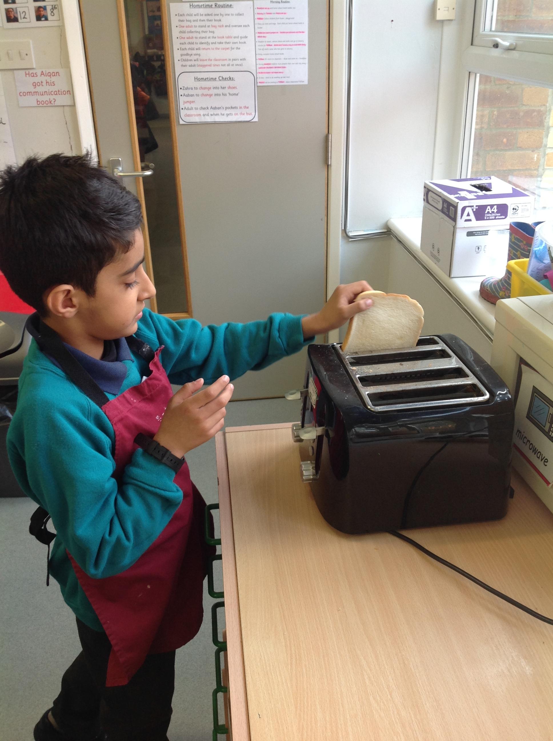As you are doing this, ask what goes in the toaster, what comes out, is it hot, is it cold, what colour is it, is it hard, is it soft, has it changed, which parts are dangerous, which equipment do they need, where are these kept? Make sure they tidy up and wash up themselves afterwards!