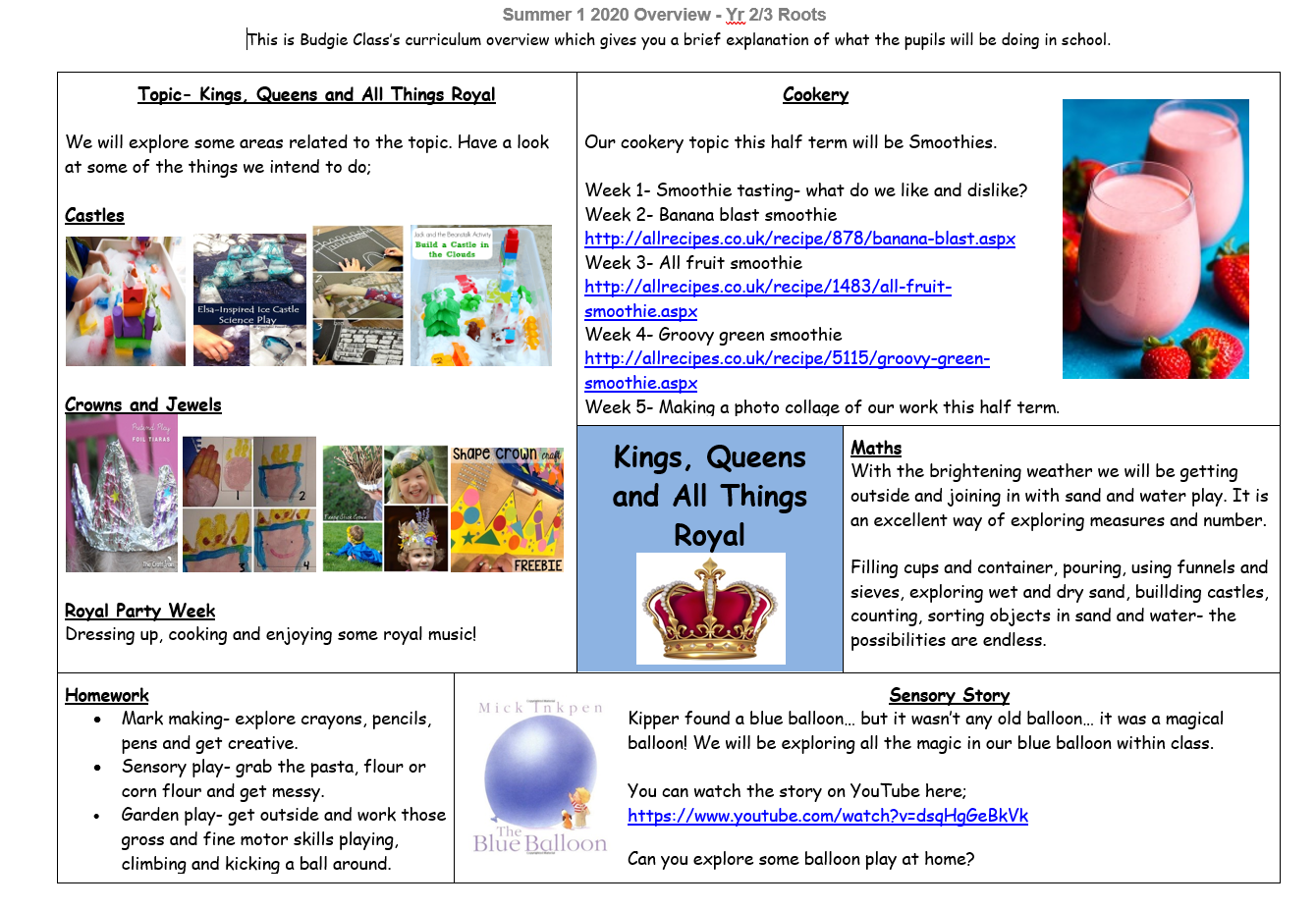 Such a shame we cannot be together to start our new topic, ‘Kings, queens and all things royal’. I hope you are getting lots of opportunities to play and explore at home. On the curriculum map this half term I have tried to be more detailed on what we would be doing in school so you can use these ideas at home. Lots of sensory castle play ideas, making crowns and food exploration.