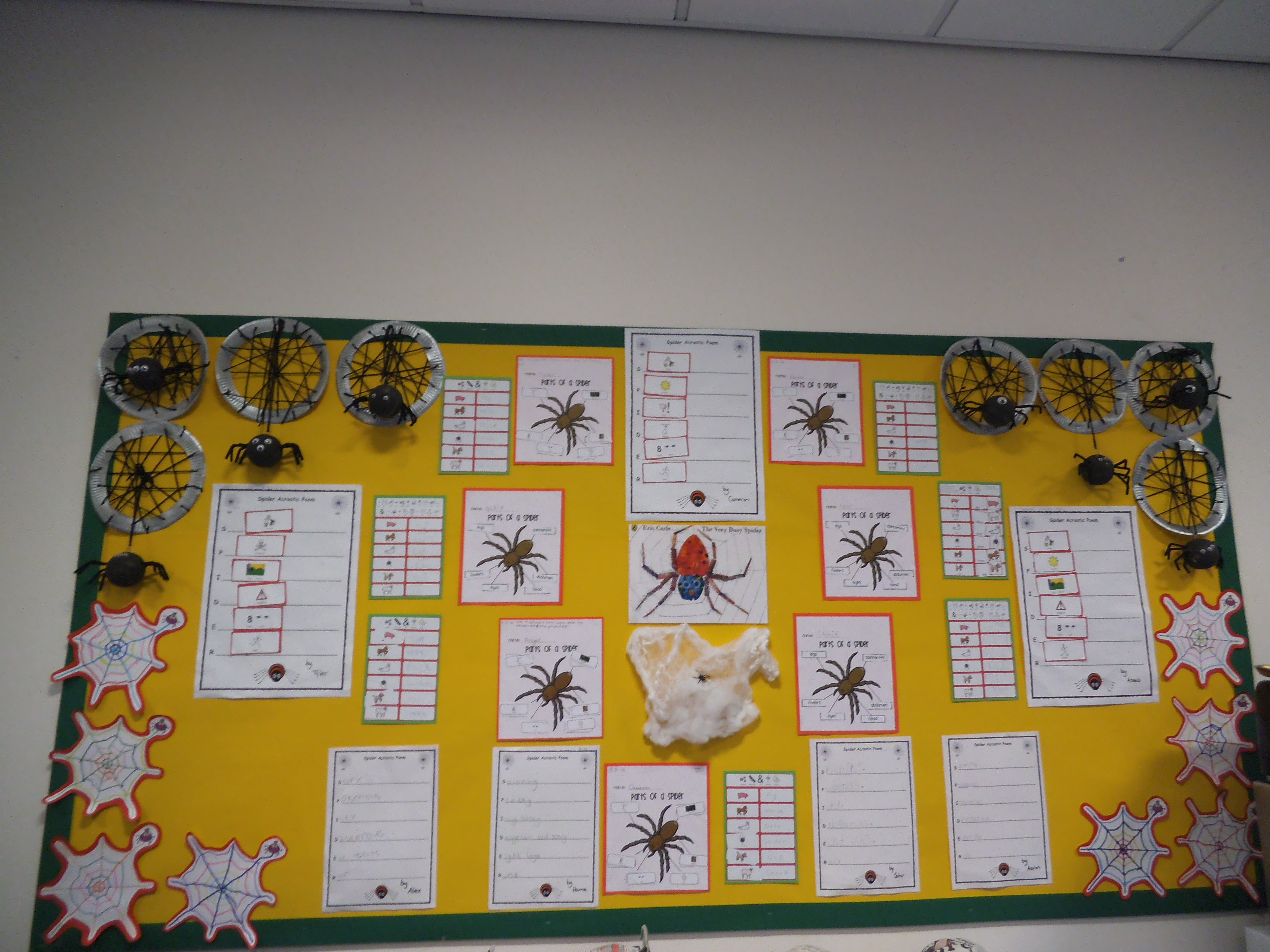 After this we focused on non-fiction information books about spiders.The children learnt about the body parts of a spider and labelled a diagram. As a class we created an information tree with everything they had learned about spiders and used this to write information sheets.