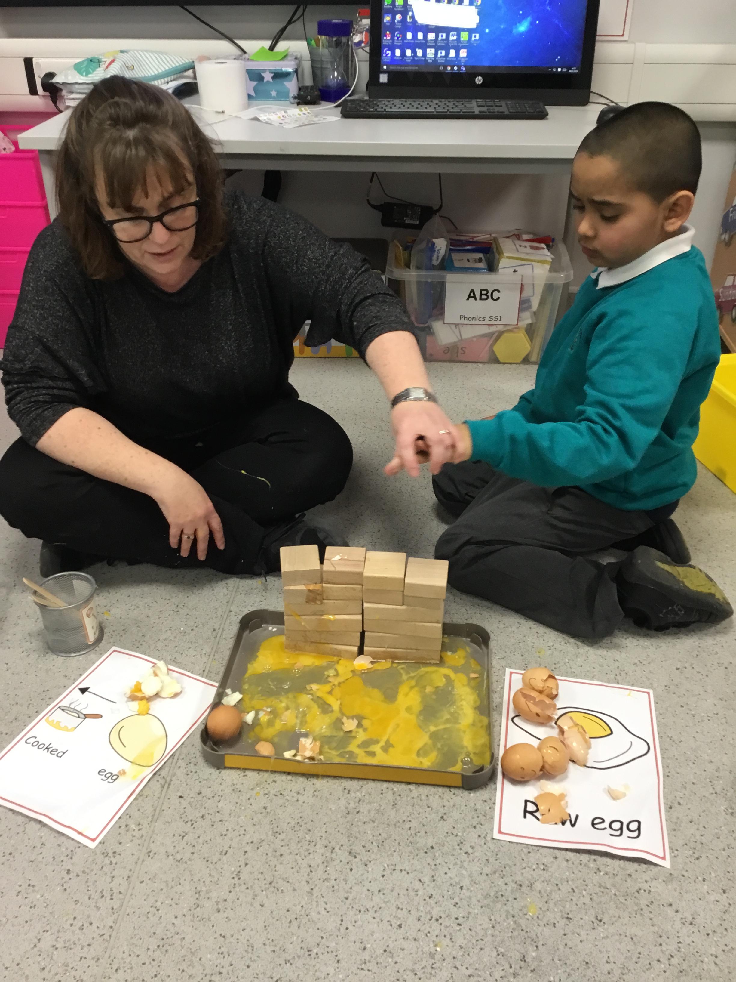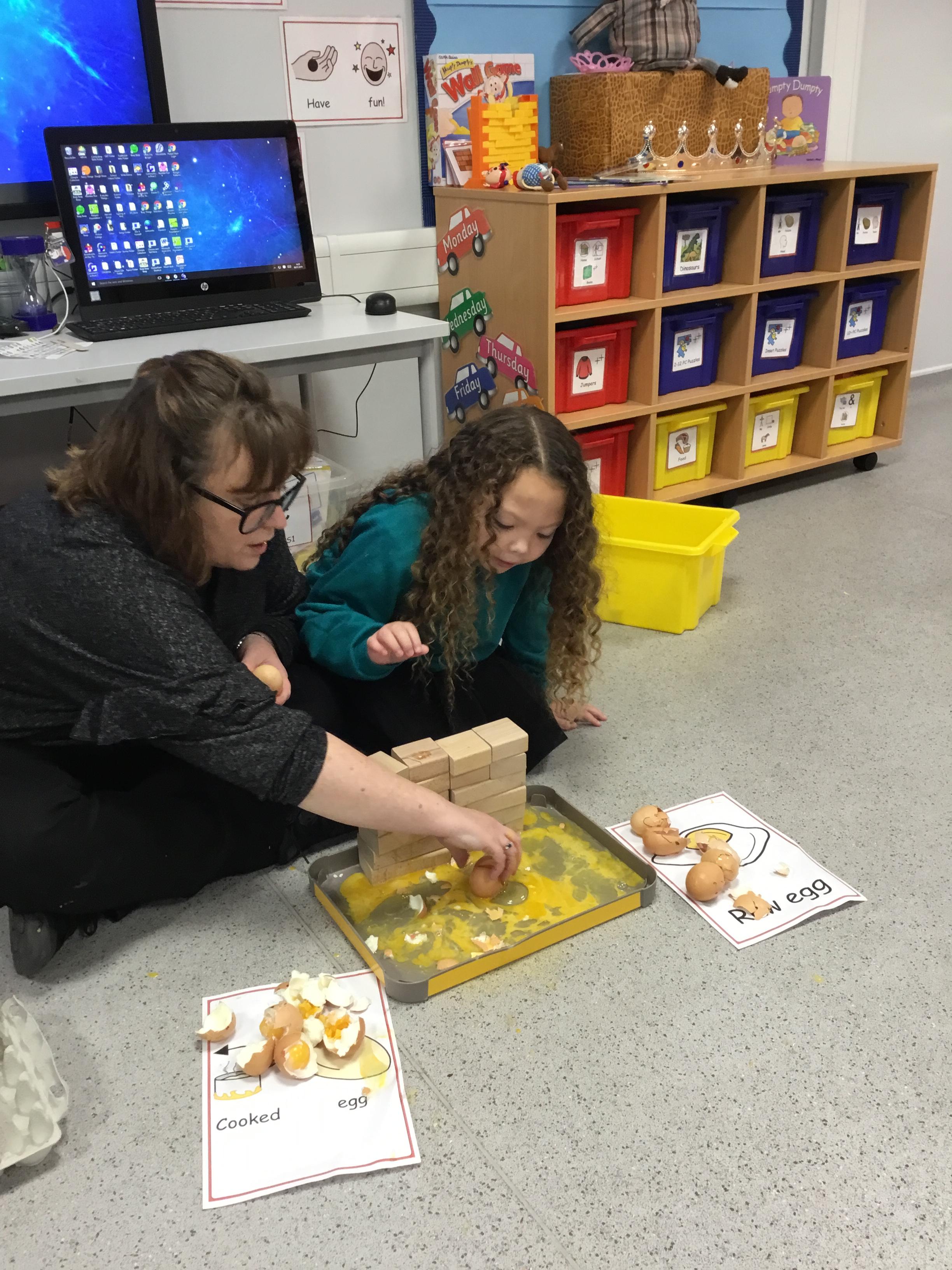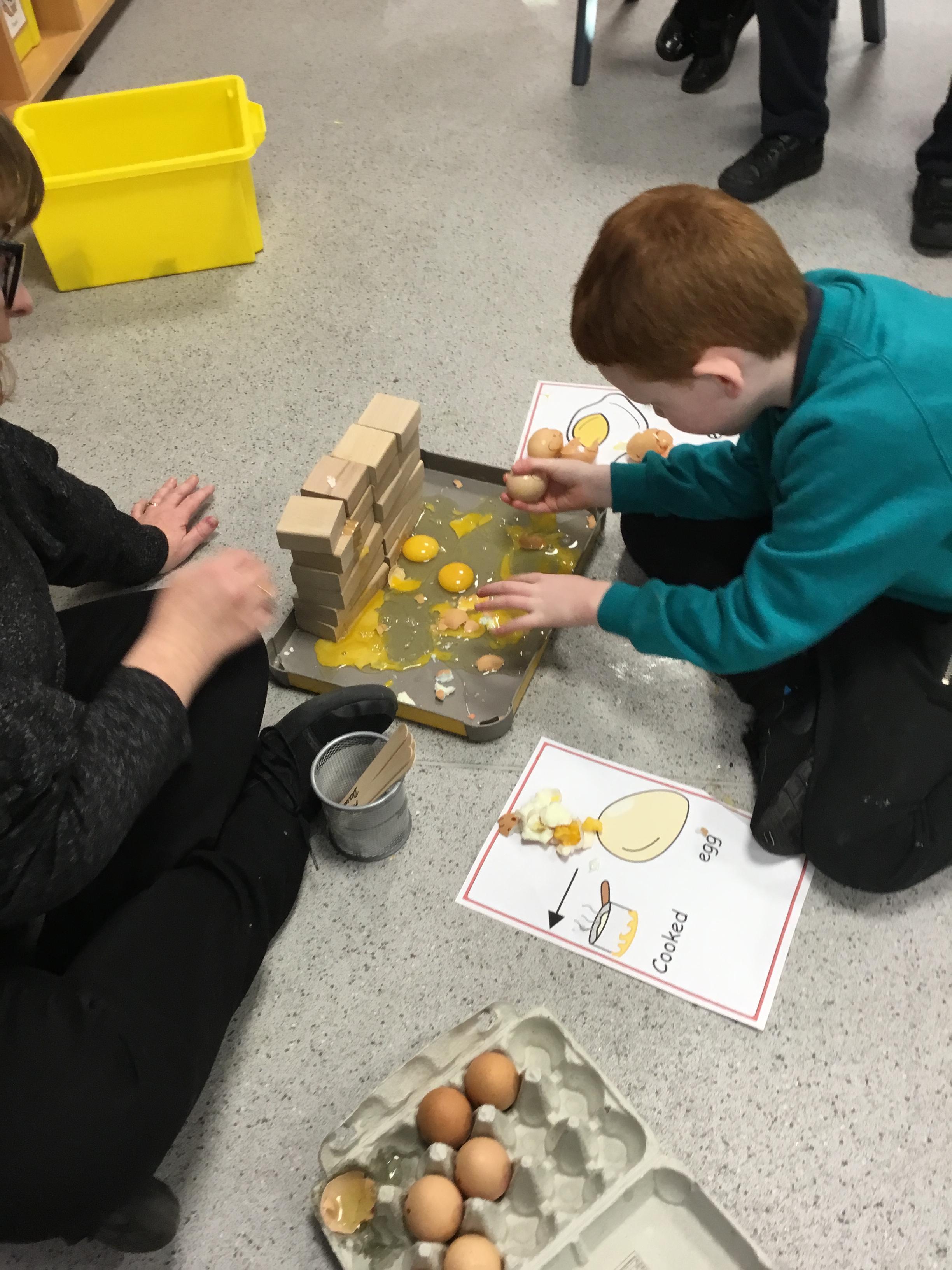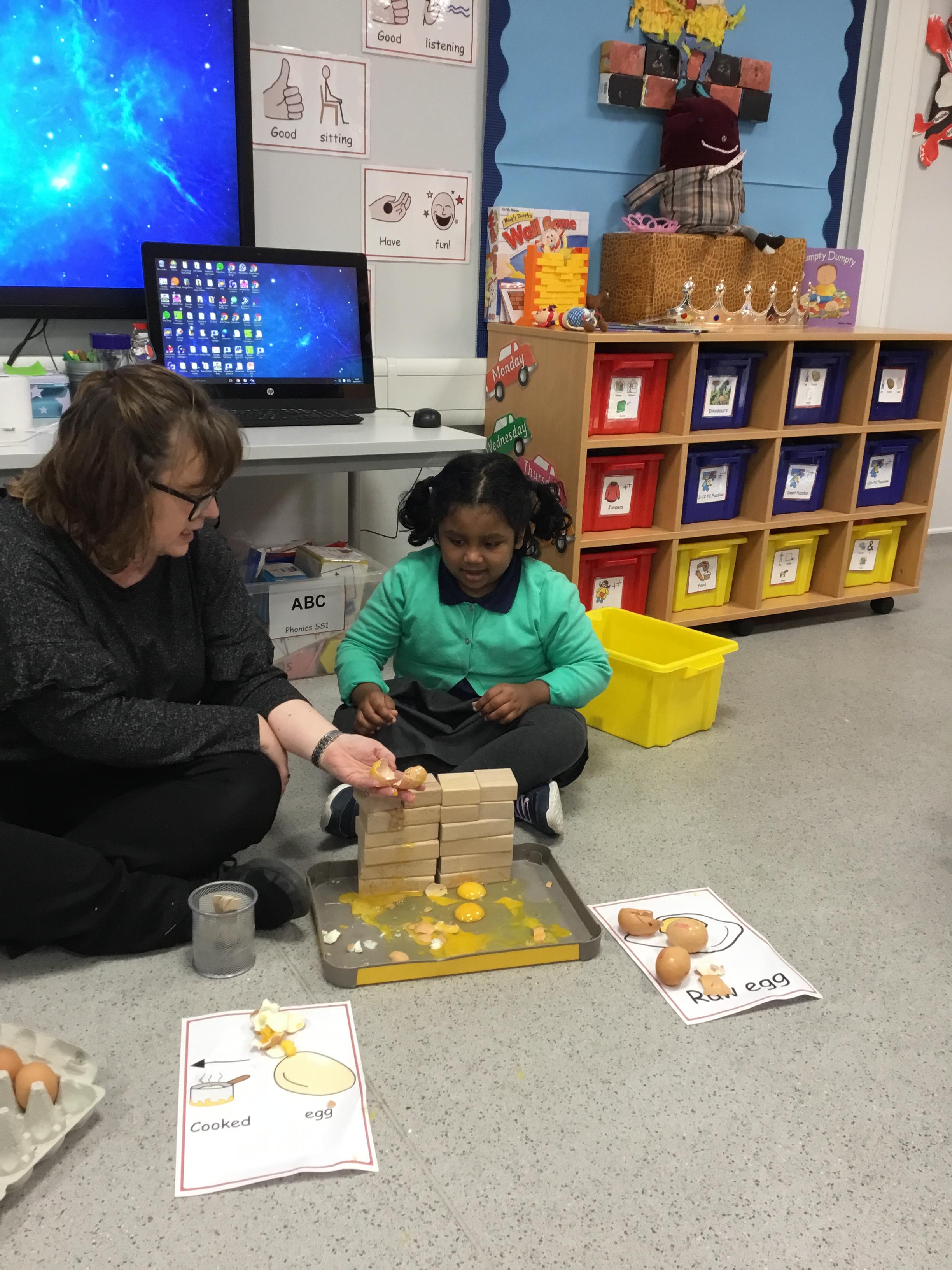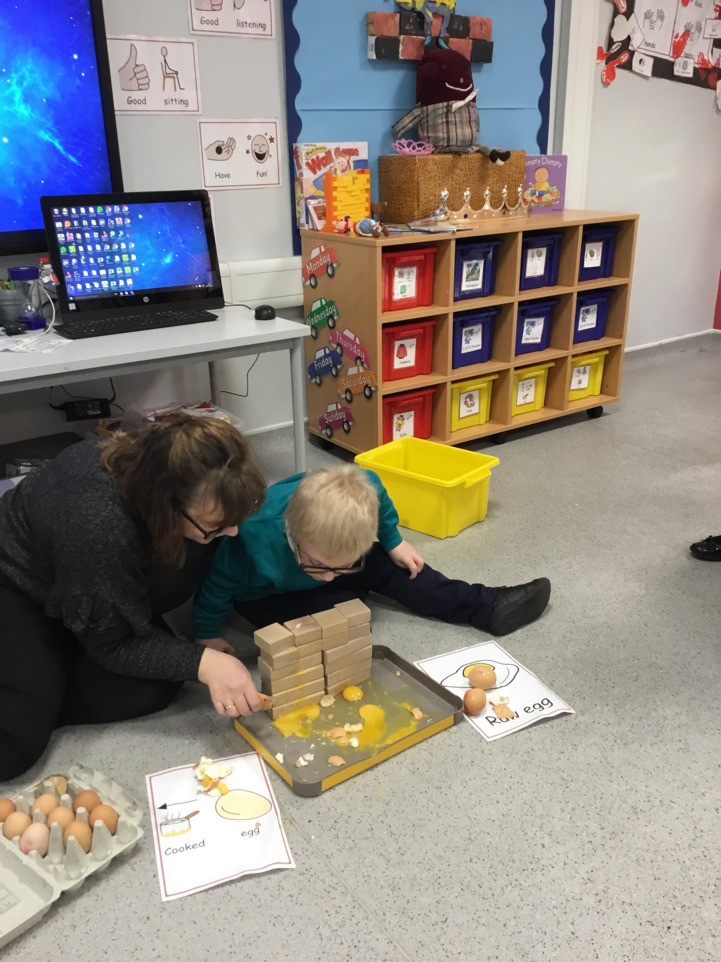 This week we welcomed a new child to our class Jake who has settled really well, its like he has always been with us. We've had a busy few days starting Humpty Dumpty, we had the most fun in Science this week which was linked to Humpty Dumpty. In the lesson we threw eggs off the wall and sang the nursery rhyme, I had sneakily cooked some of the eggs before the lesson and the children had to see if they had a raw egg or a cooked egg when it fell off the wall. The photos are below.