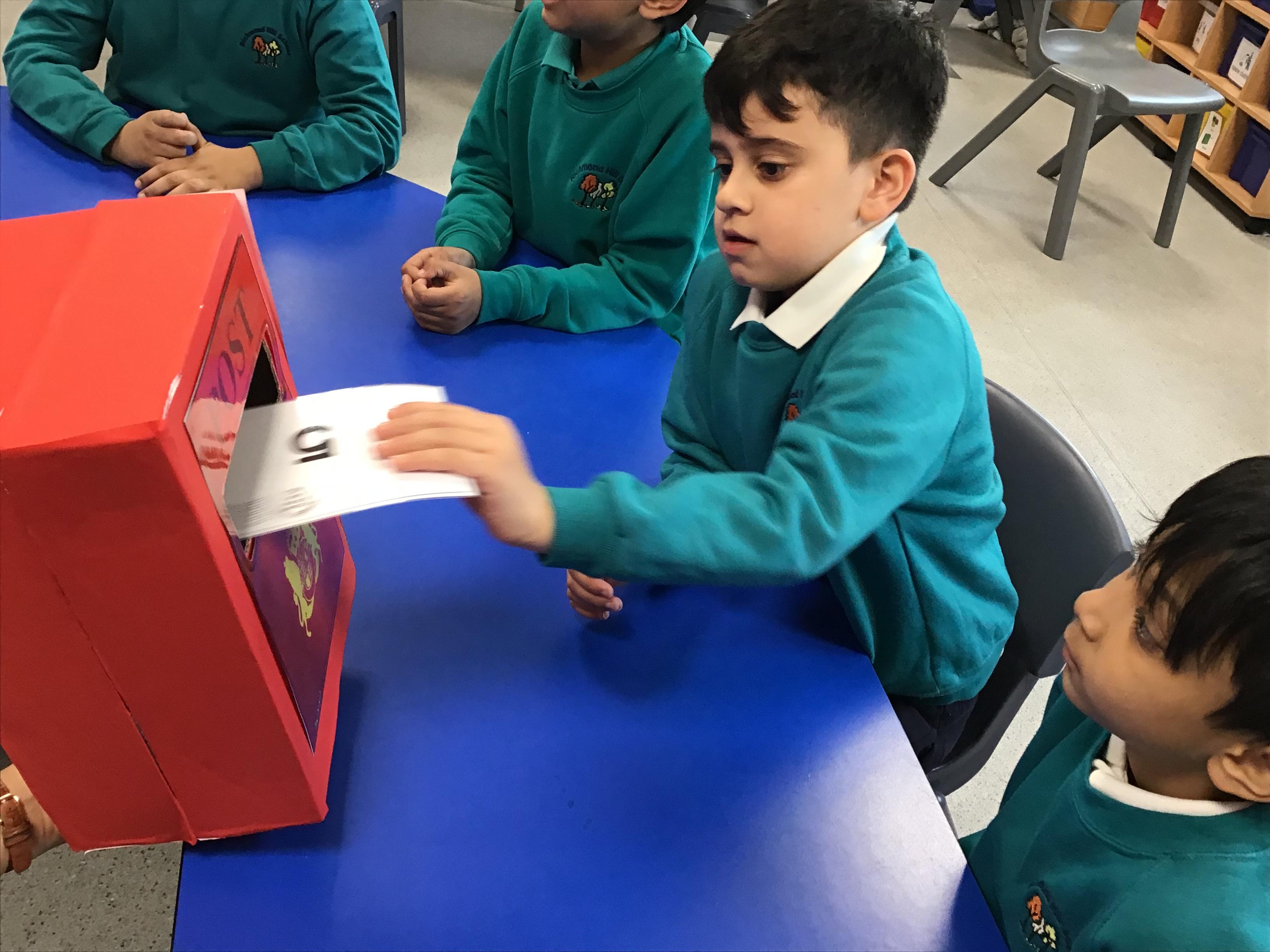 In Maths, we have been practising positional language. We used a postbox to post letters 'in' and take letters 'out'.