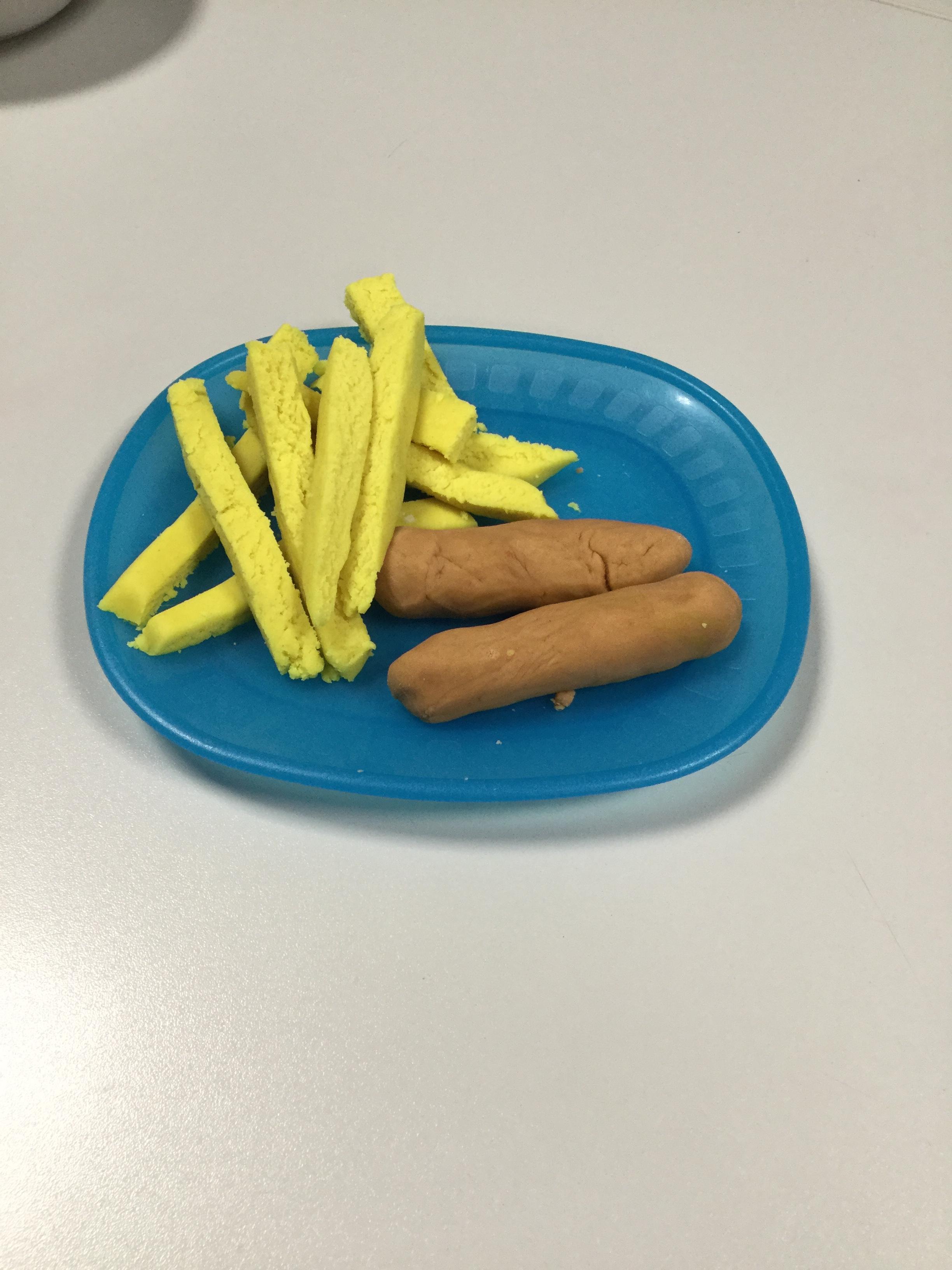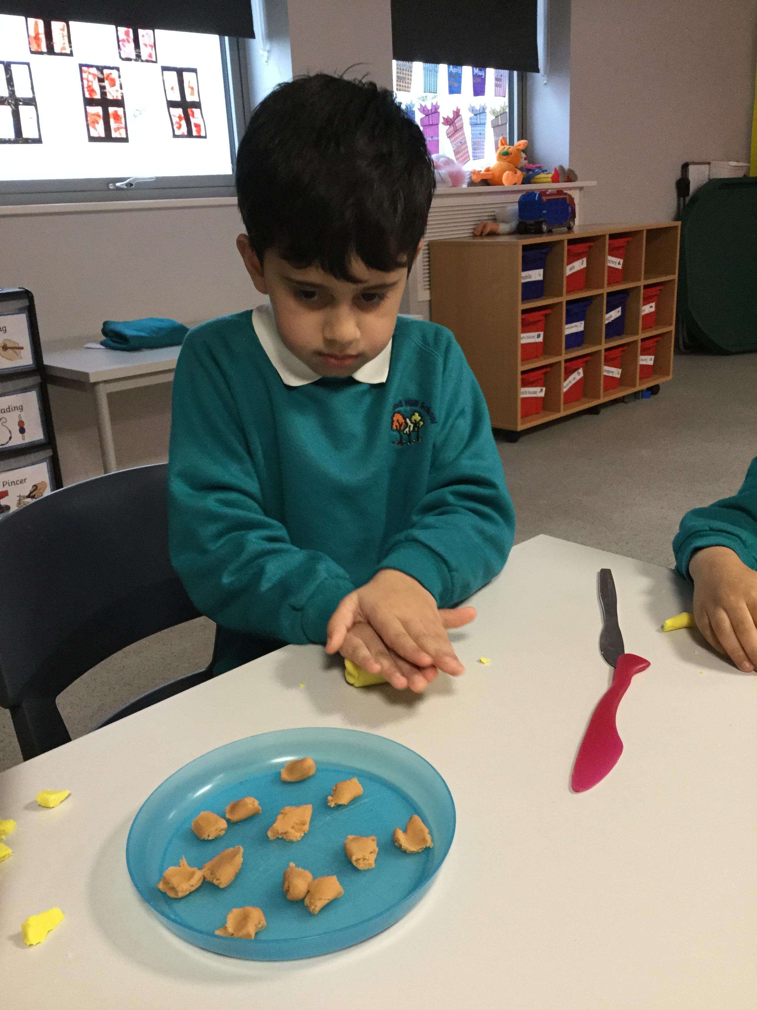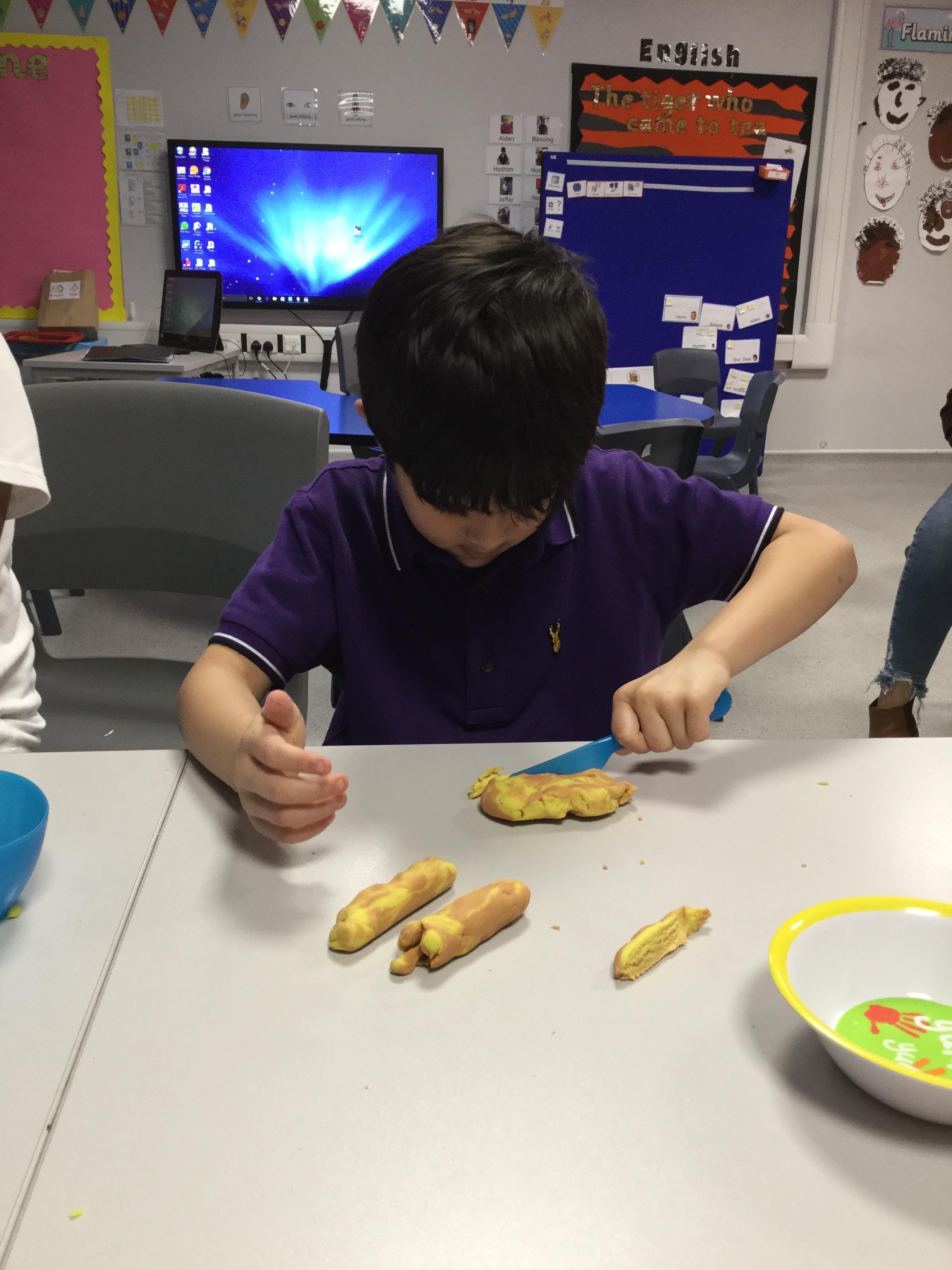 In our story ' The Tiger Who Came to Tea' Sophie and her Mummy and Daddy go to a cafe to have sausages and chips. We practised our fine motor skills when making sausage and chips with our own homemade playdough.