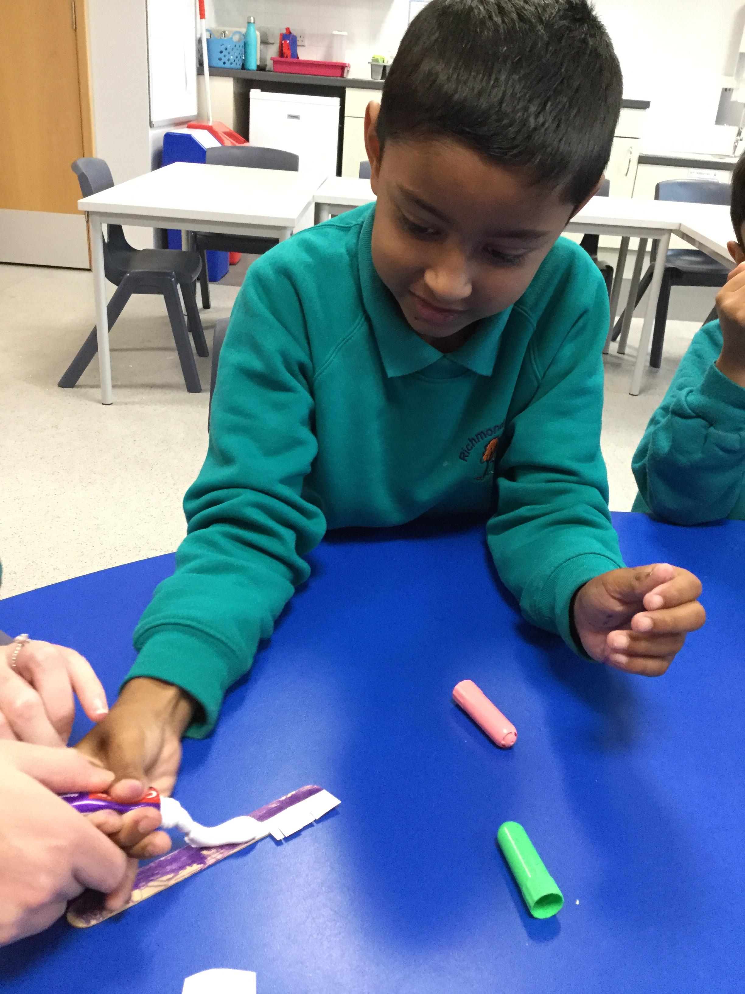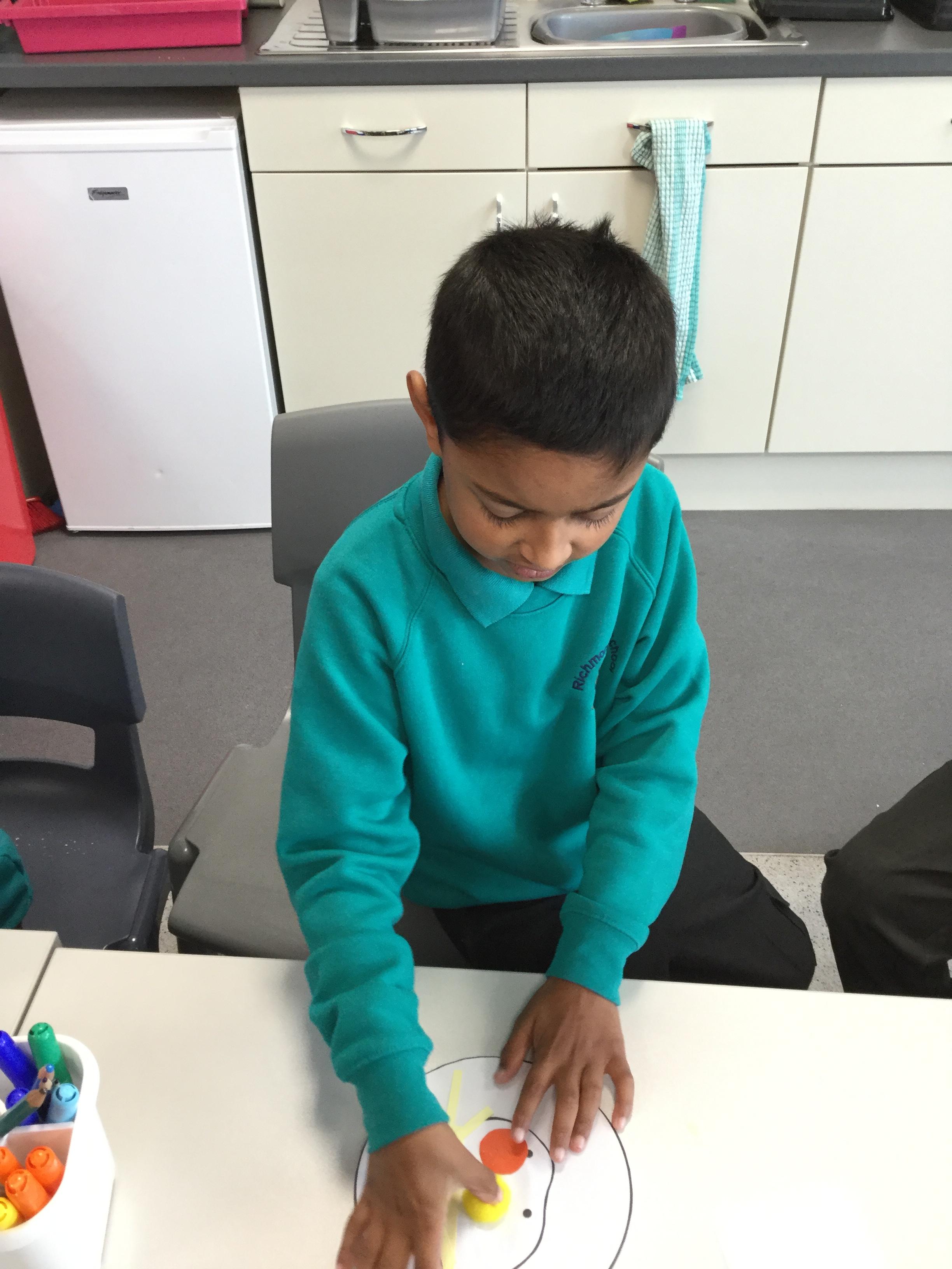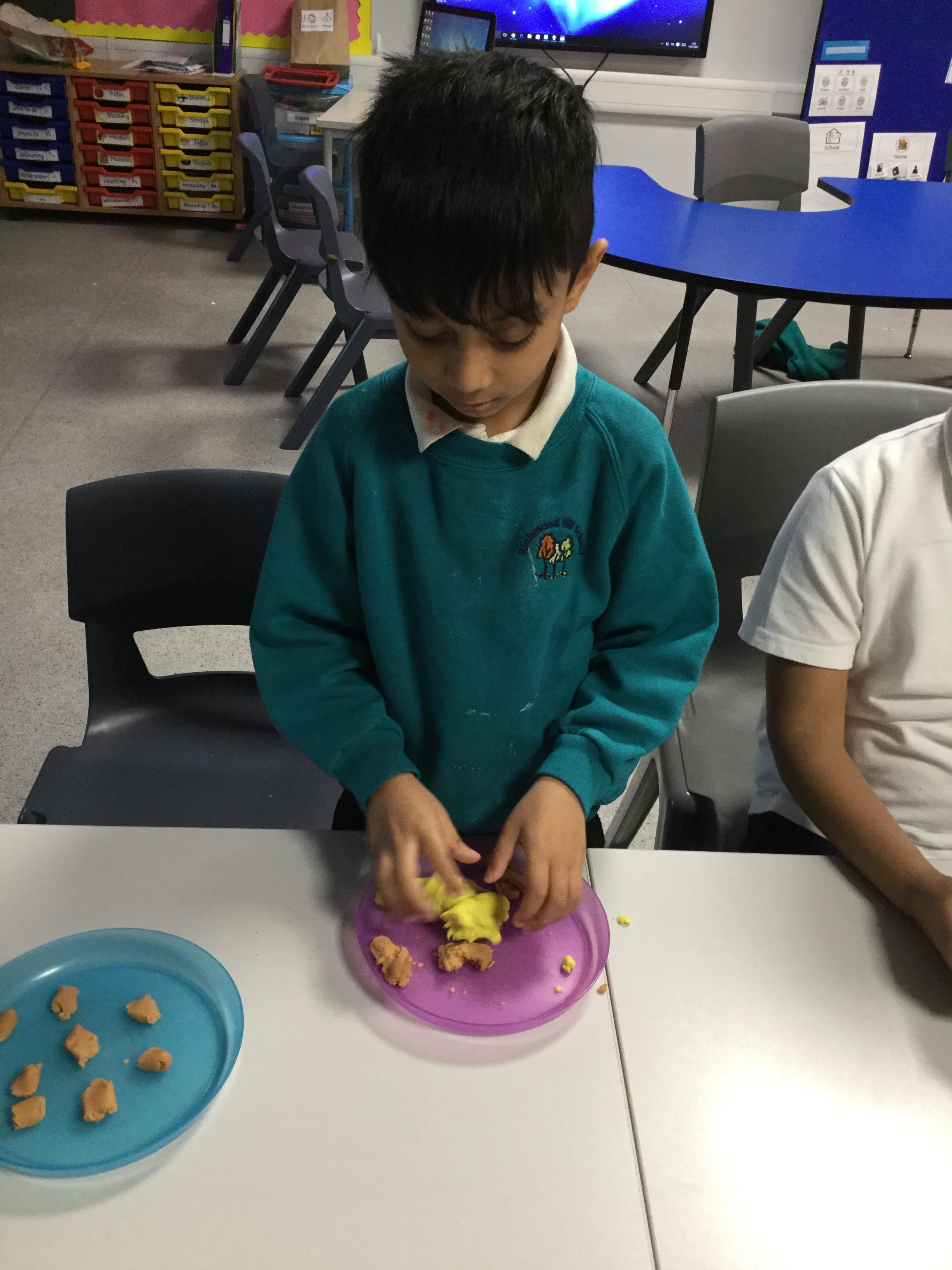 In our story ' The Tiger Who Came to Tea' Sophie and her Mummy and Daddy go to a cafe to have sausages and chips. We practised our fine motor skills when making sausage and chips with our own homemade playdough.