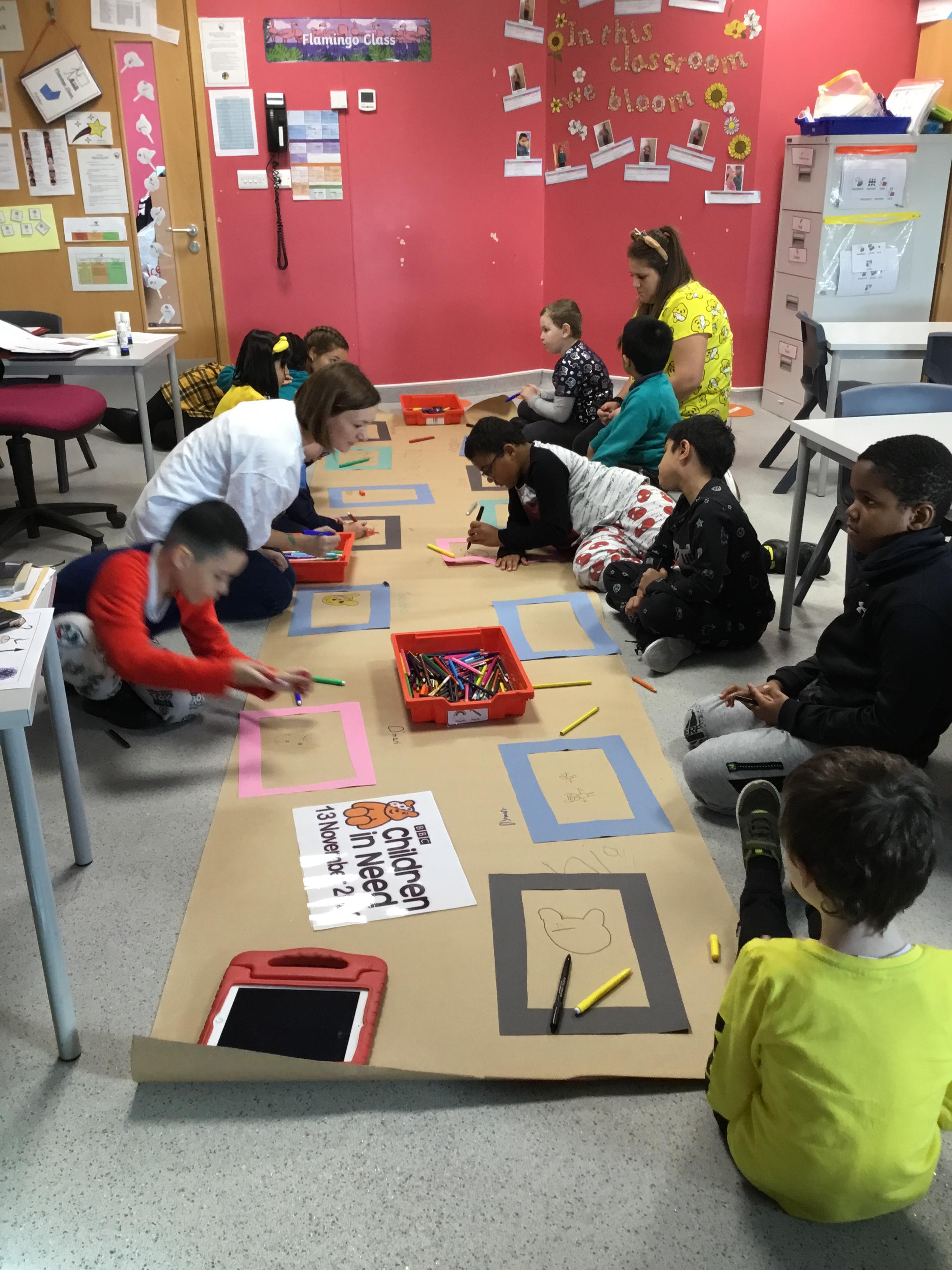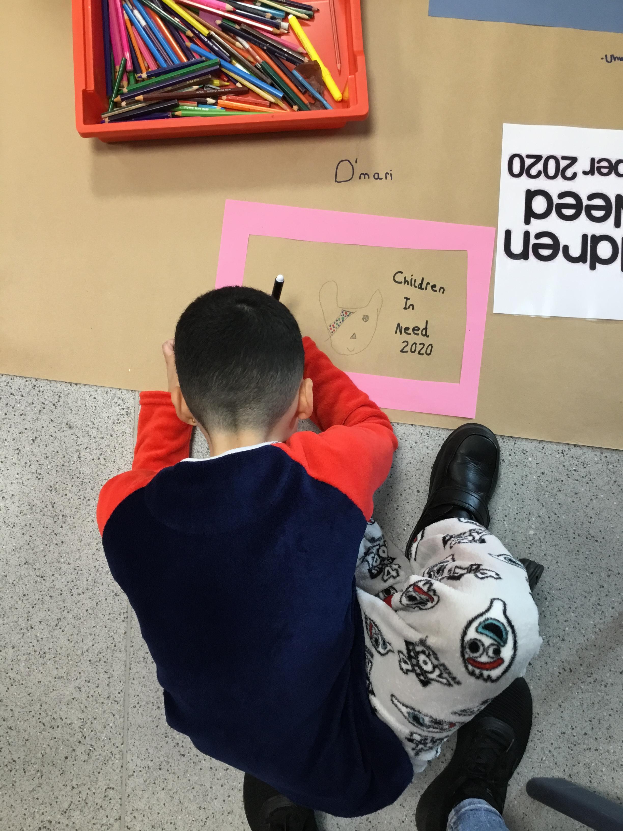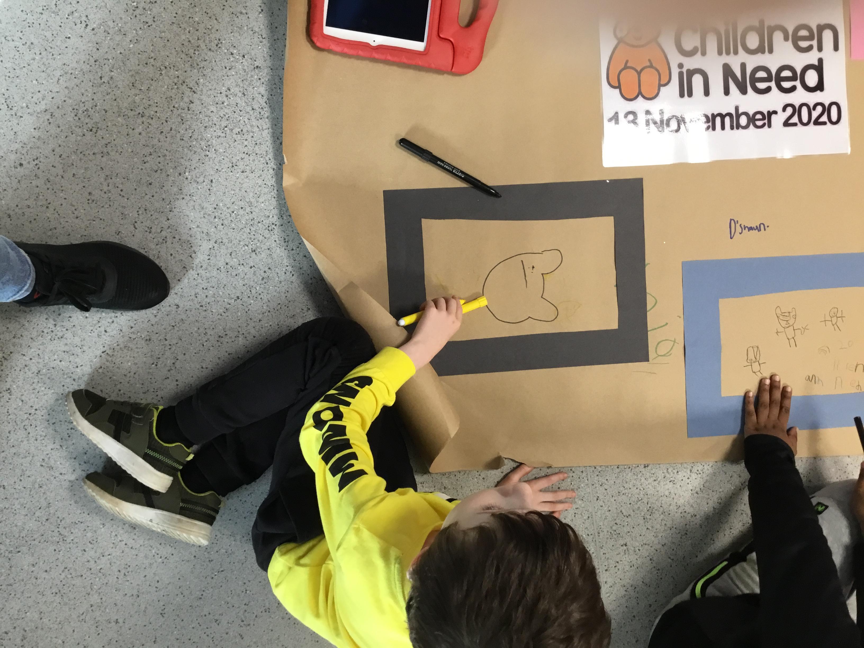 We have celebrated children in need this year by of course dressing up but in class we did a collaborative art piece. The children loved drawing Pudsey Bear and used their fine motor skills and social interaction skills, as we had conversations about what we were drawing, what colours we were using etc.