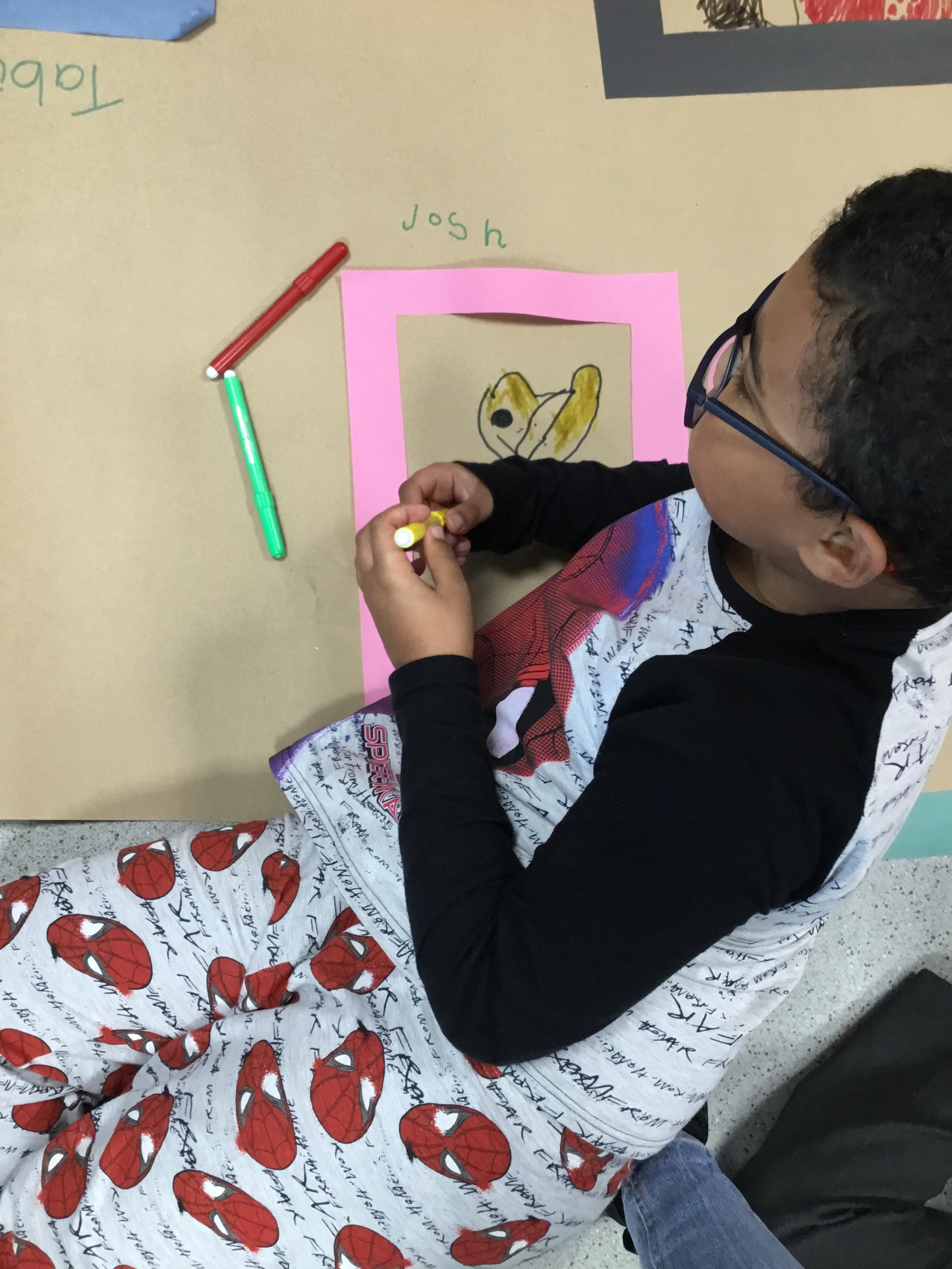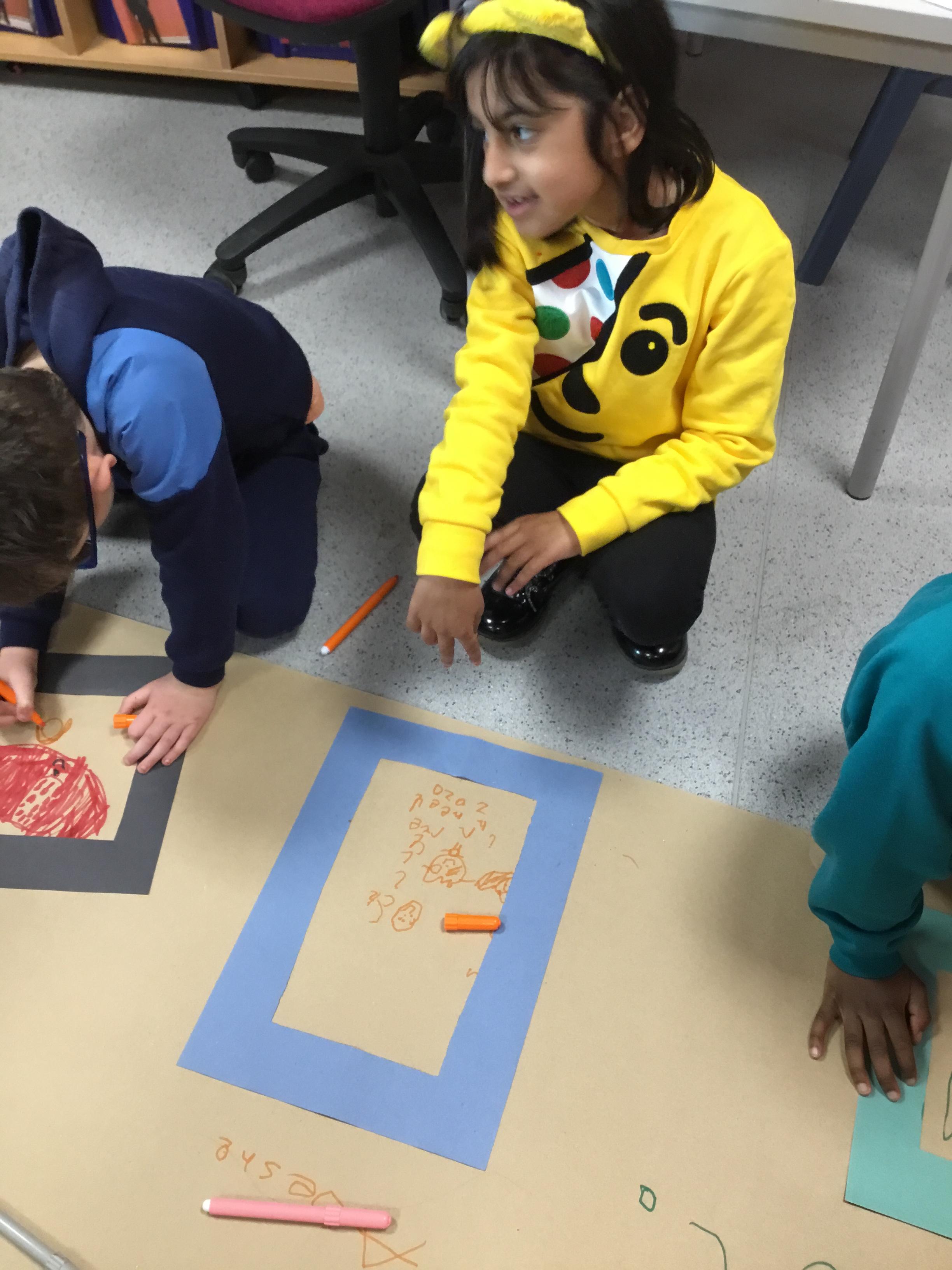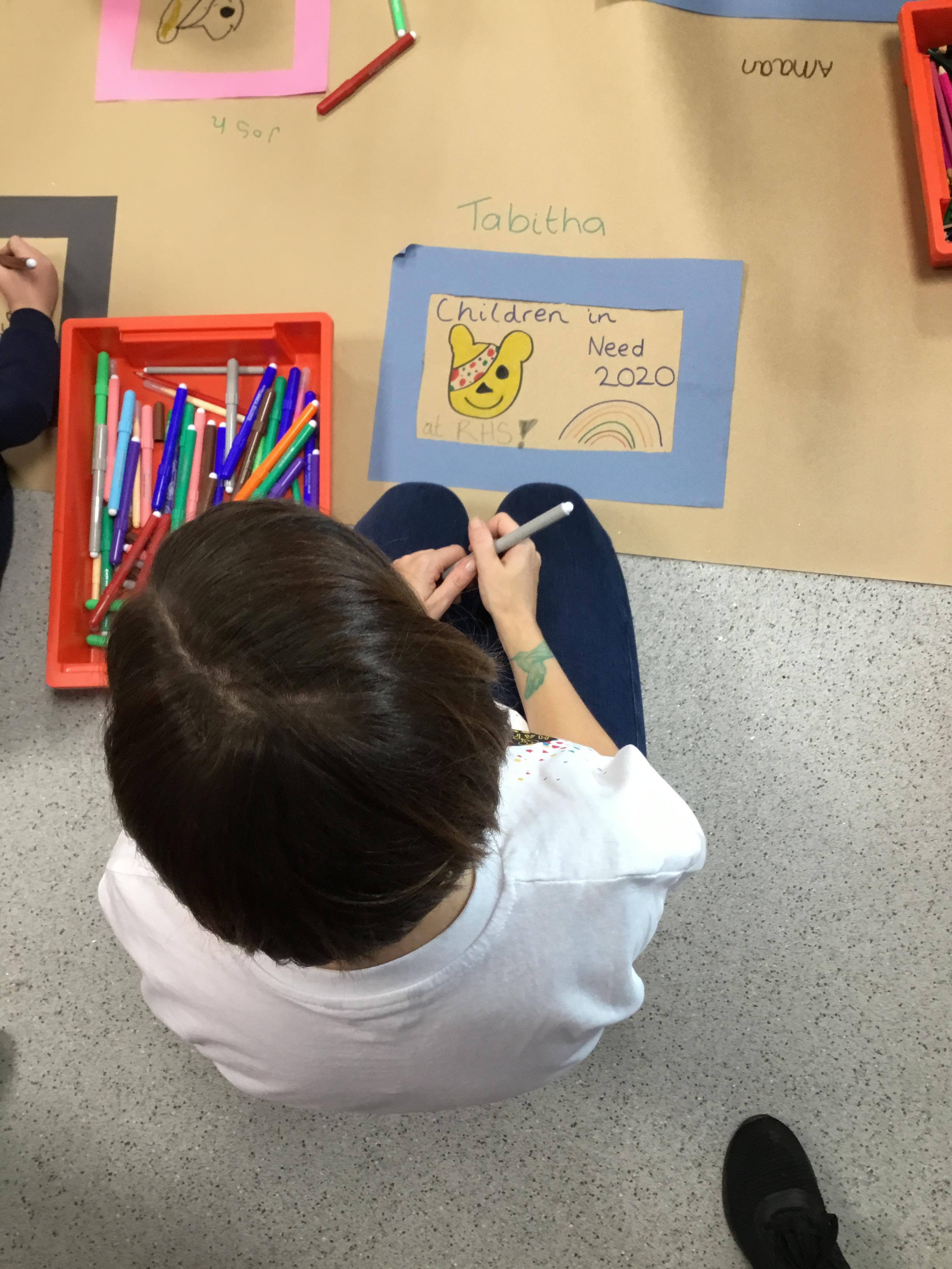 We have celebrated children in need this year by of course dressing up but in class we did a collaborative art piece. The children loved drawing Pudsey Bear and used their fine motor skills and social interaction skills, as we had conversations about what we were drawing, what colours we were using etc.