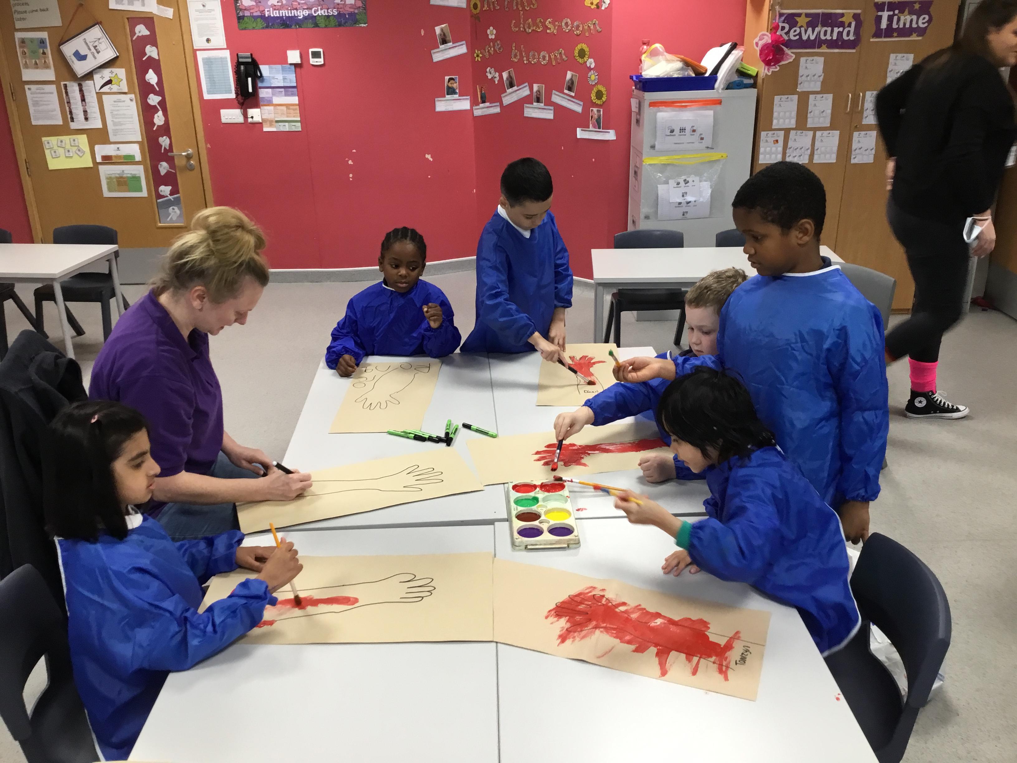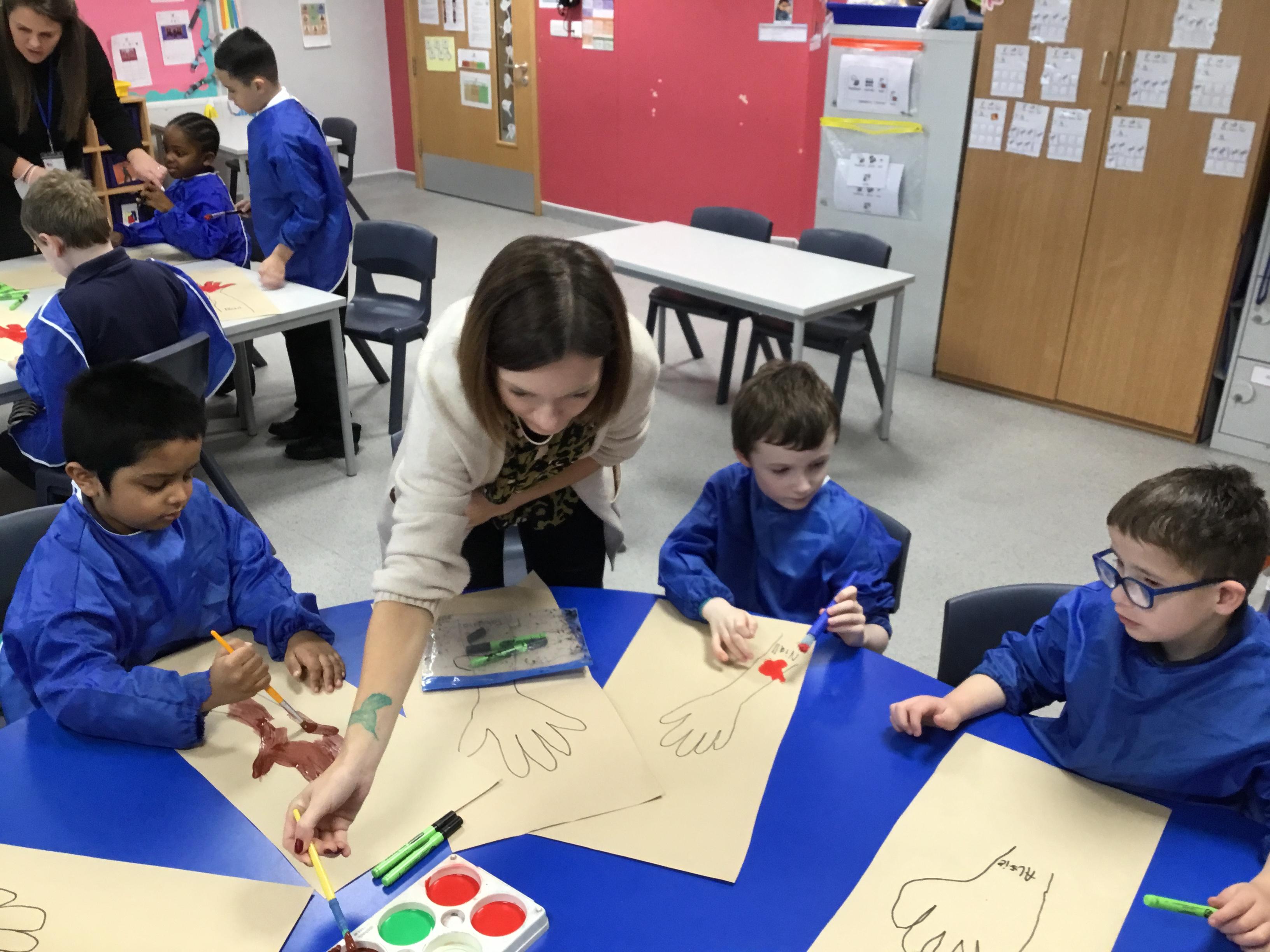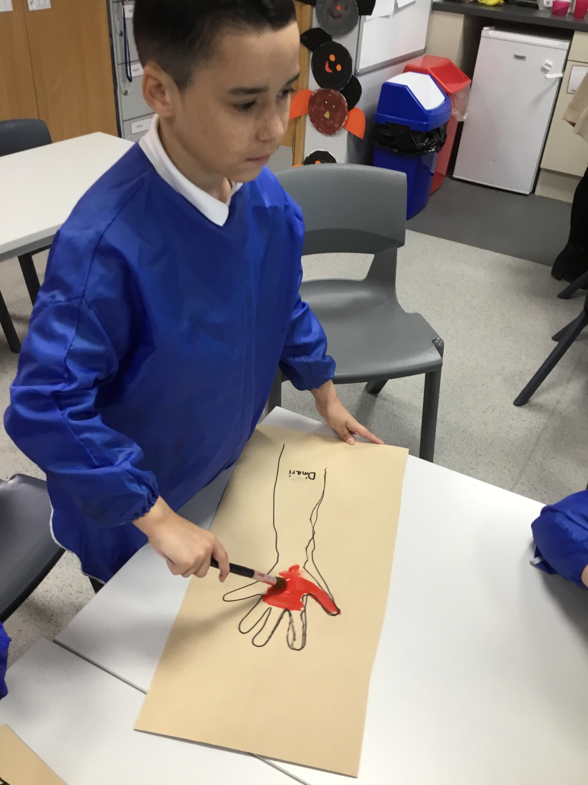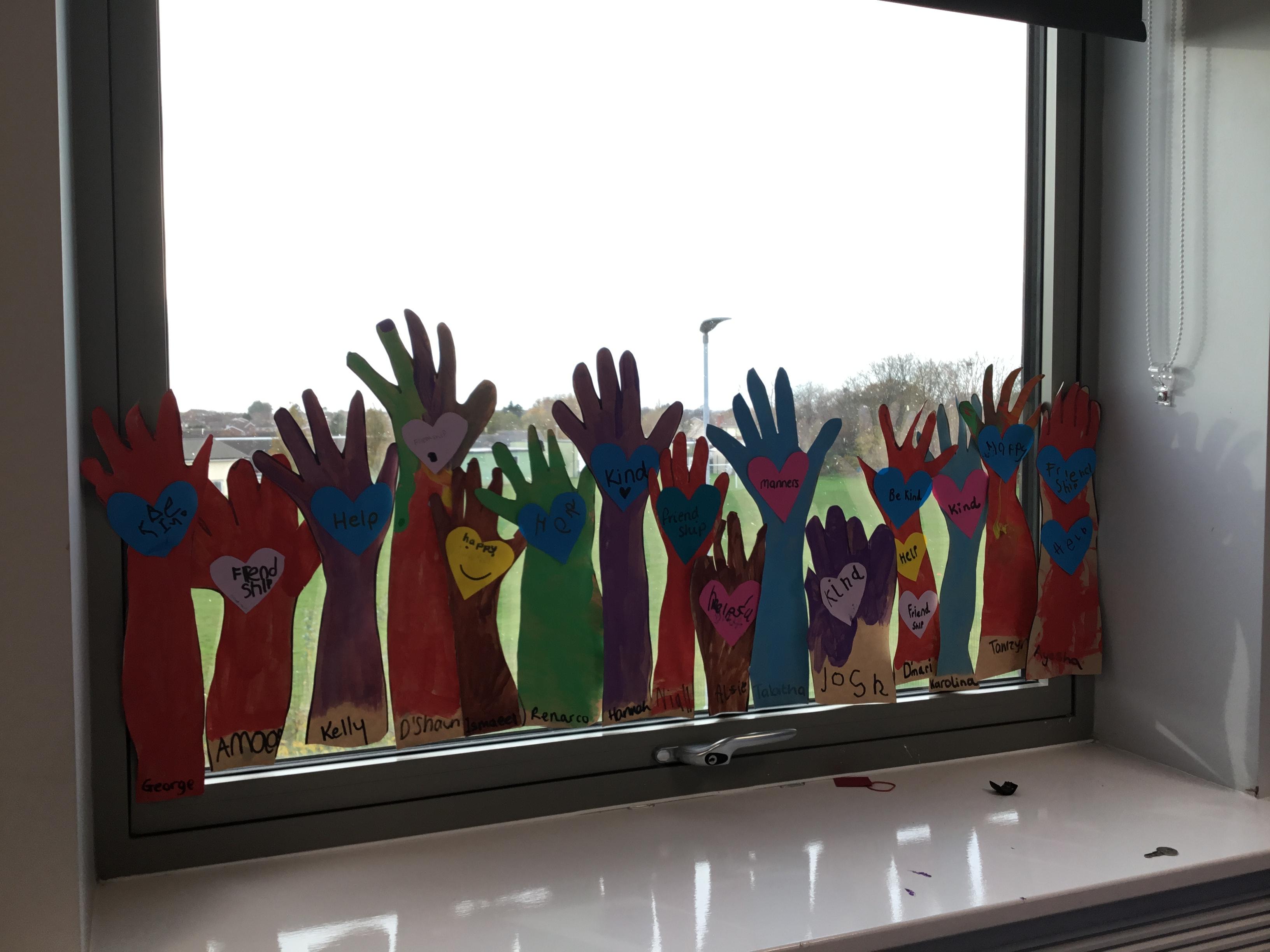 This week was anti-bullying week and we made a window display for our classroom. We drew around our hands and arms, then painted them. In the middle of our hands we put love hearts with words on that were based on being a good friend. We thought of words such as helpful, kind, having good manners etc. We love our display!