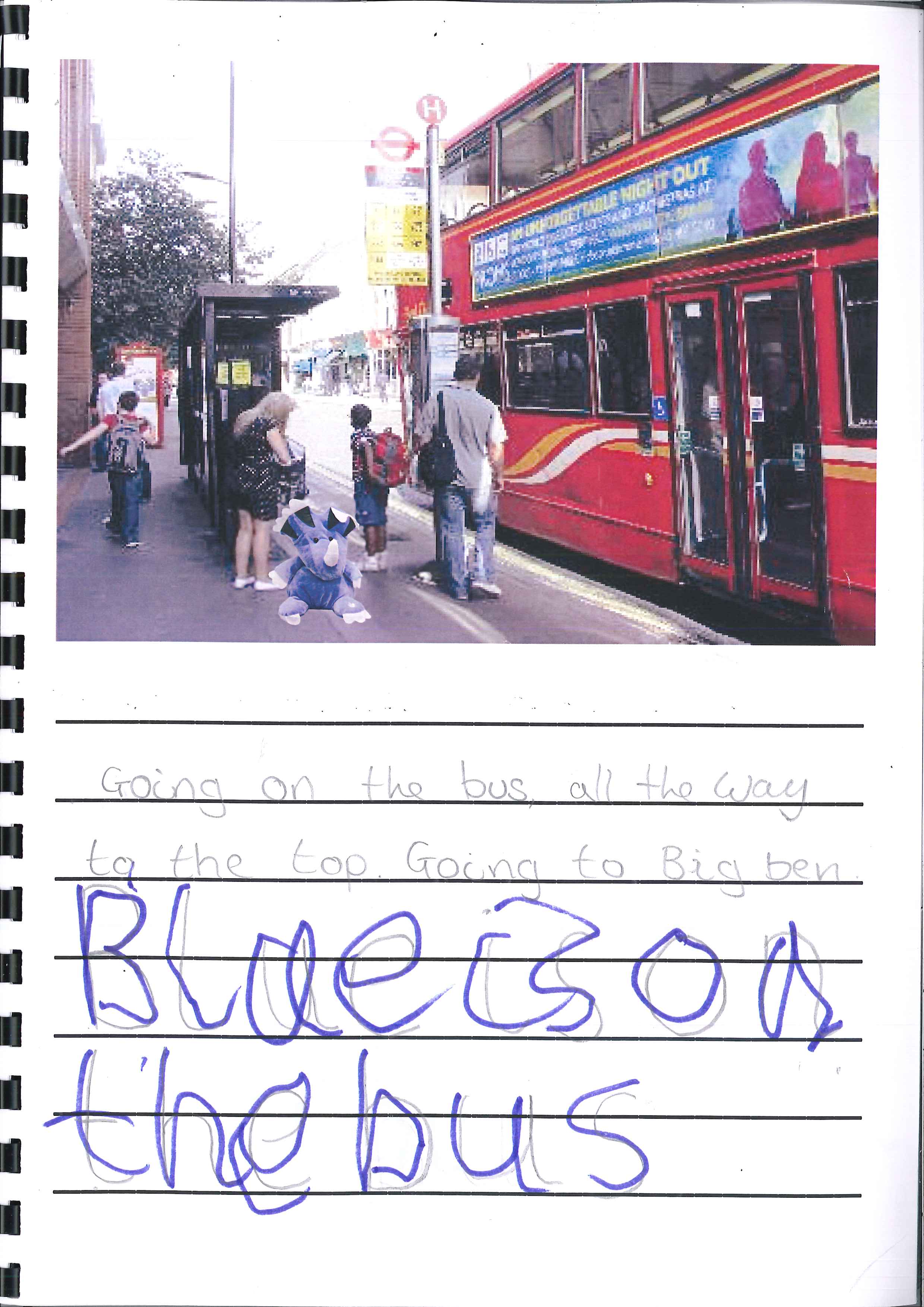 We then finished the term by making our own individual stories using our dinosaur Blue called 'Blue's Day Out!' The children choose from a selection of photographs of places Blue had been and then told or wrote their own stories. Have a look at where Blue went below.