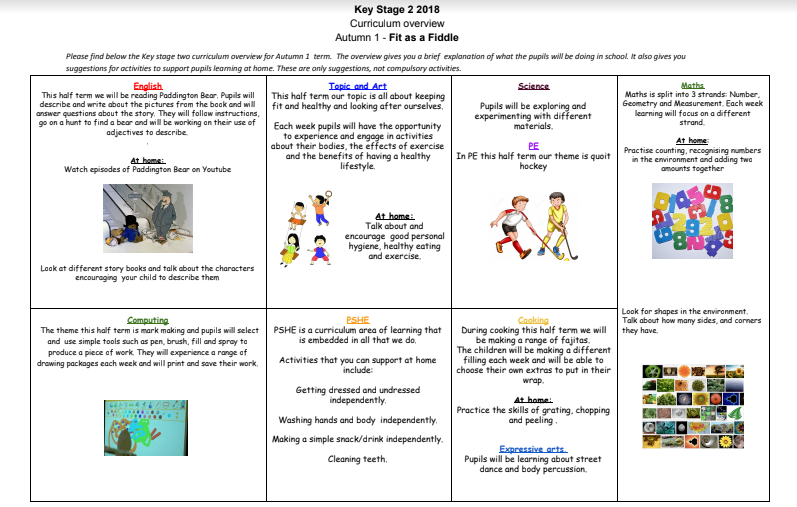 Our topic this half term is Fit as a Fiddle - we will be learning all about keeping fit and healthy and living a healthy lifestyle. We will be learning about the human body and the effects of exercise and healthy eating. The children will participate in a range of physical activities and will be carrying out related creative activities in DT/Art.
