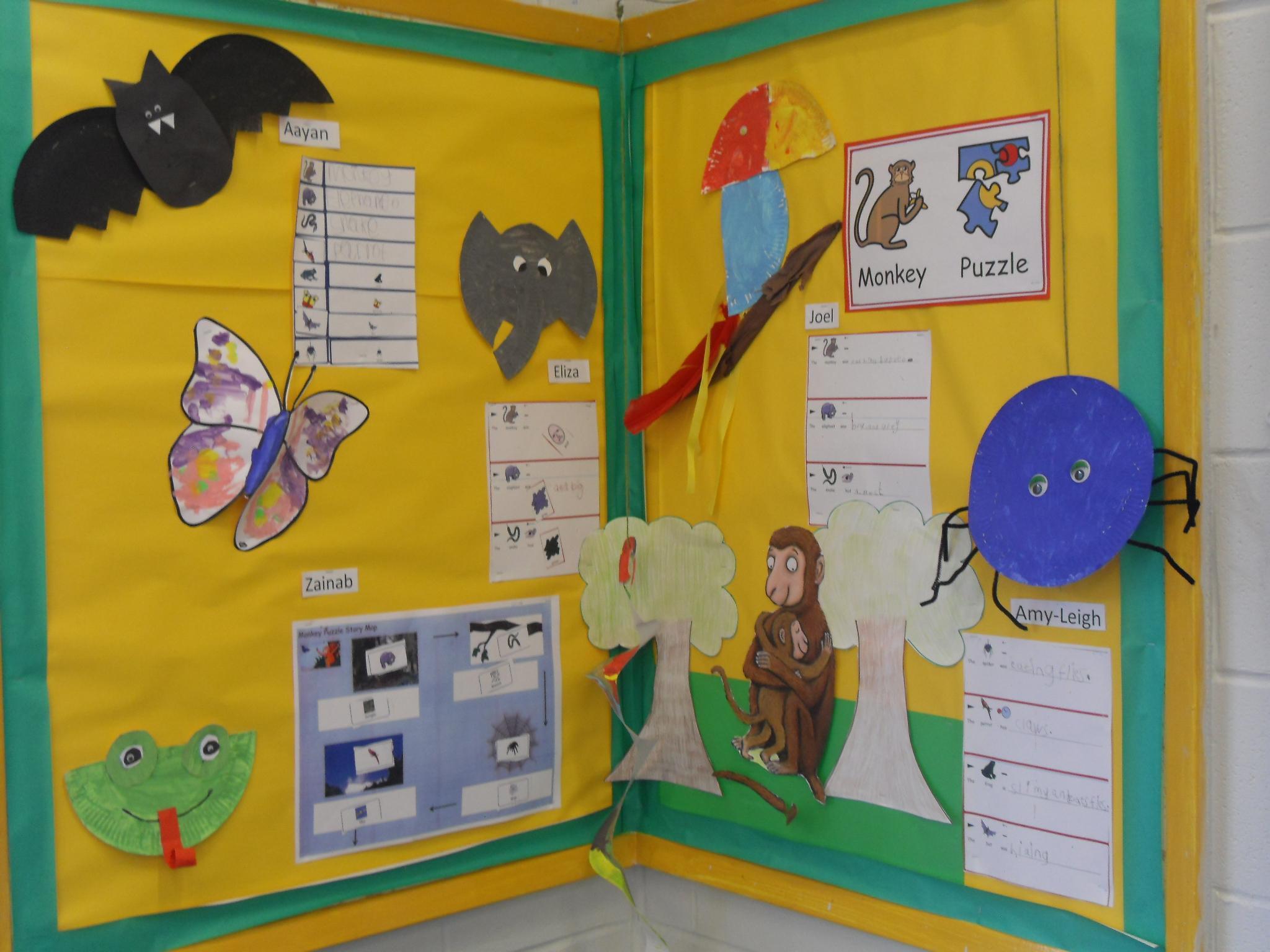 Our Monkey Puzzle storyboard, showing characters the class made and some of their work.