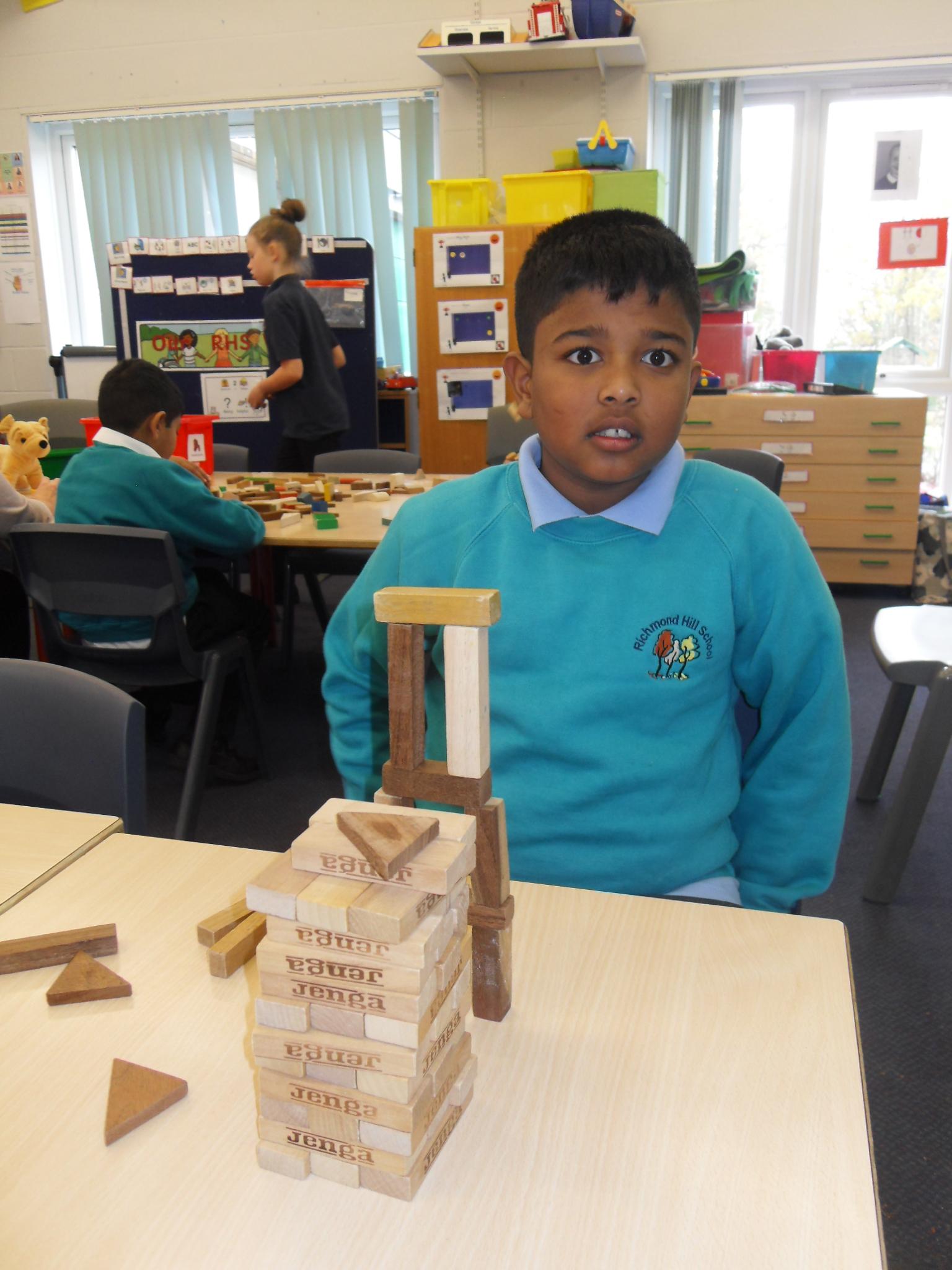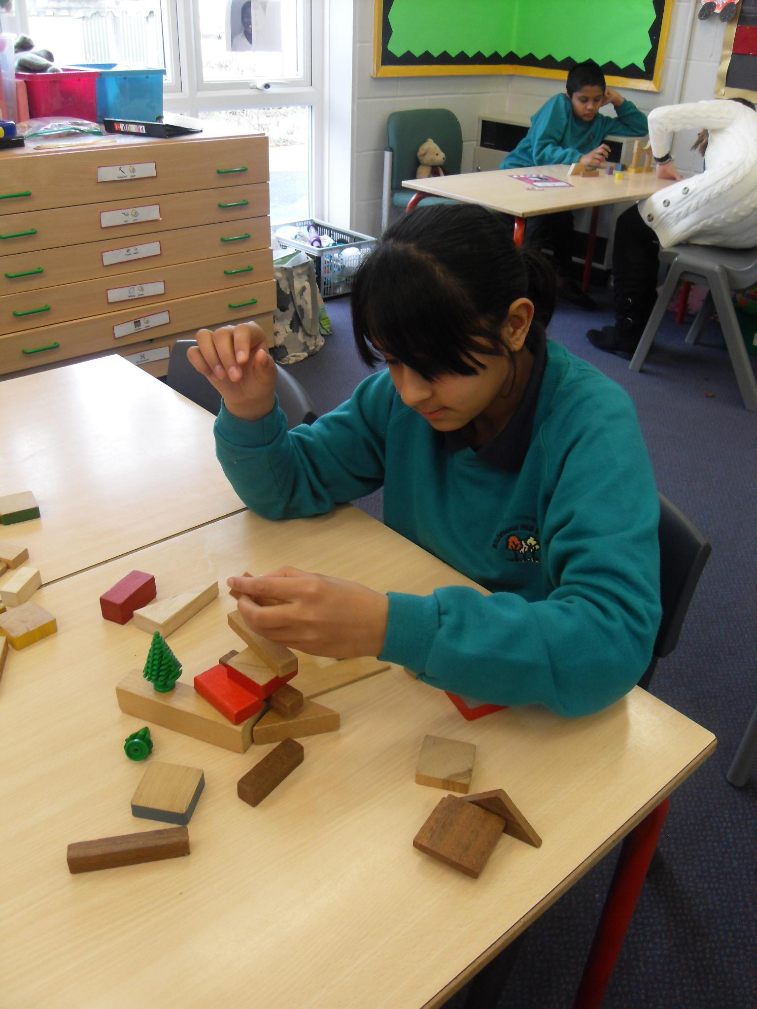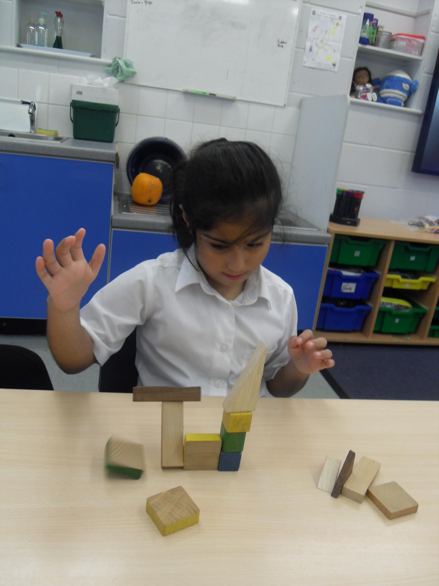 To link with our fairy tales maths we handled a range of 3D building materials, such as wooden blocks, Lego and cubes. We used these to build our own castles.