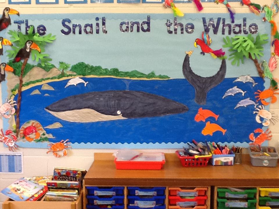 We added toucans, crabs, dolphins, fish and of course the snail to finish our classroom display.