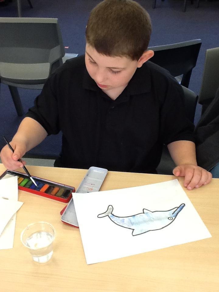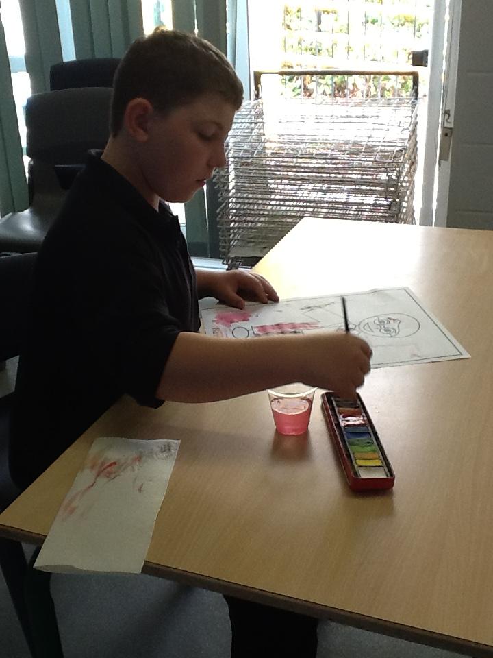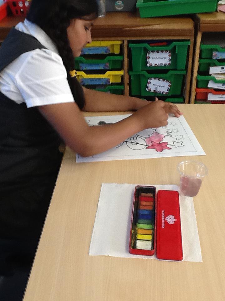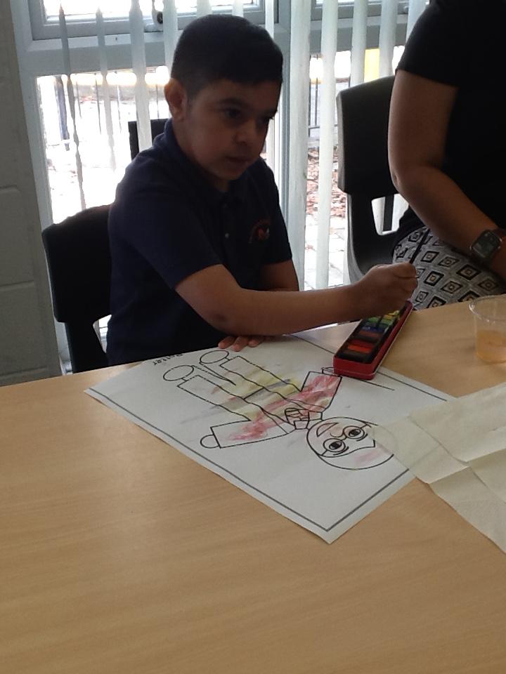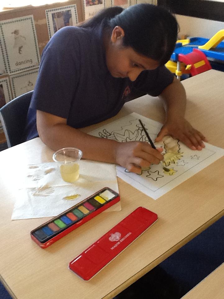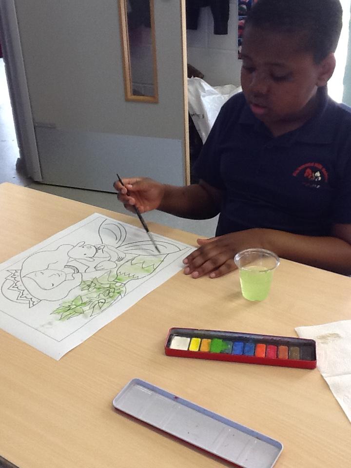 The children painted some lovely pictures with water colours. They were very careful not to mix the different colour paints and to keep the within the lines. The finished paintings were so good they were put up on the classroom window so passing children and staff could see!