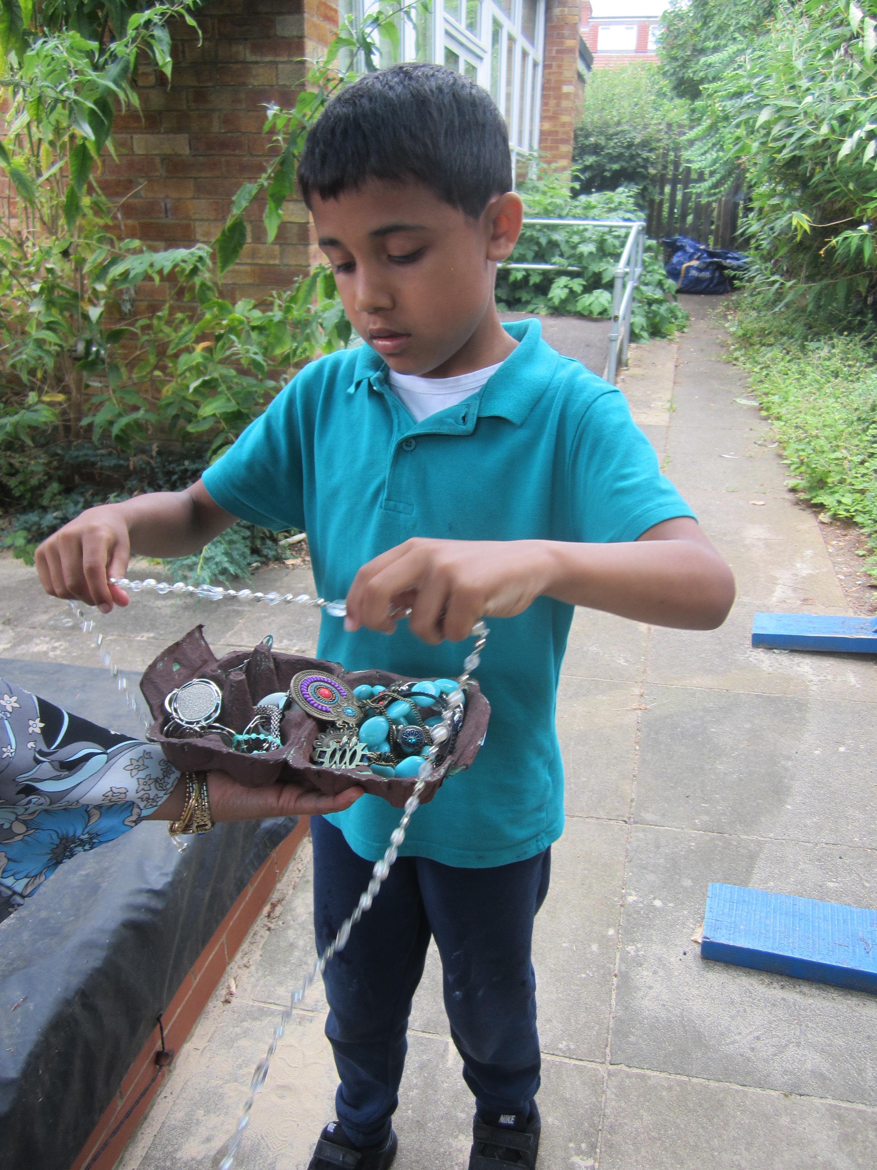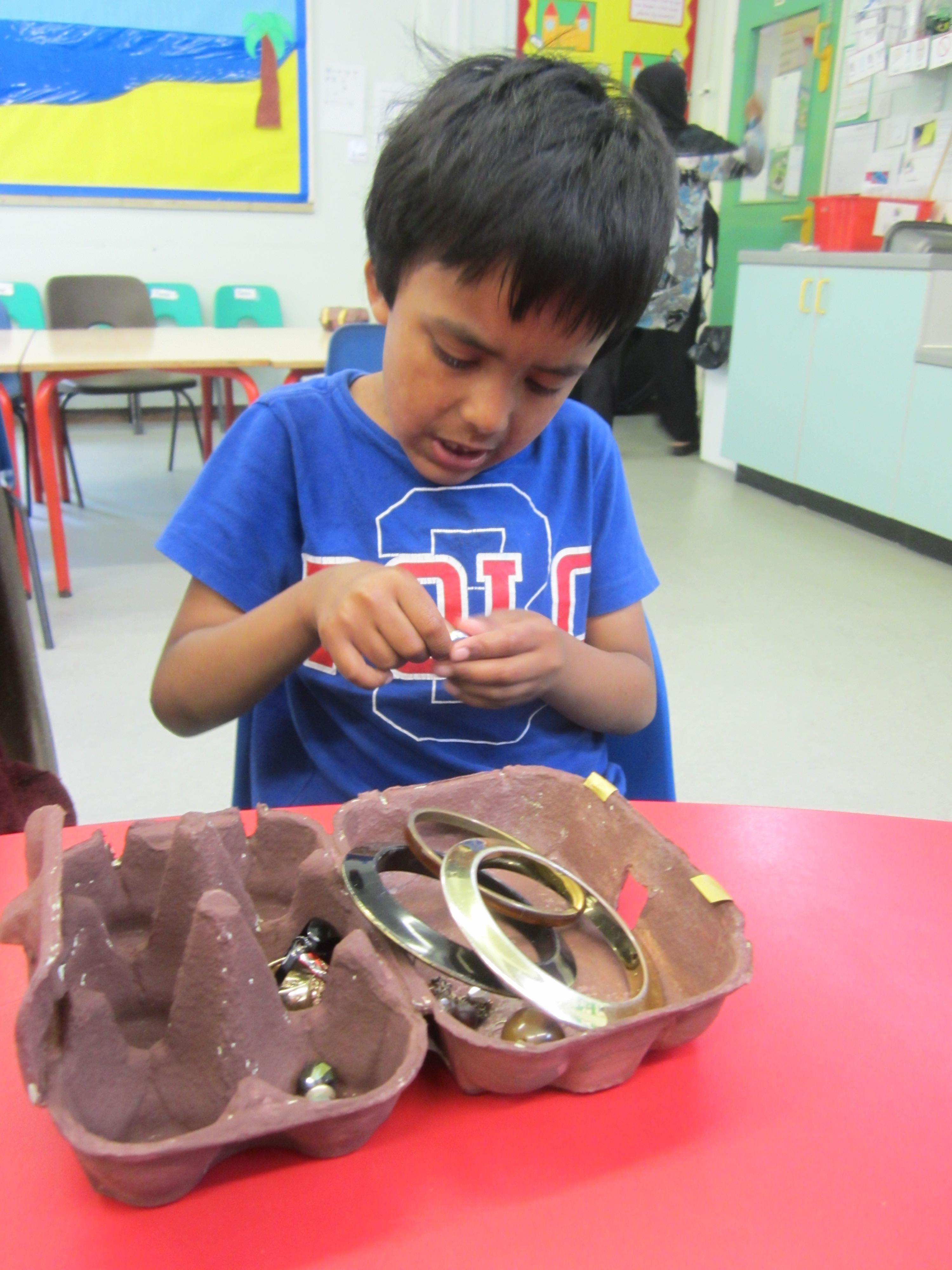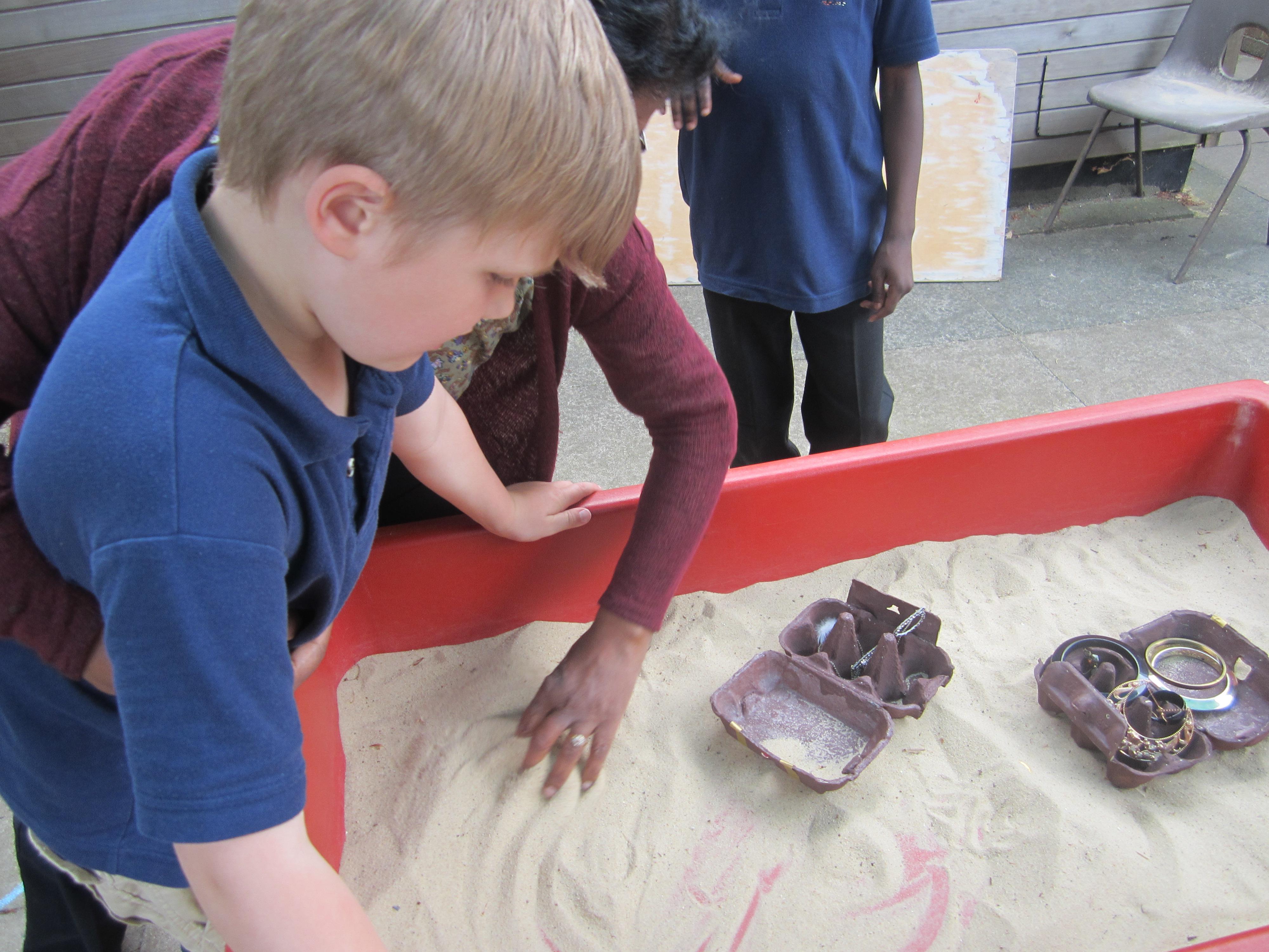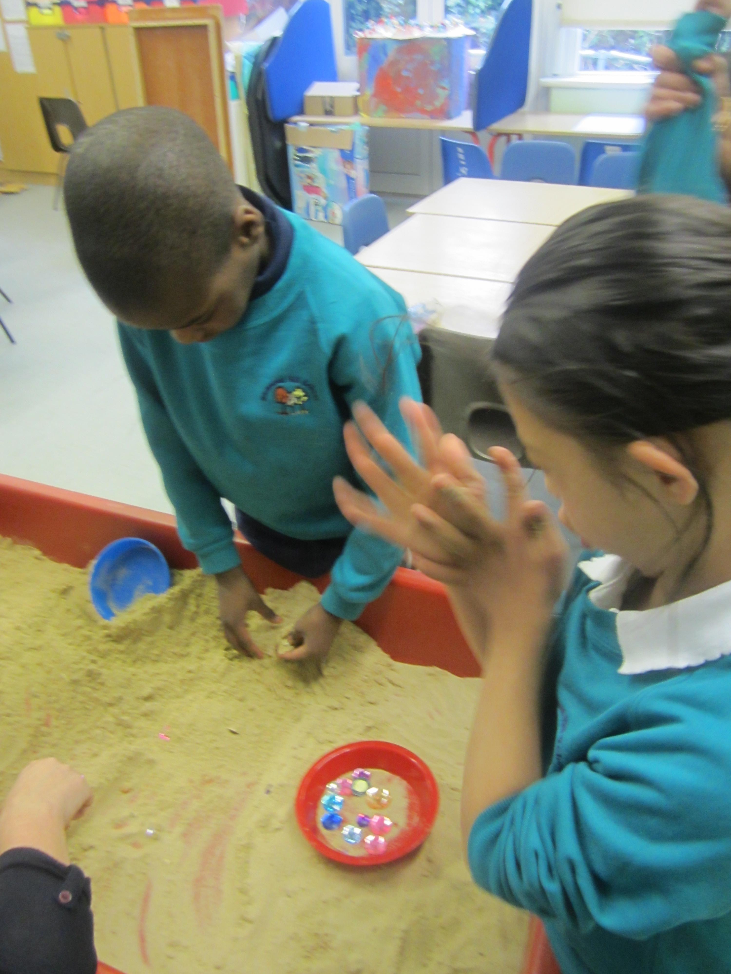 After making our egg box treasure chests, we went on a treasure hunt! The children found all sorts of jewellery hidden in the area outside the classroom, and lots of rings and tiny jewels in our sand tray. They really enjoyed filling up their treasure chests with their finds!