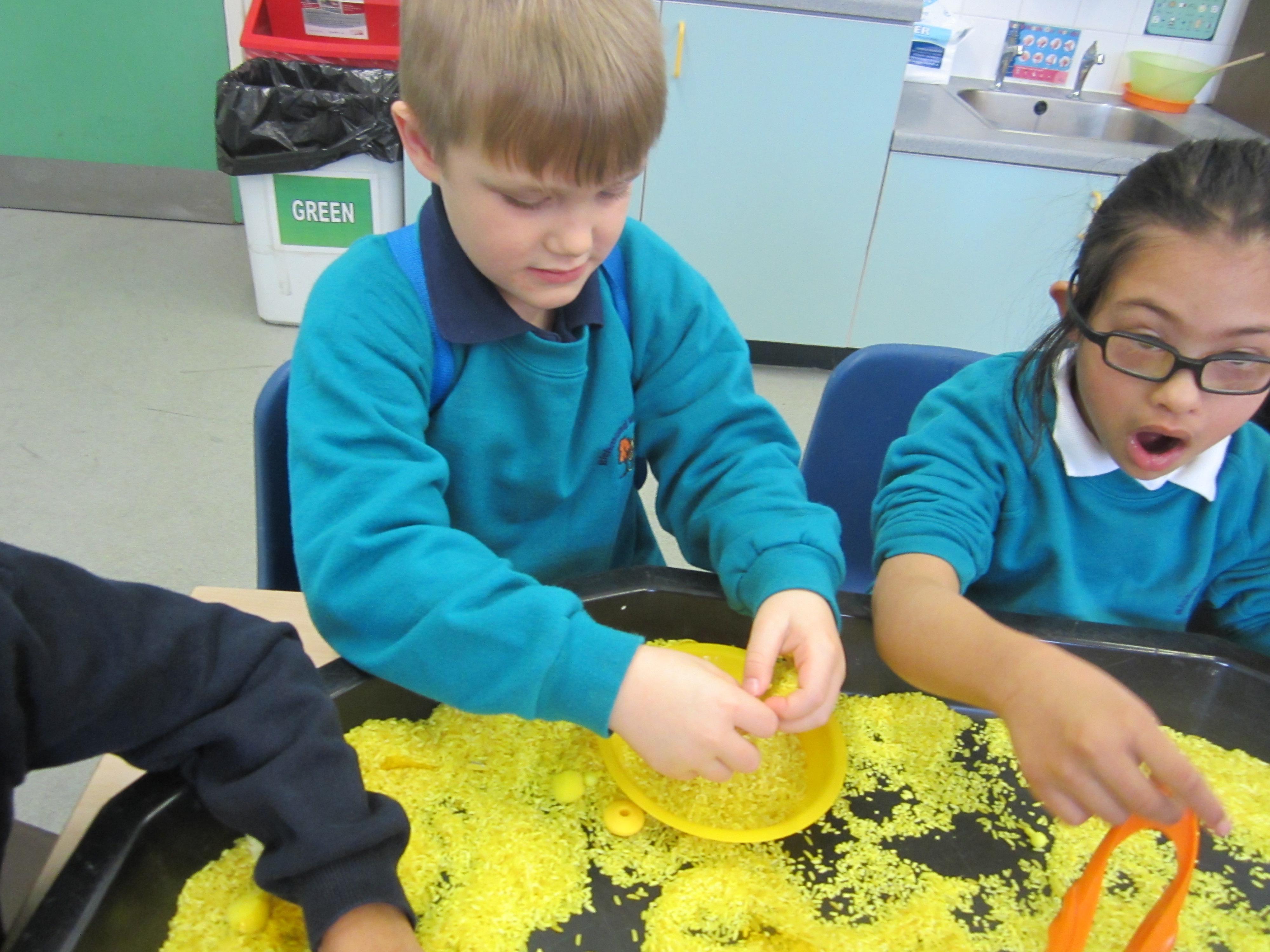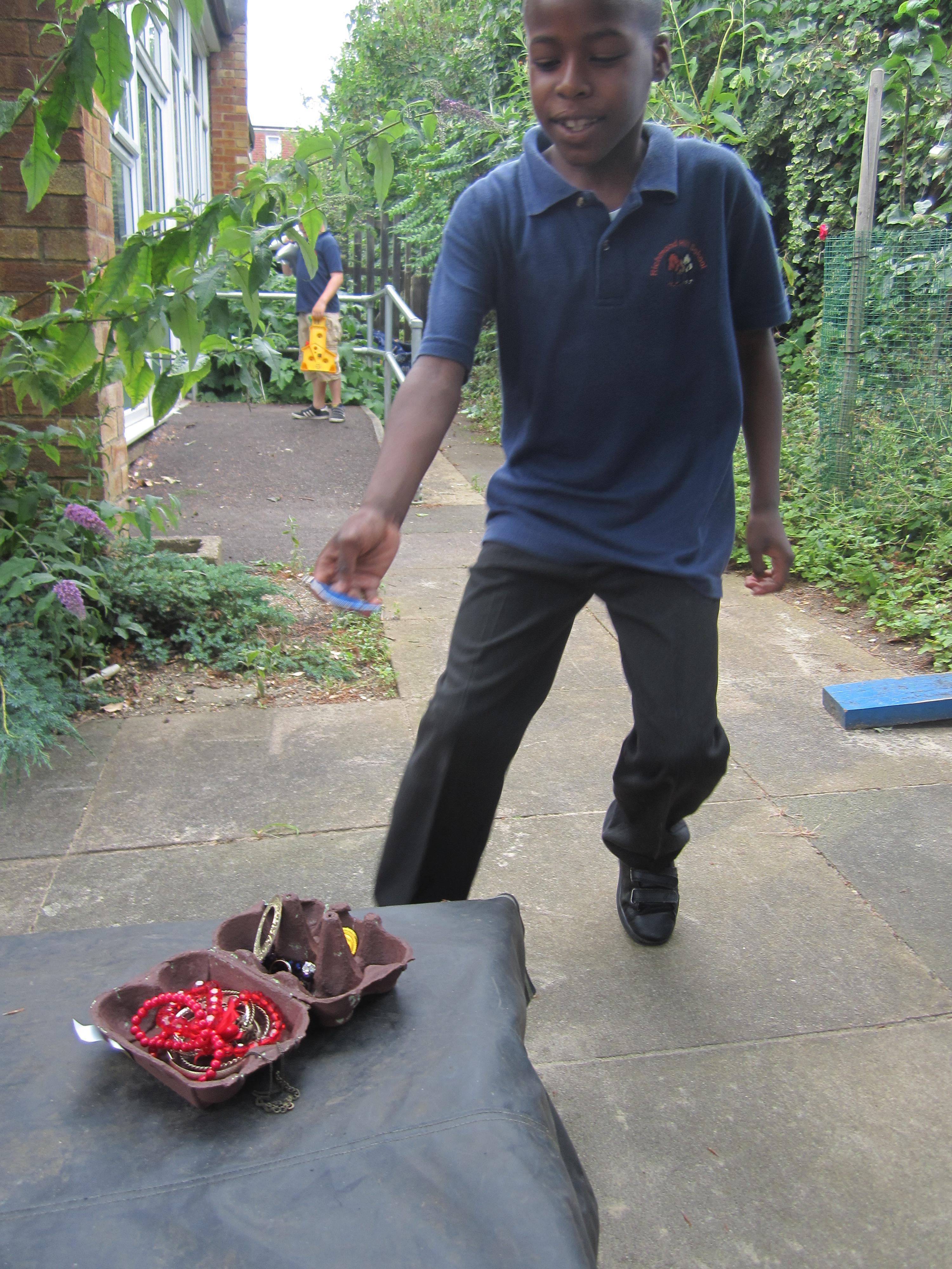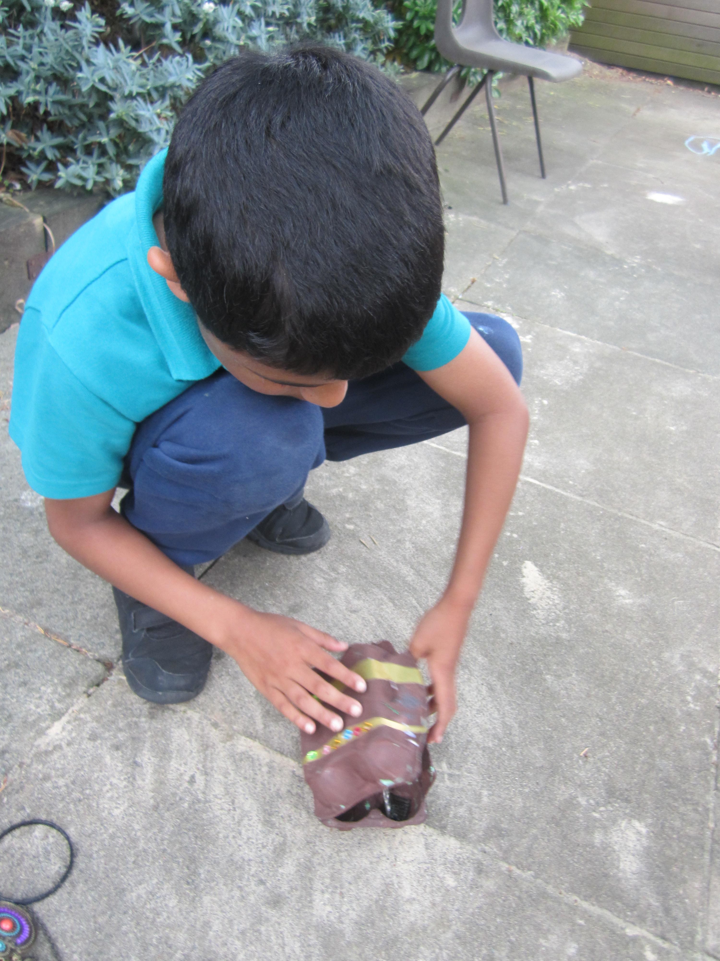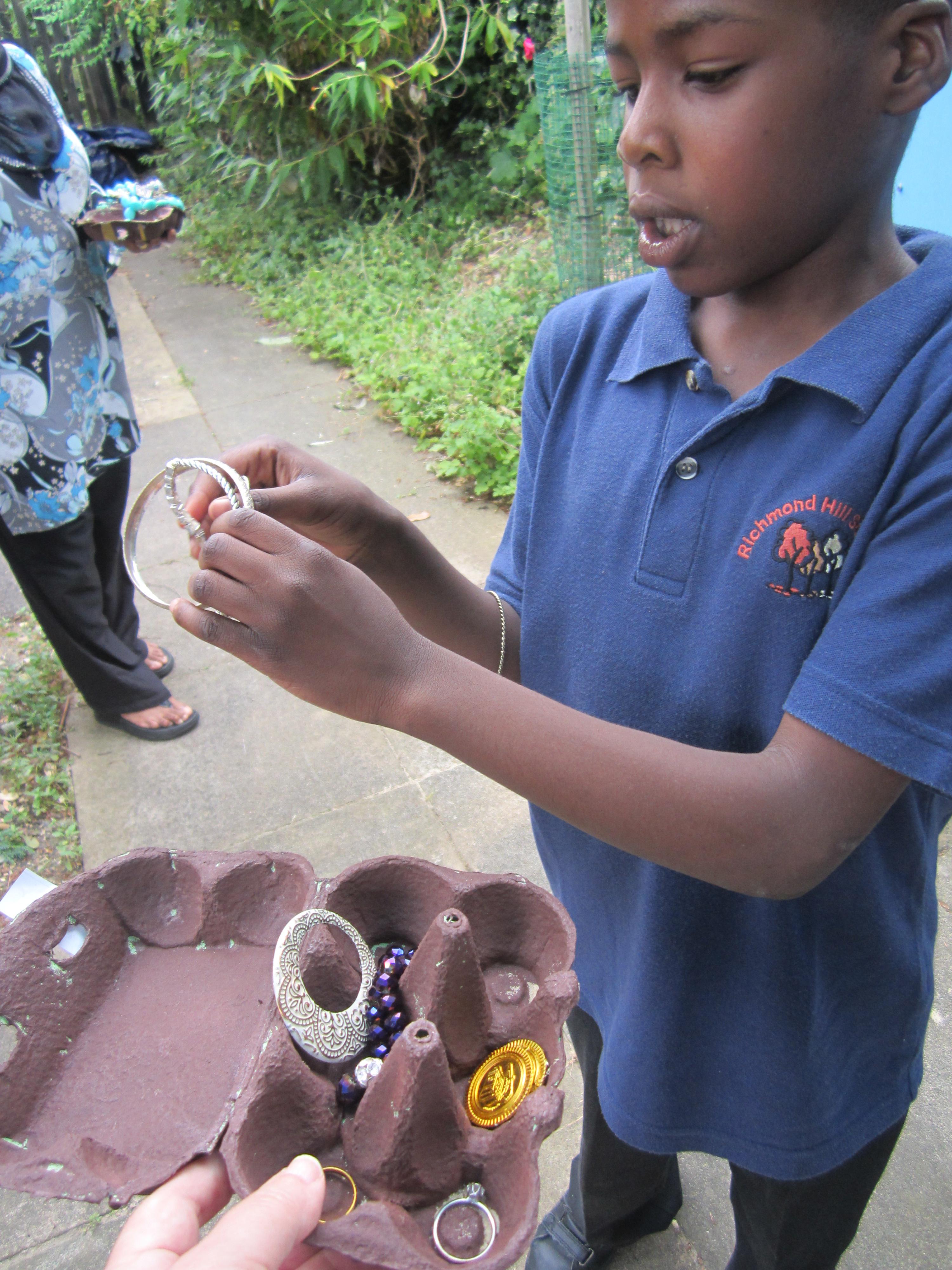 After making our egg box treasure chests, we went on a treasure hunt! The children found all sorts of jewellery hidden in the area outside the classroom, and lots of rings and tiny jewels in our sand tray. They really enjoyed filling up their treasure chests with their finds!