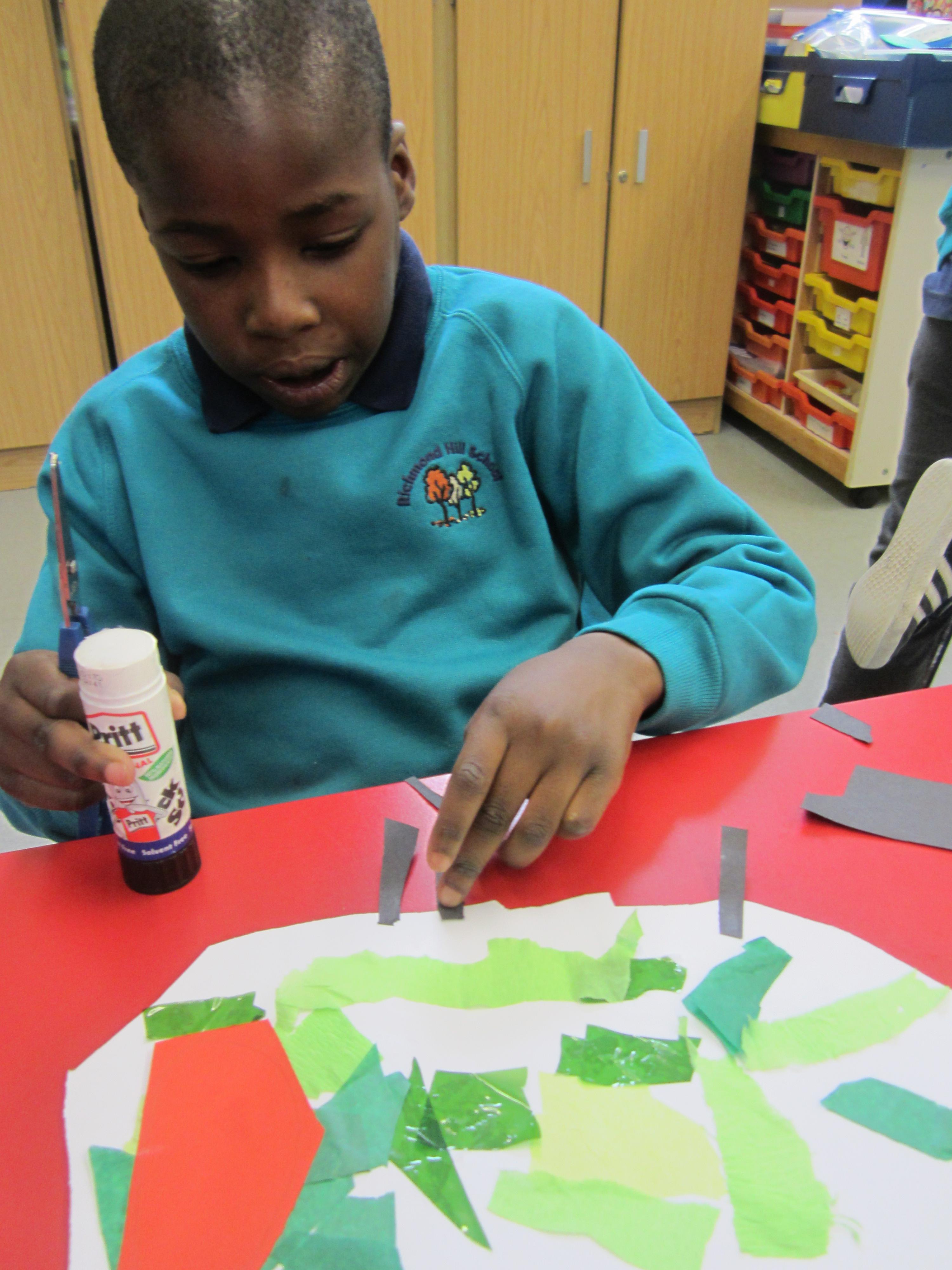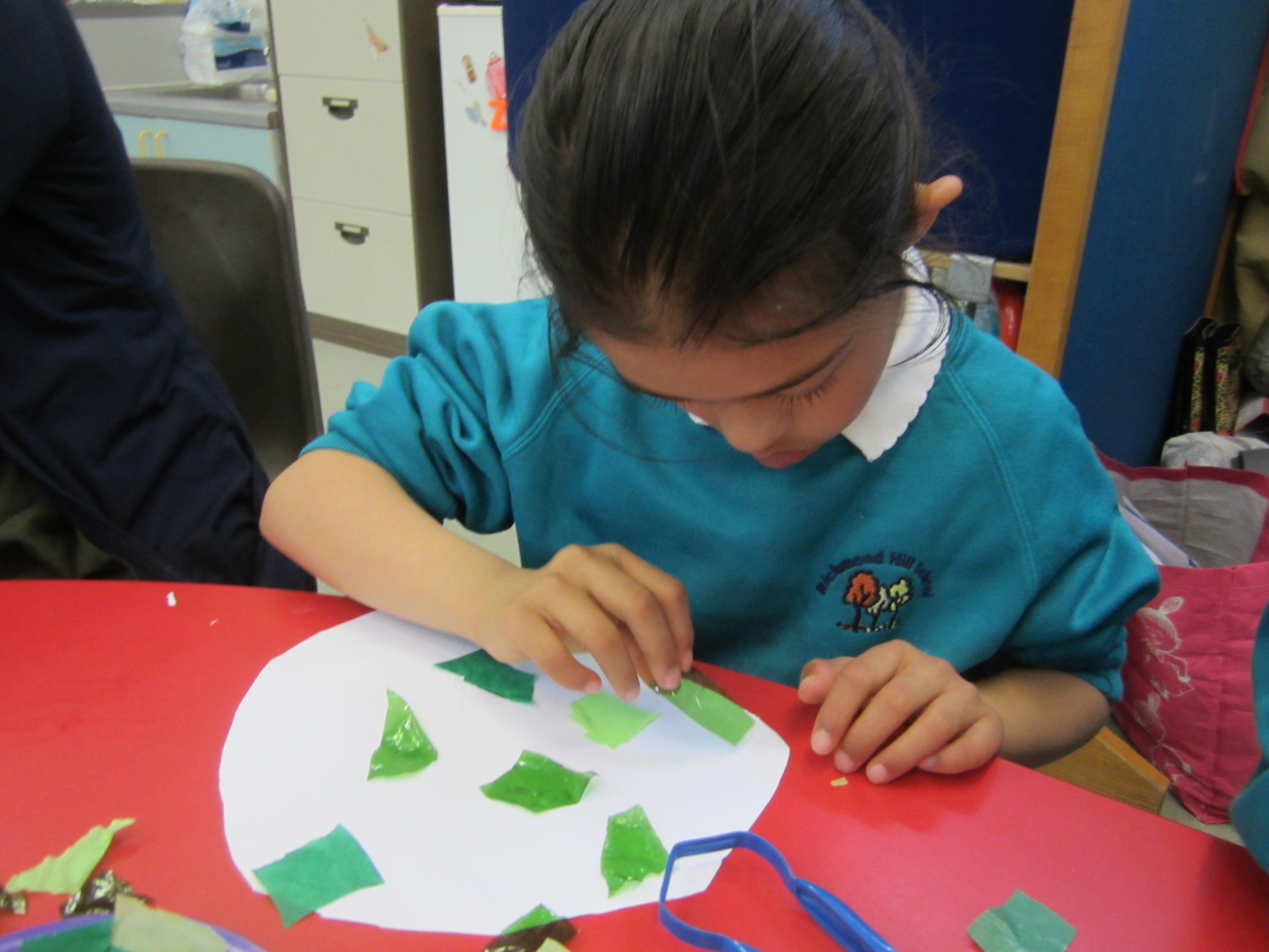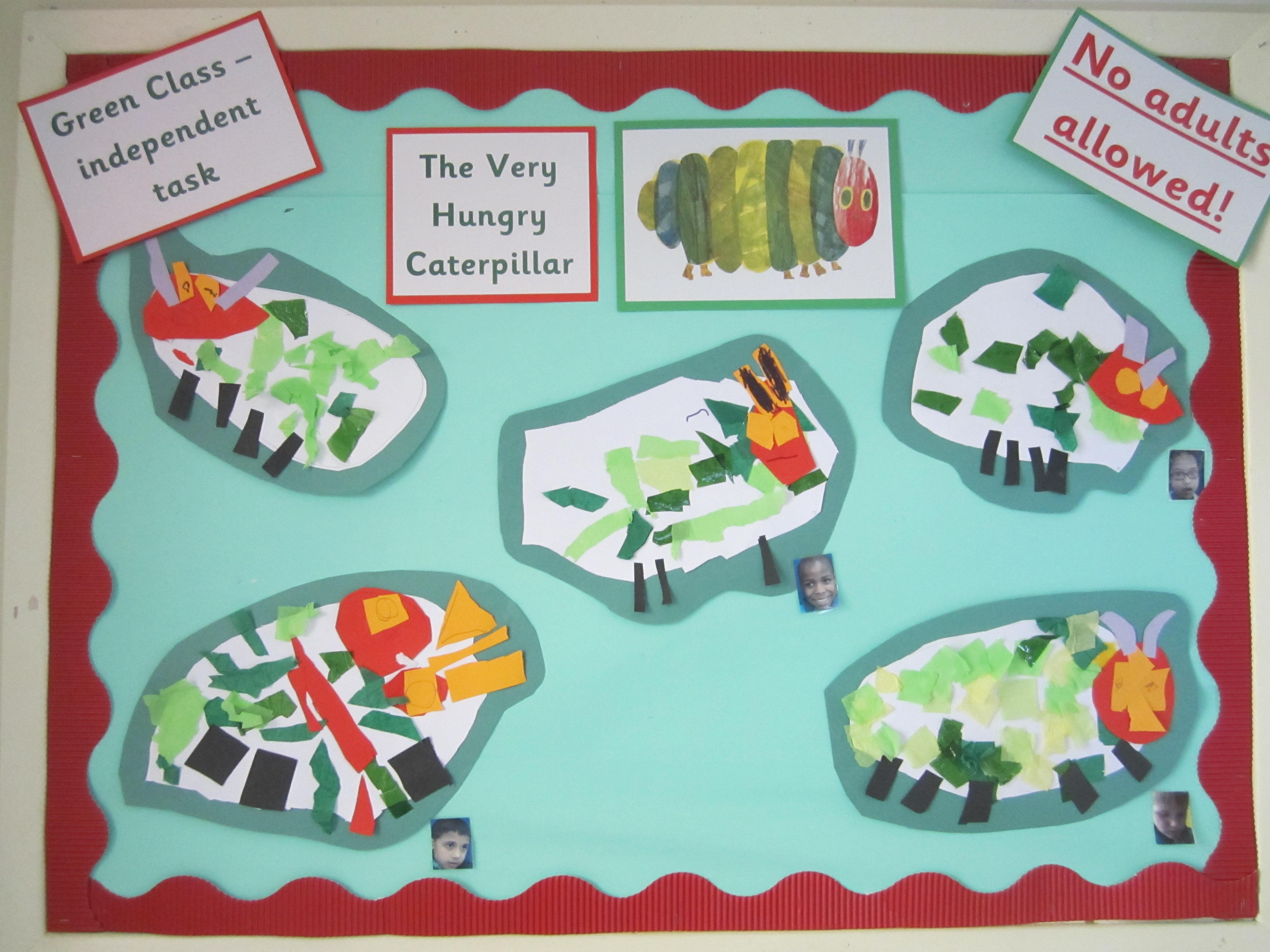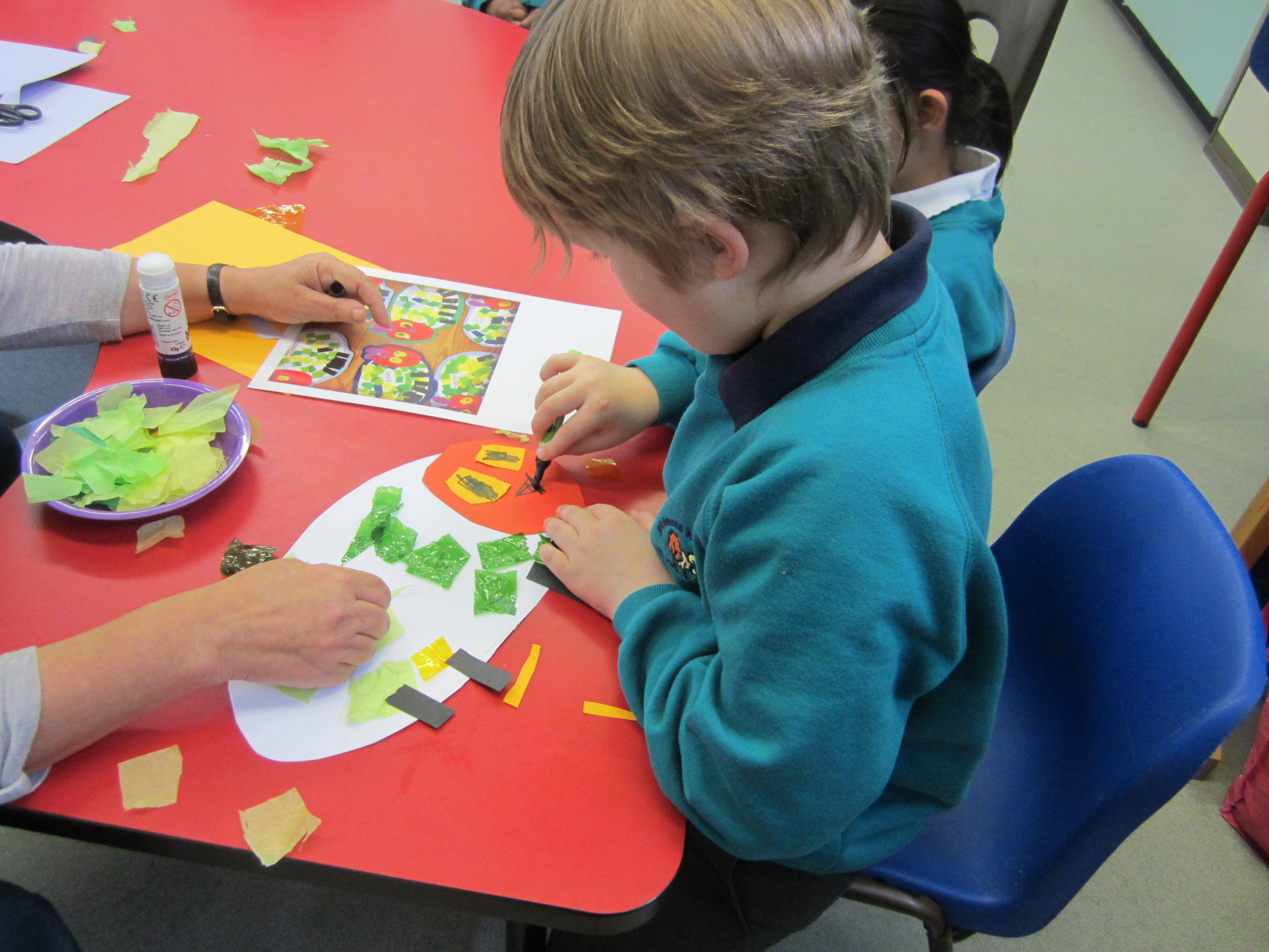 Yesterday we looked at a picture of the fat, very hungry caterpillar. I showed the children the resources we were going to use, and we made an example as a group, so that they really understood what it was they were going to do. Then we provided them with the art materials and a blank piece of A3 card, and left them to it!