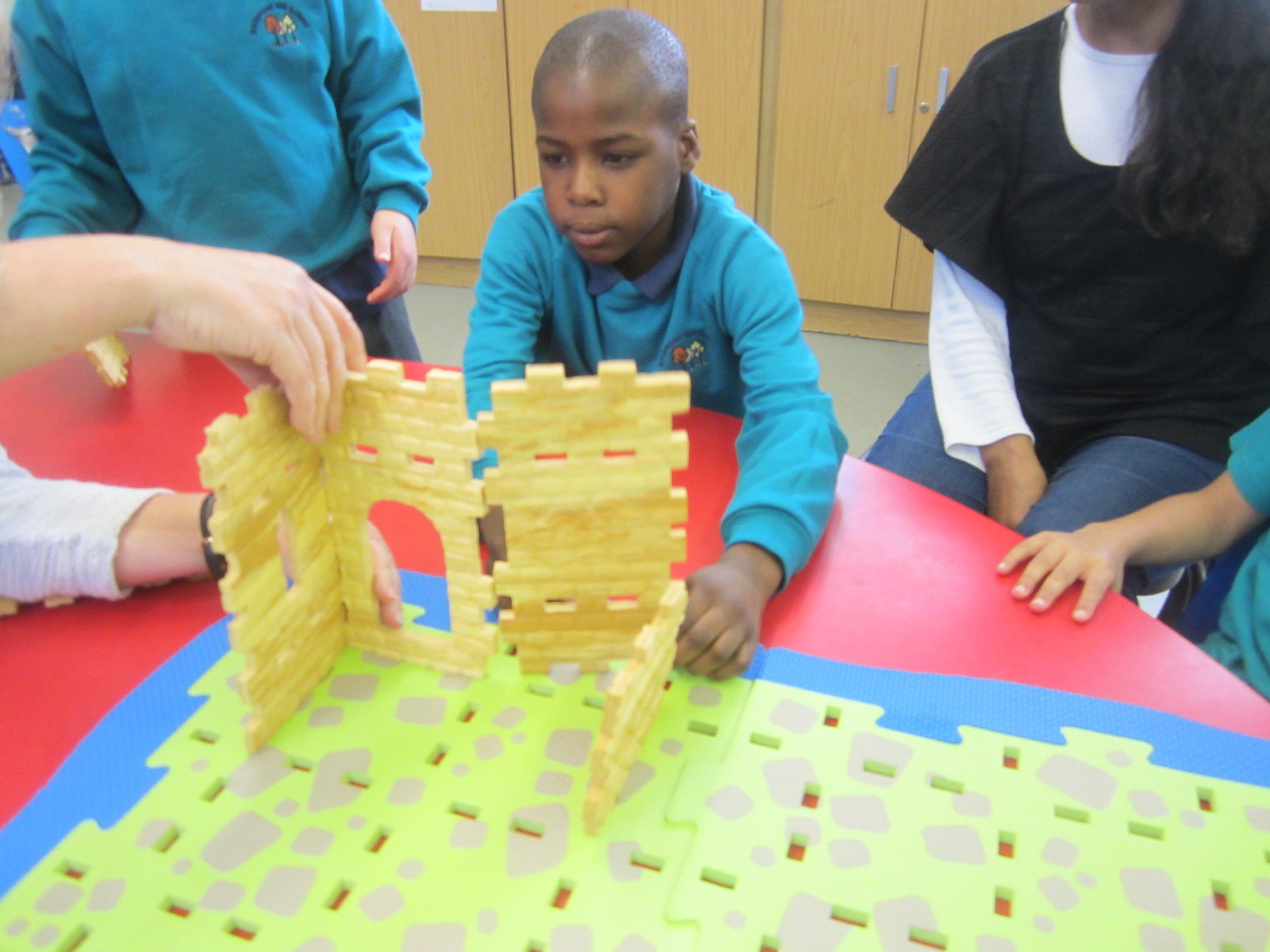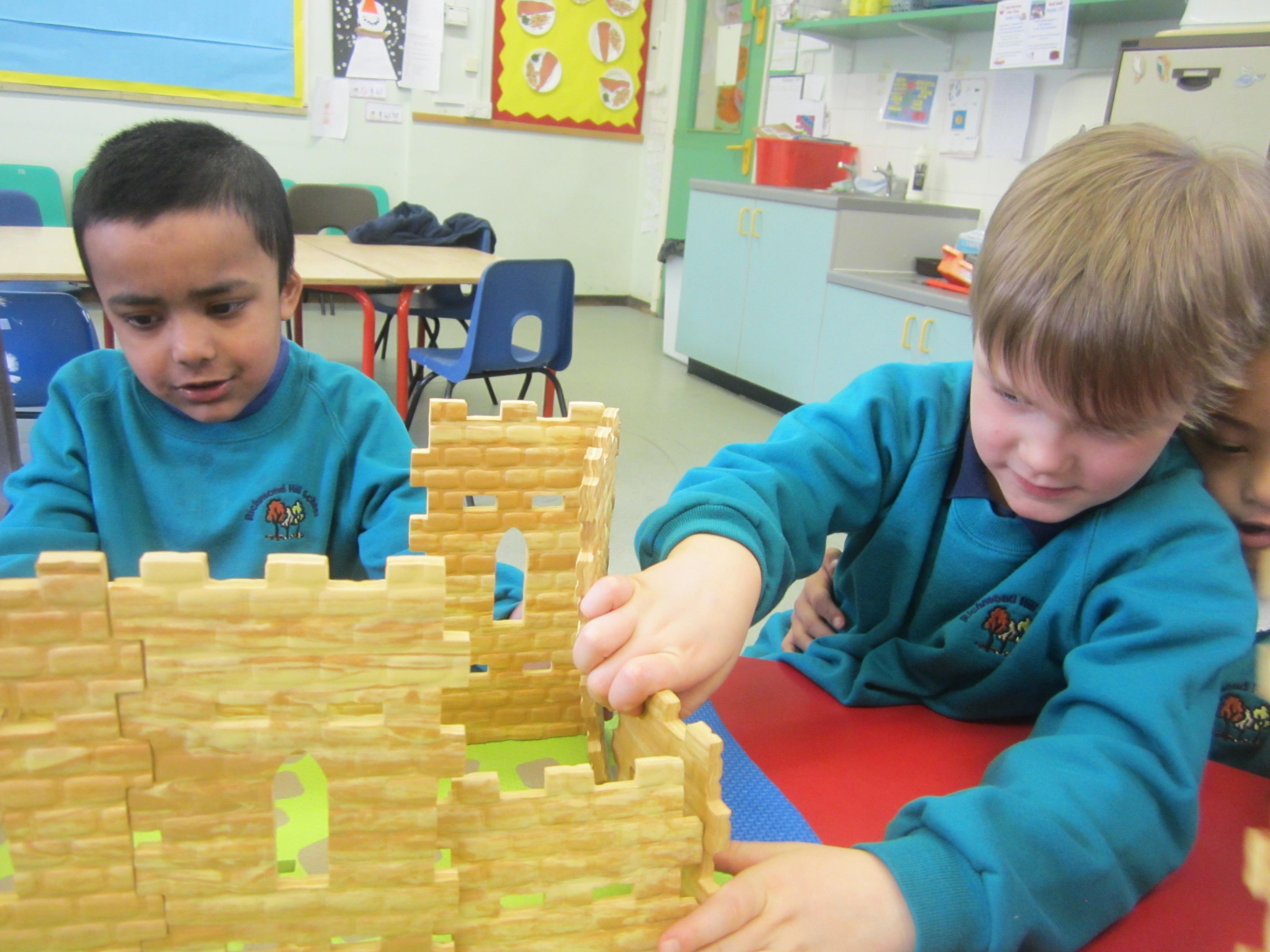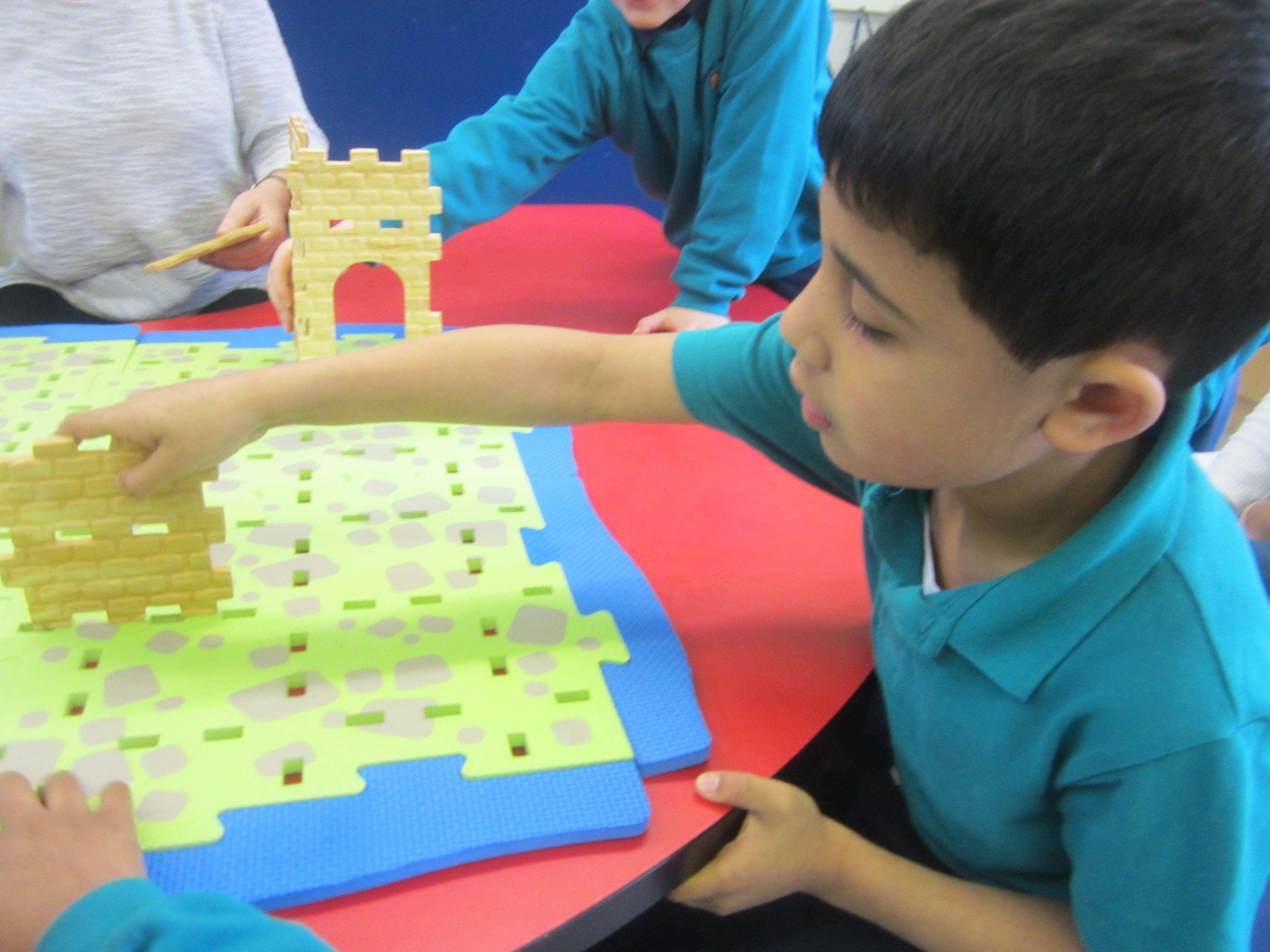 We started out by looking at castles. The children sponge painted some castle walls which we are using to make the doorway into our classroom look like a castle entrance! They've enjoyed playing in a pop-up castle tent, and most of all, they enjoyed a group session with a Construct a Castle set. We were really impressed with the way they used the component parts co-operatively, and clearly had a vision about what they wanted to create. I hope you enjoy the photos from this activity.