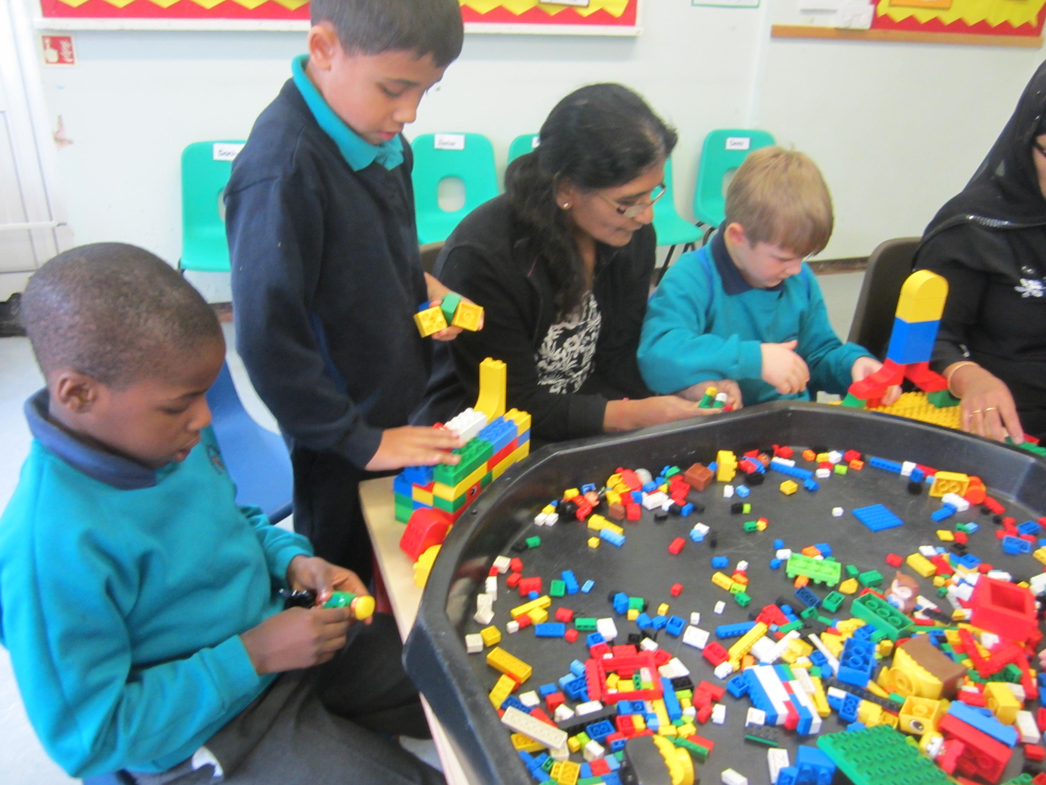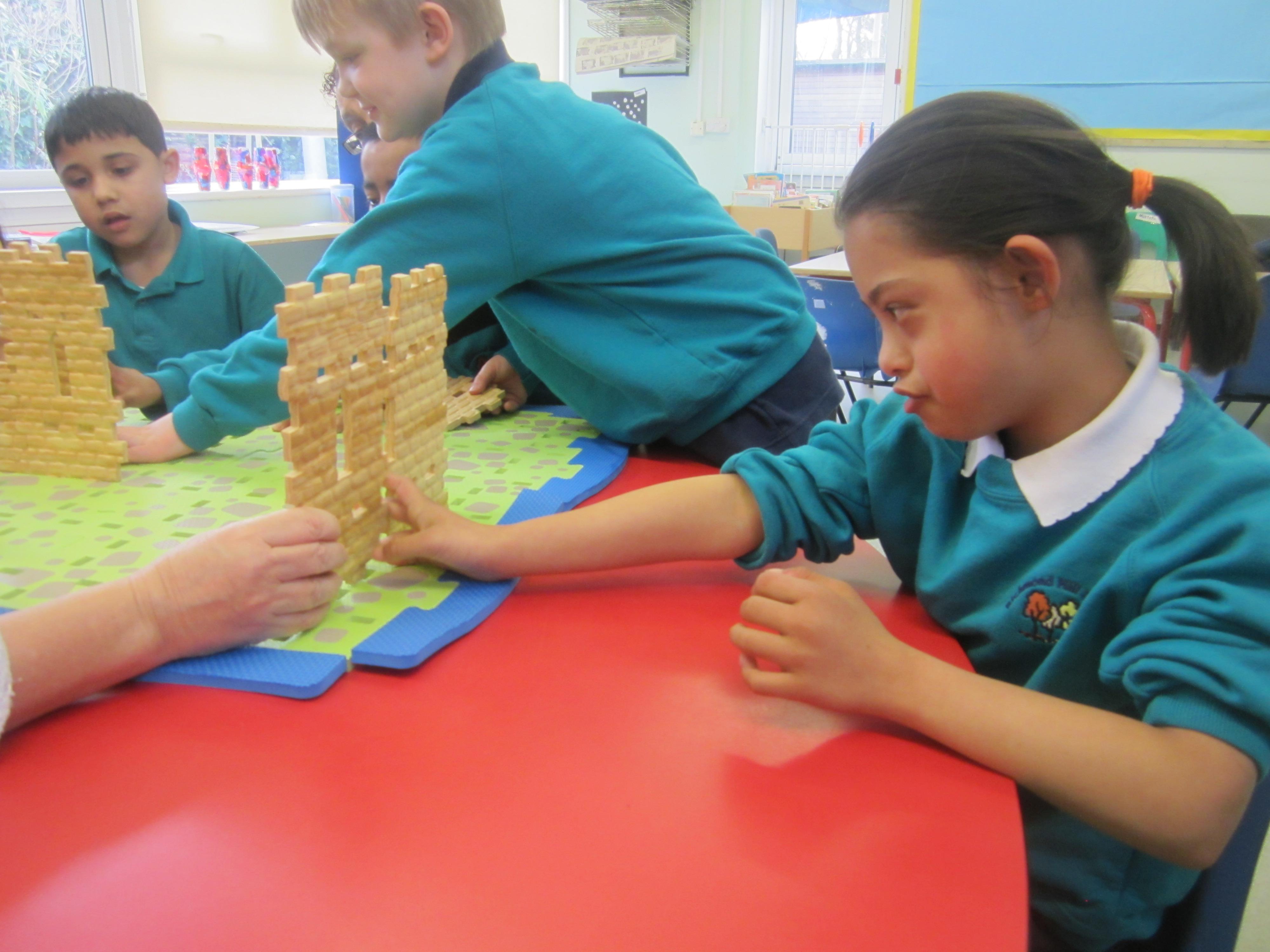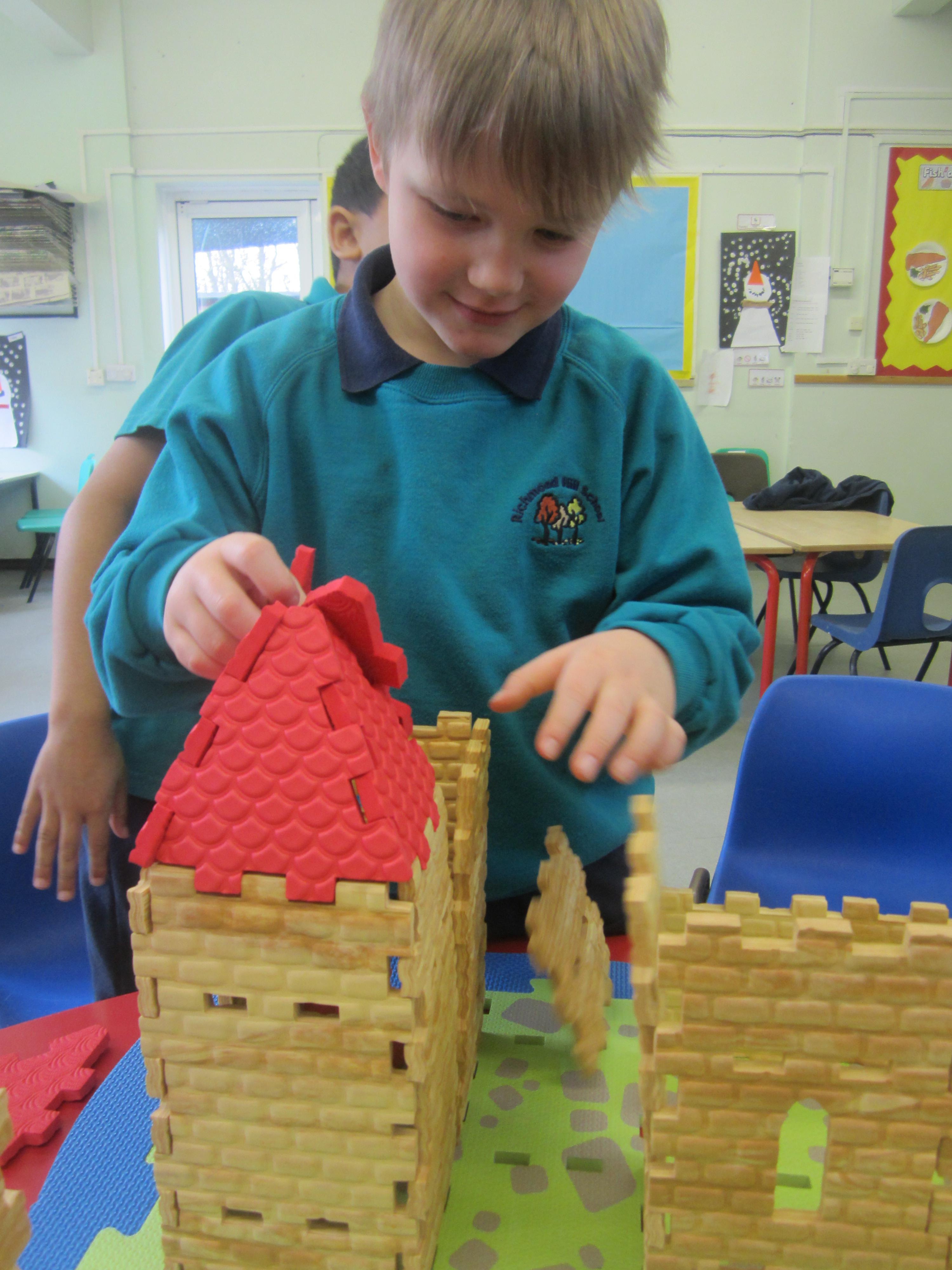 We started out by looking at castles. The children sponge painted some castle walls which we are using to make the doorway into our classroom look like a castle entrance! They've enjoyed playing in a pop-up castle tent, and most of all, they enjoyed a group session with a Construct a Castle set. We were really impressed with the way they used the component parts co-operatively, and clearly had a vision about what they wanted to create. I hope you enjoy the photos from this activity.