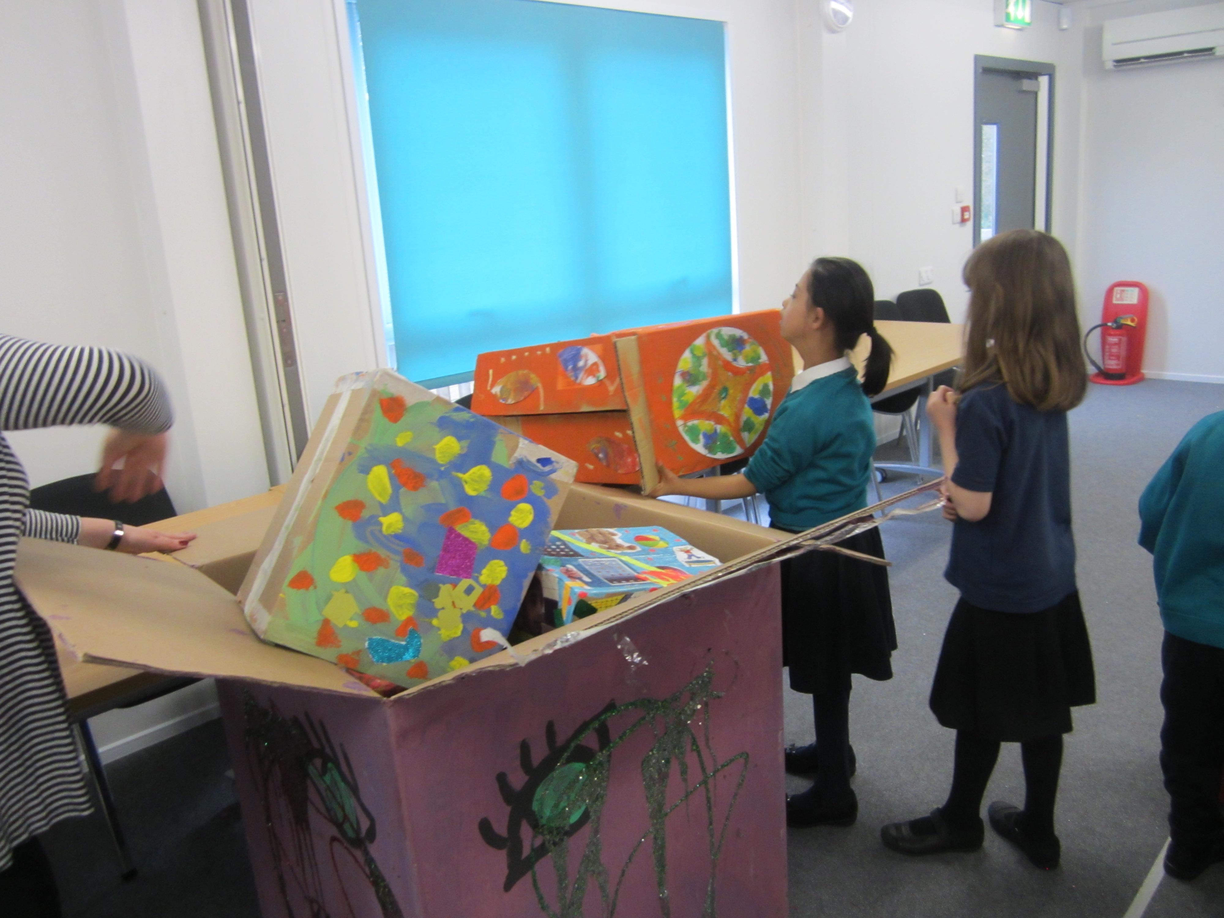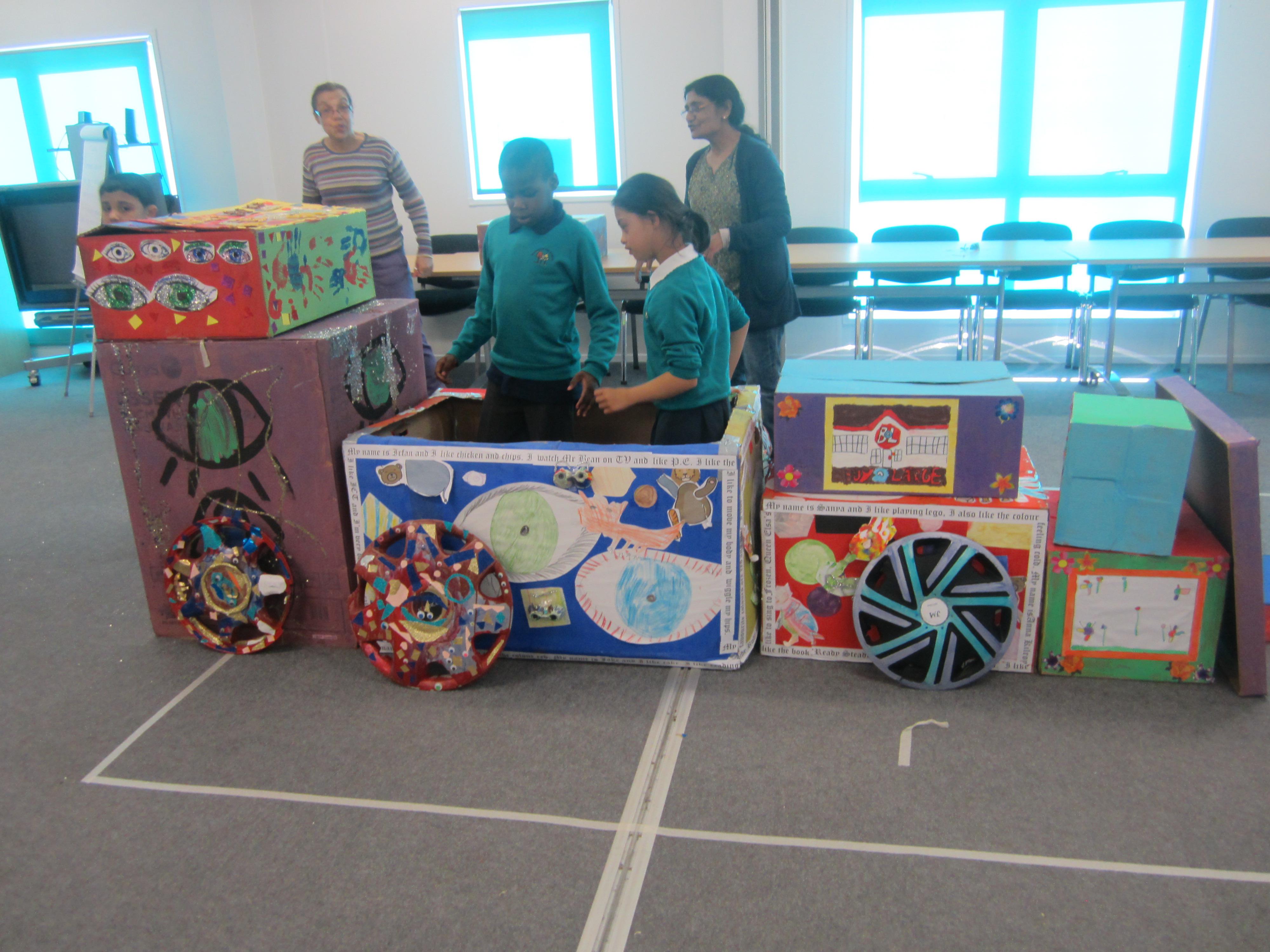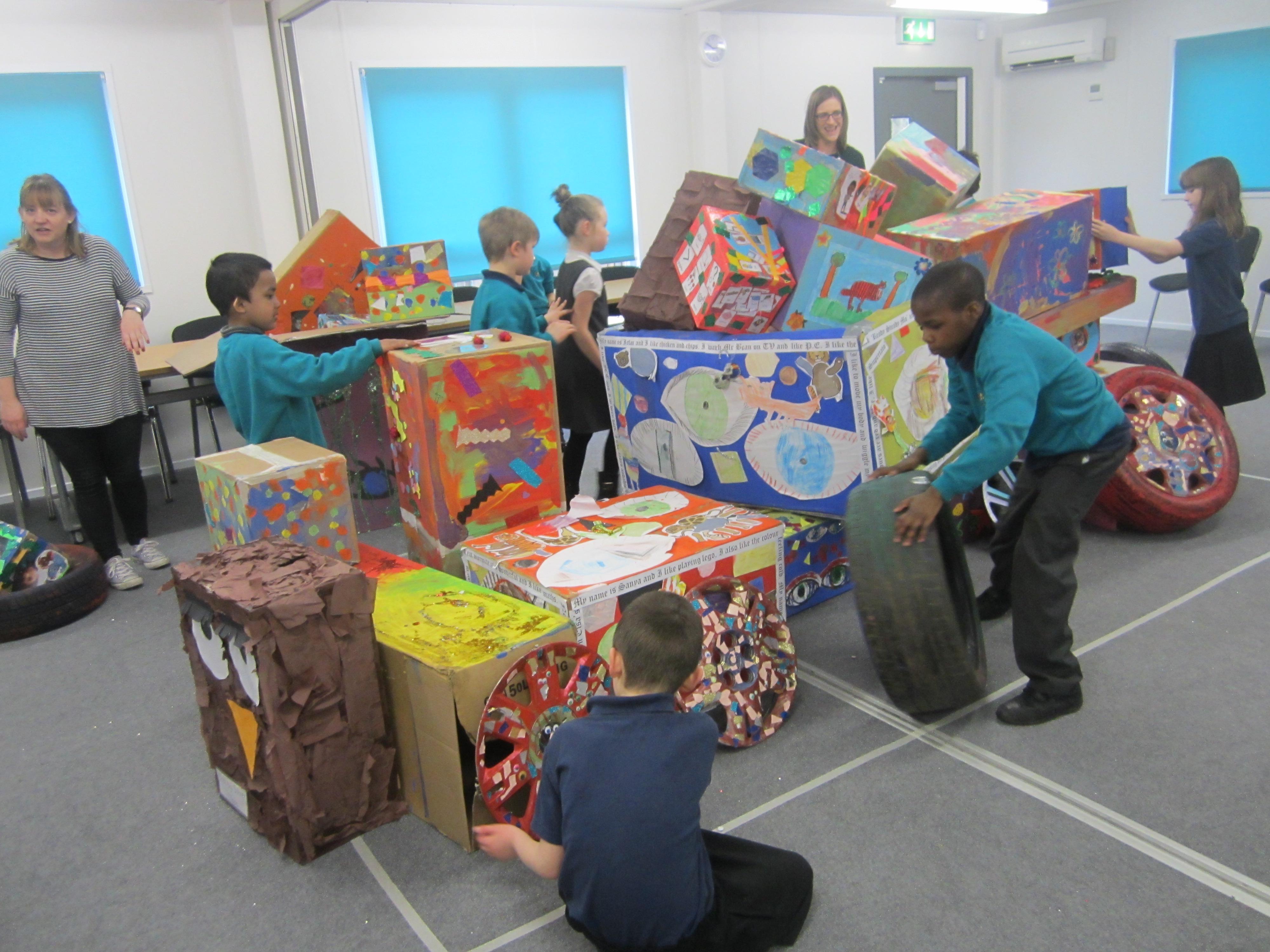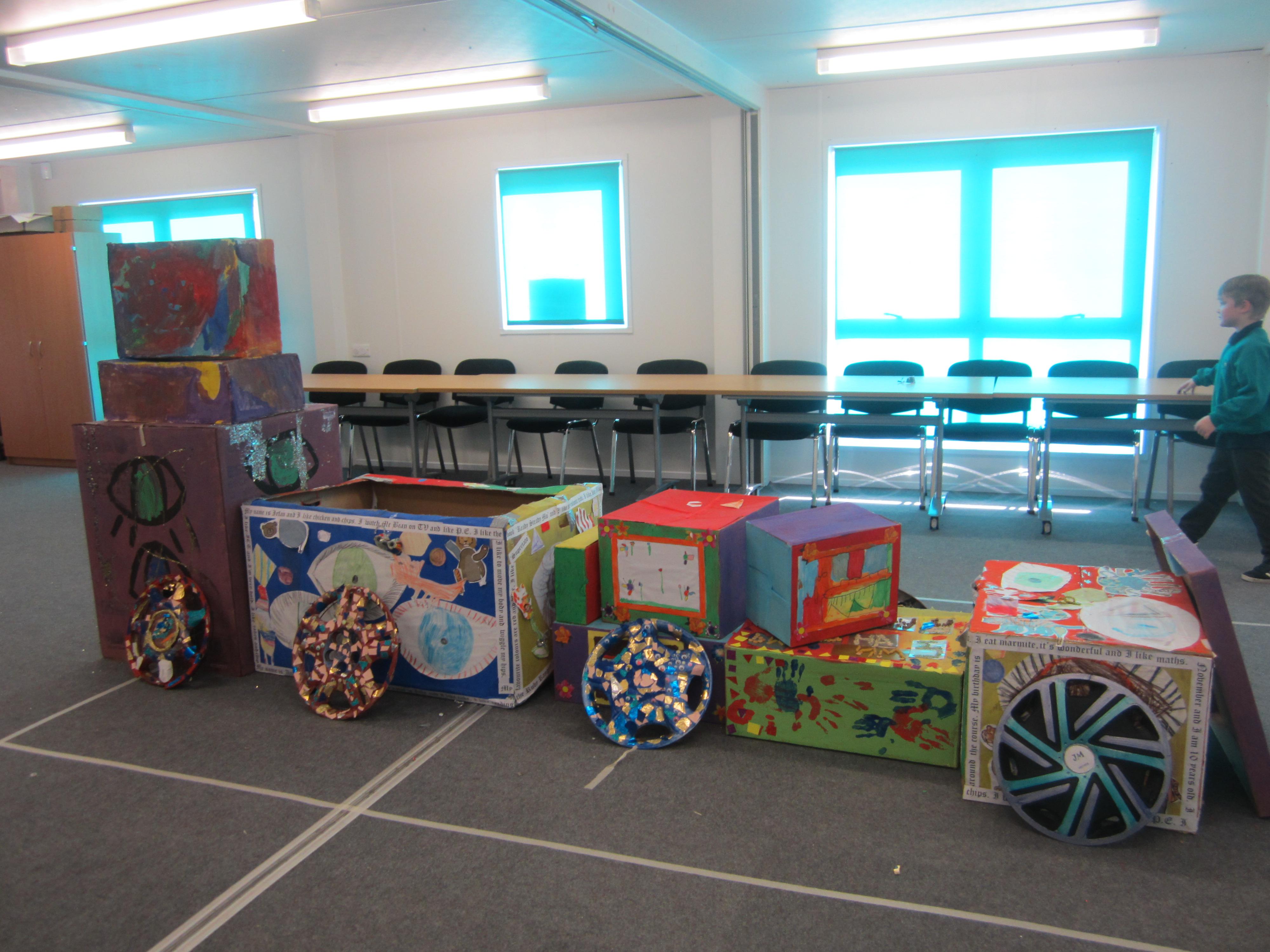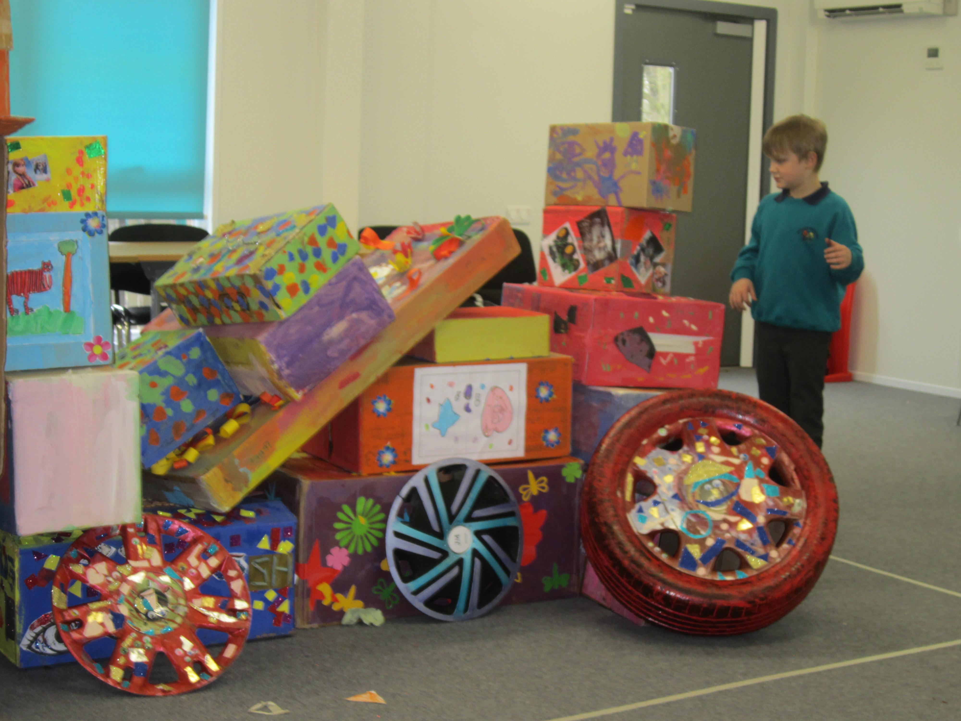 We were really excited to head for Jade room and add our two decorated boxes to the pile, to make our truck. The children were really focused on exploring and arranging the boxes, and totally engaged in the project. When some of their friends from last year, who are now at our new East site, turned up to join in, it was a lovely surprise. It was so nice to see our children recognise them (and in some cases, their last year's teacher) and be so delighted to see them, greet them and play together again.