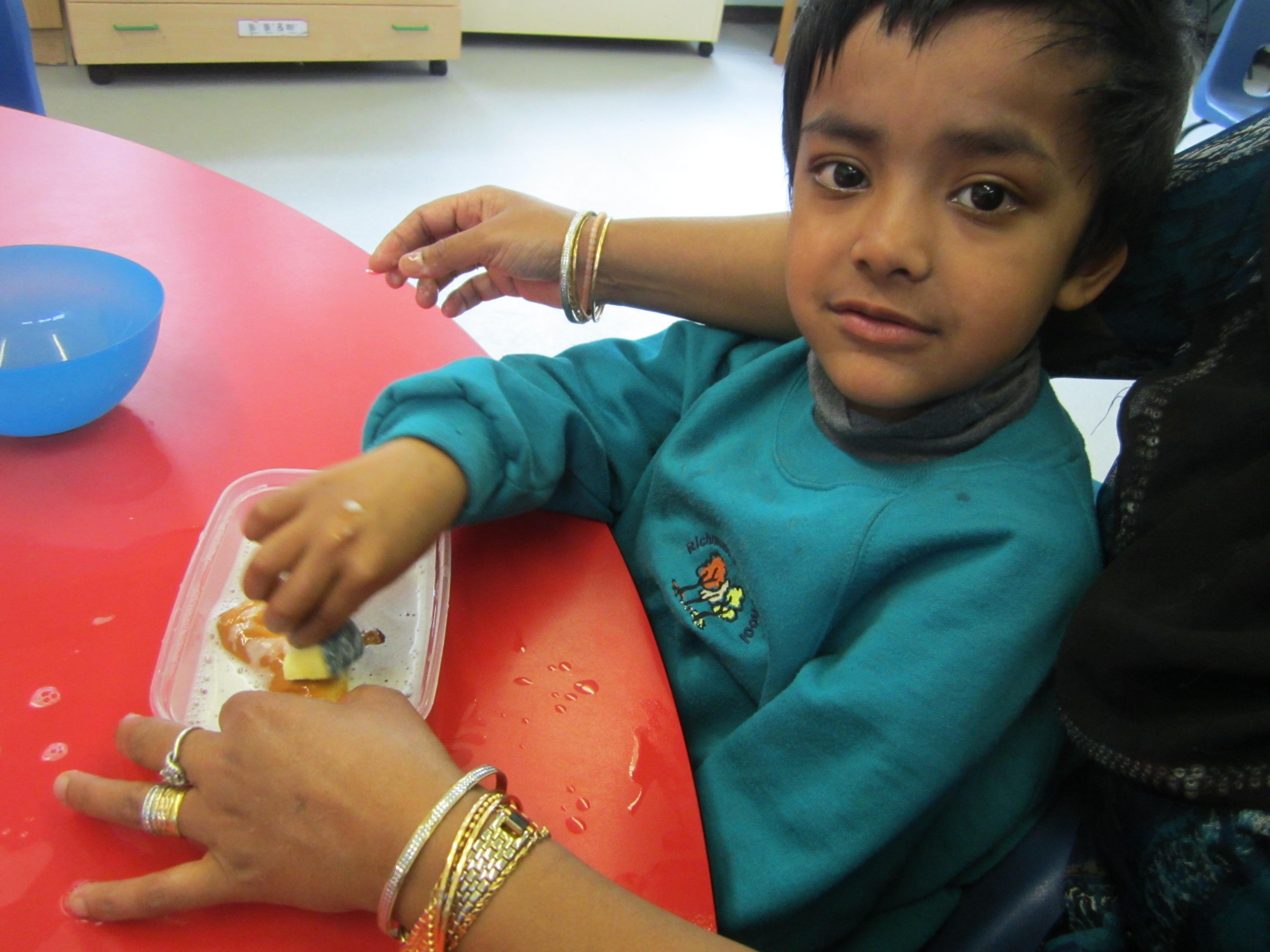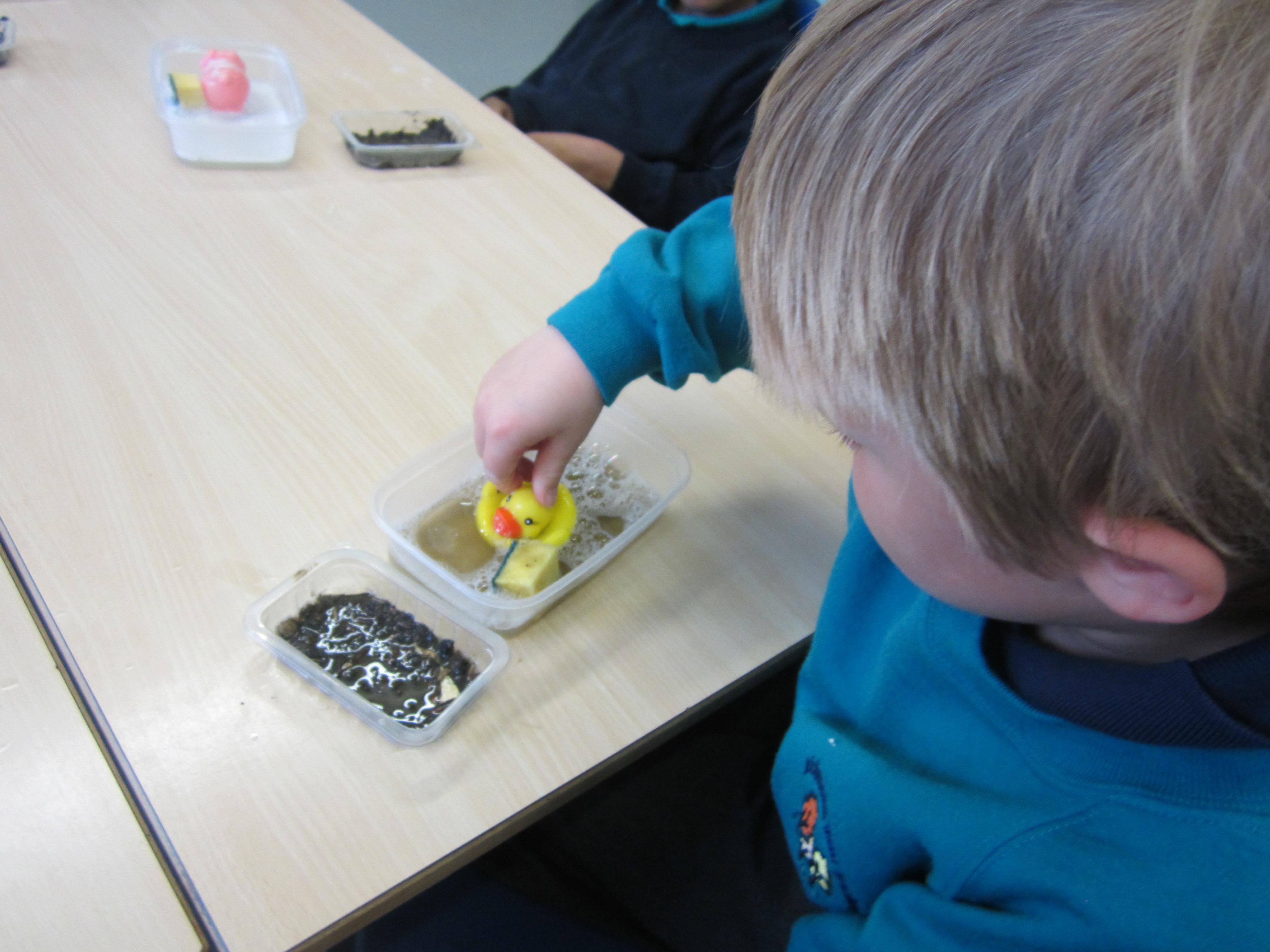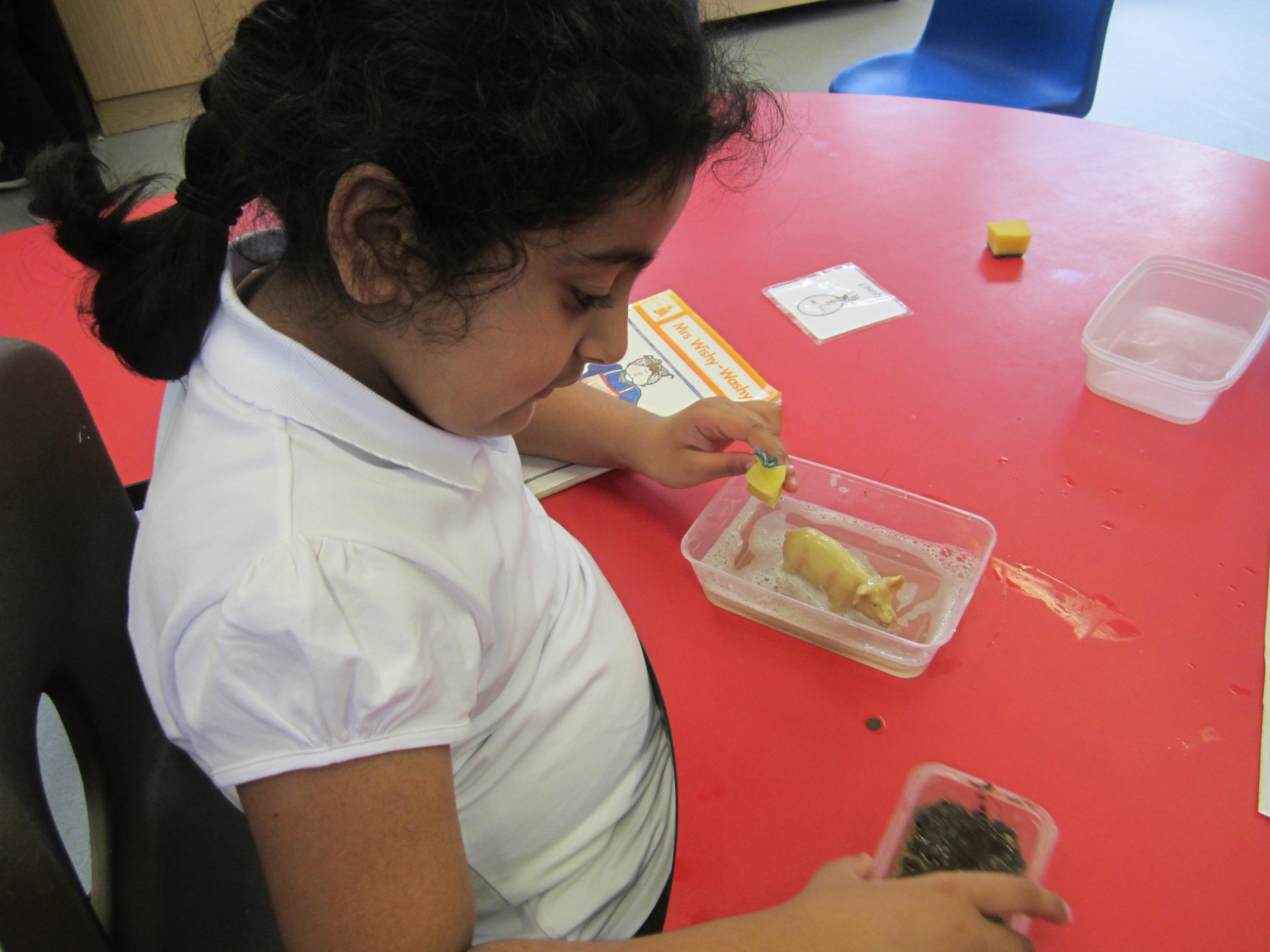 The children are really enjoying our story about Mrs Wishy Washy. Today they made their toy animals roll, jump or paddle in the mud. They then put them into their tubs of soapy water and washed them clean... before muddying them up again!