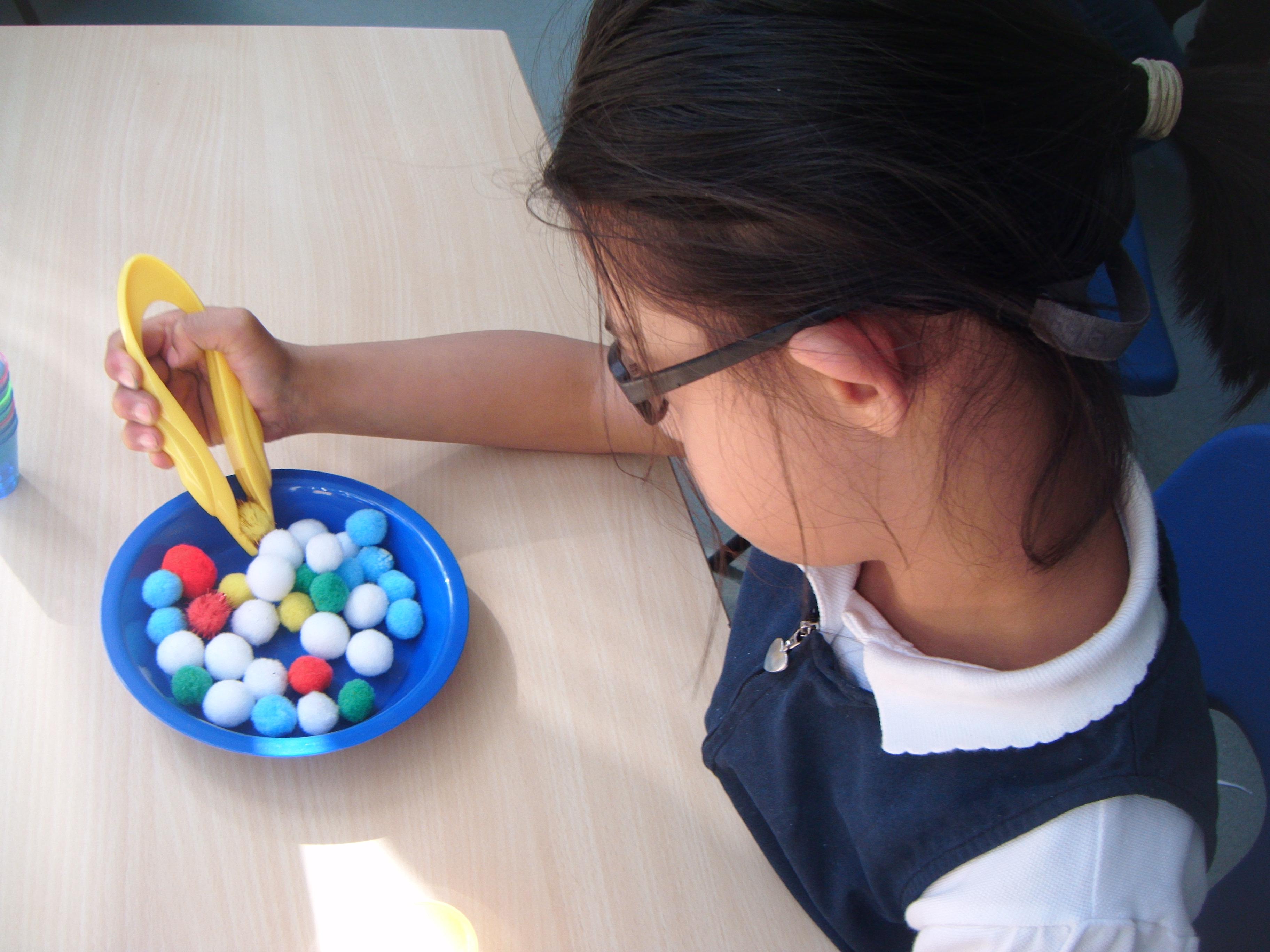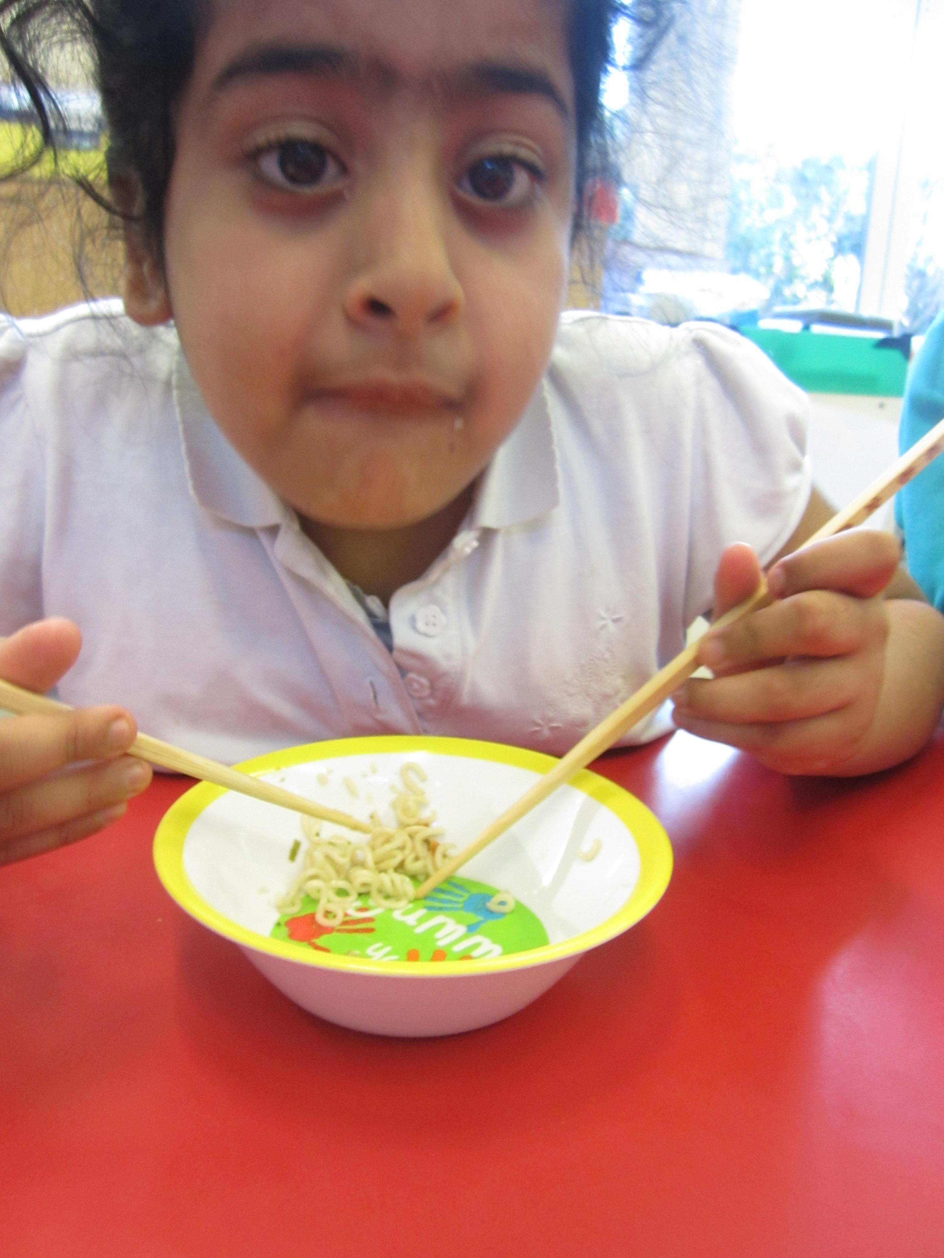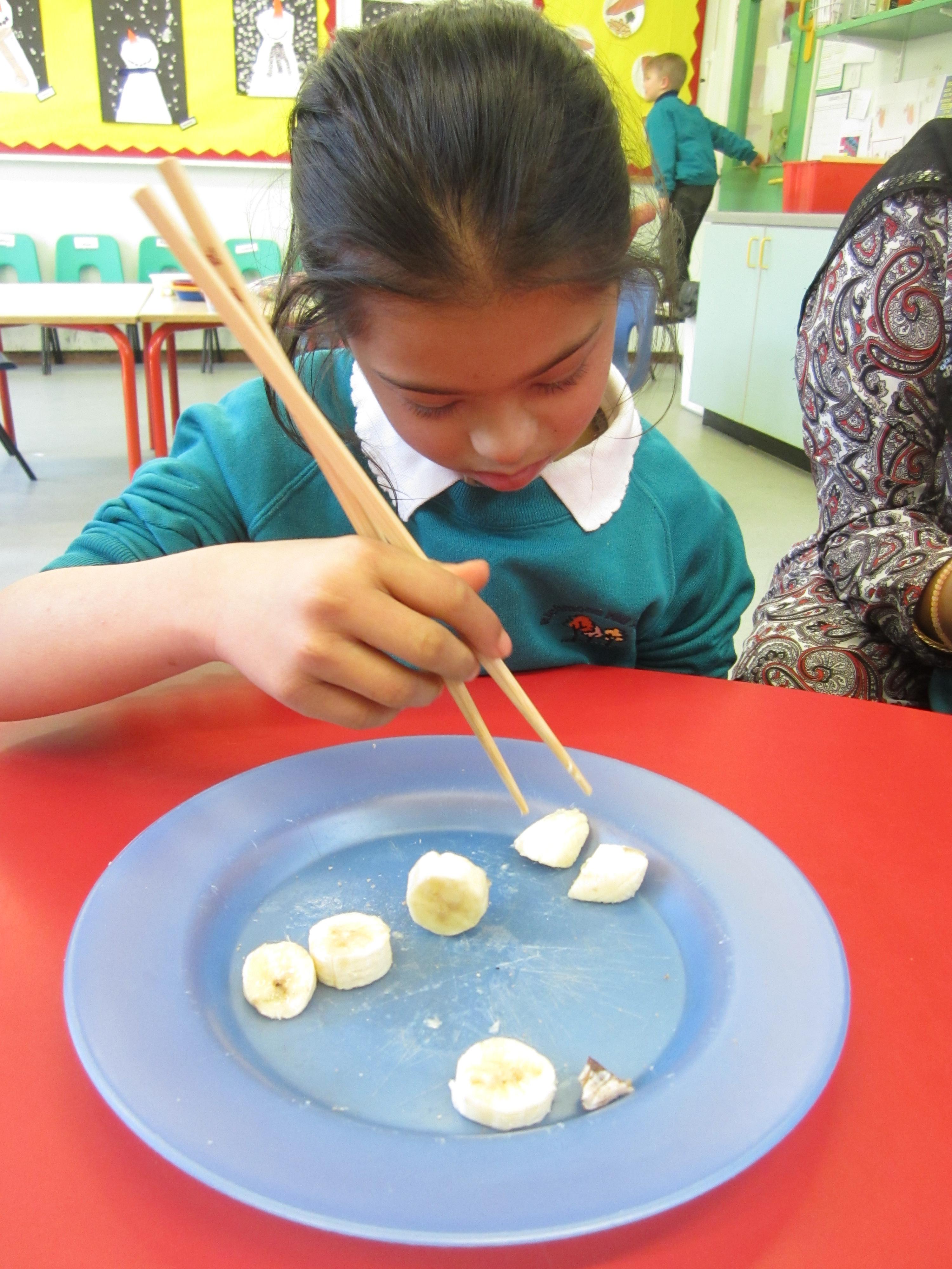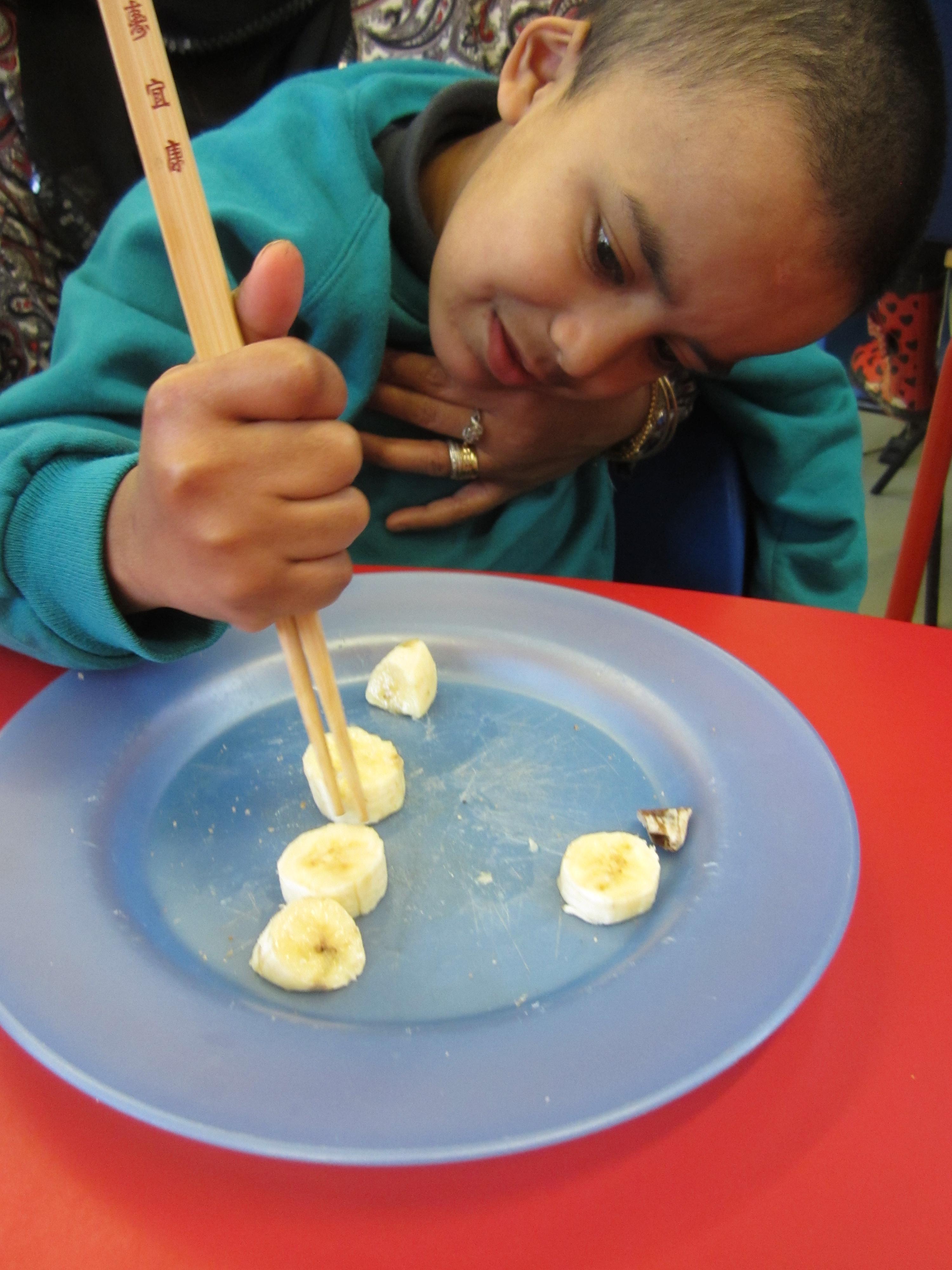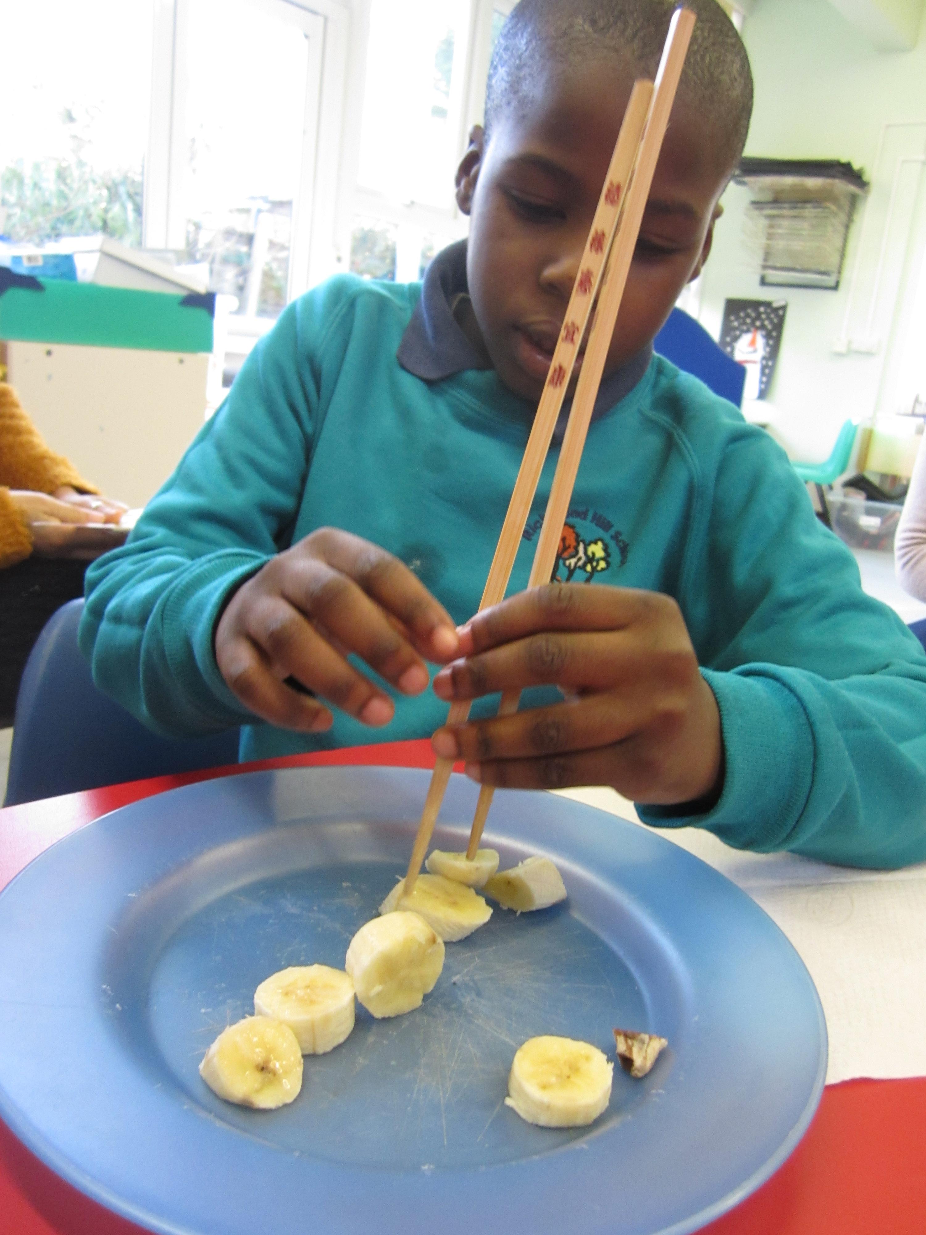 We had lots of fun with chopsticks! First the children practised using pom poms and pipe cleaners, then they tested their skills by picking up slices of banana.
