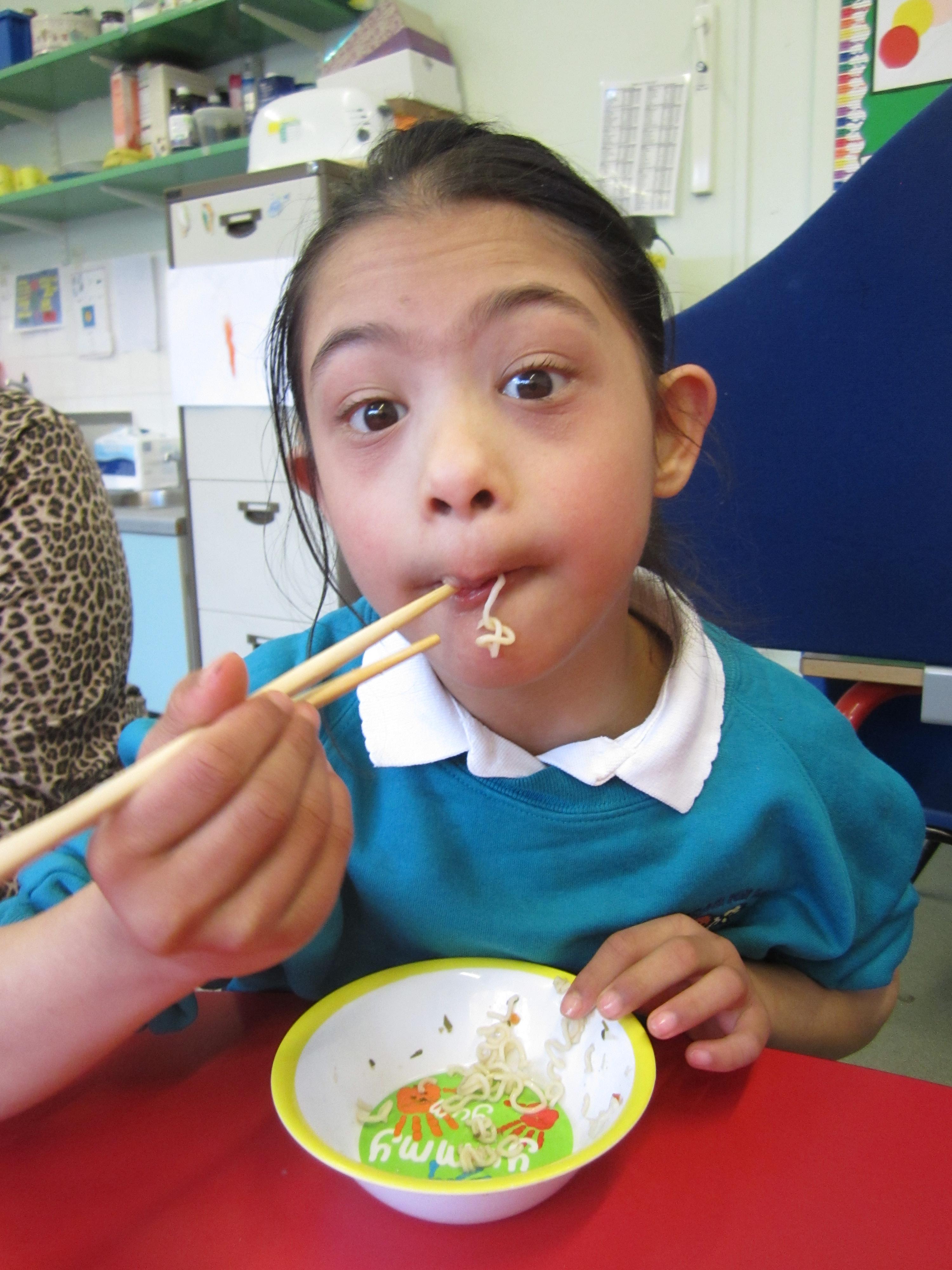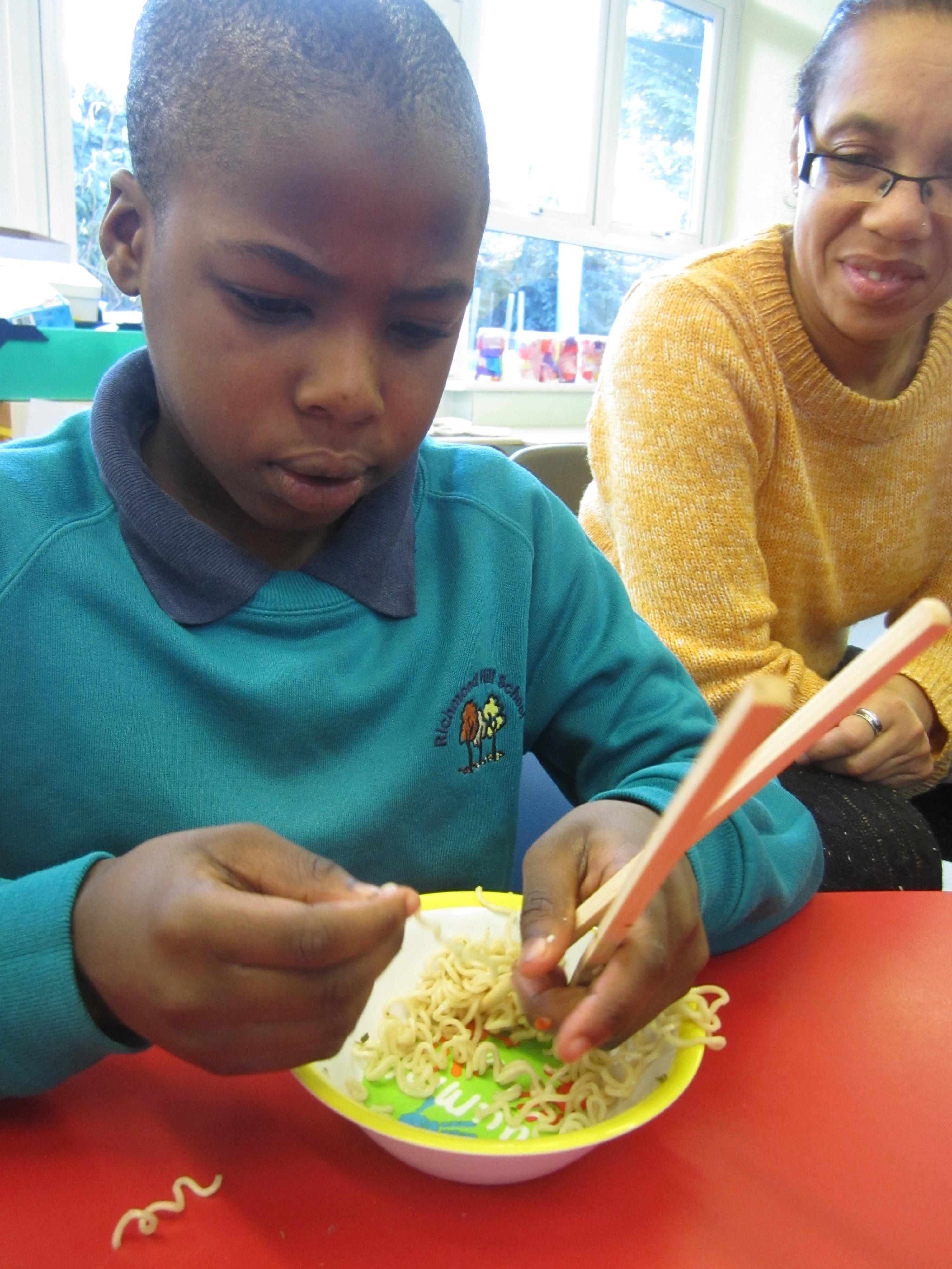 Finally, we graduated to trying to eat noodles with chopsticks! It was a lot of fun, and developed their fine motor skills along the way.