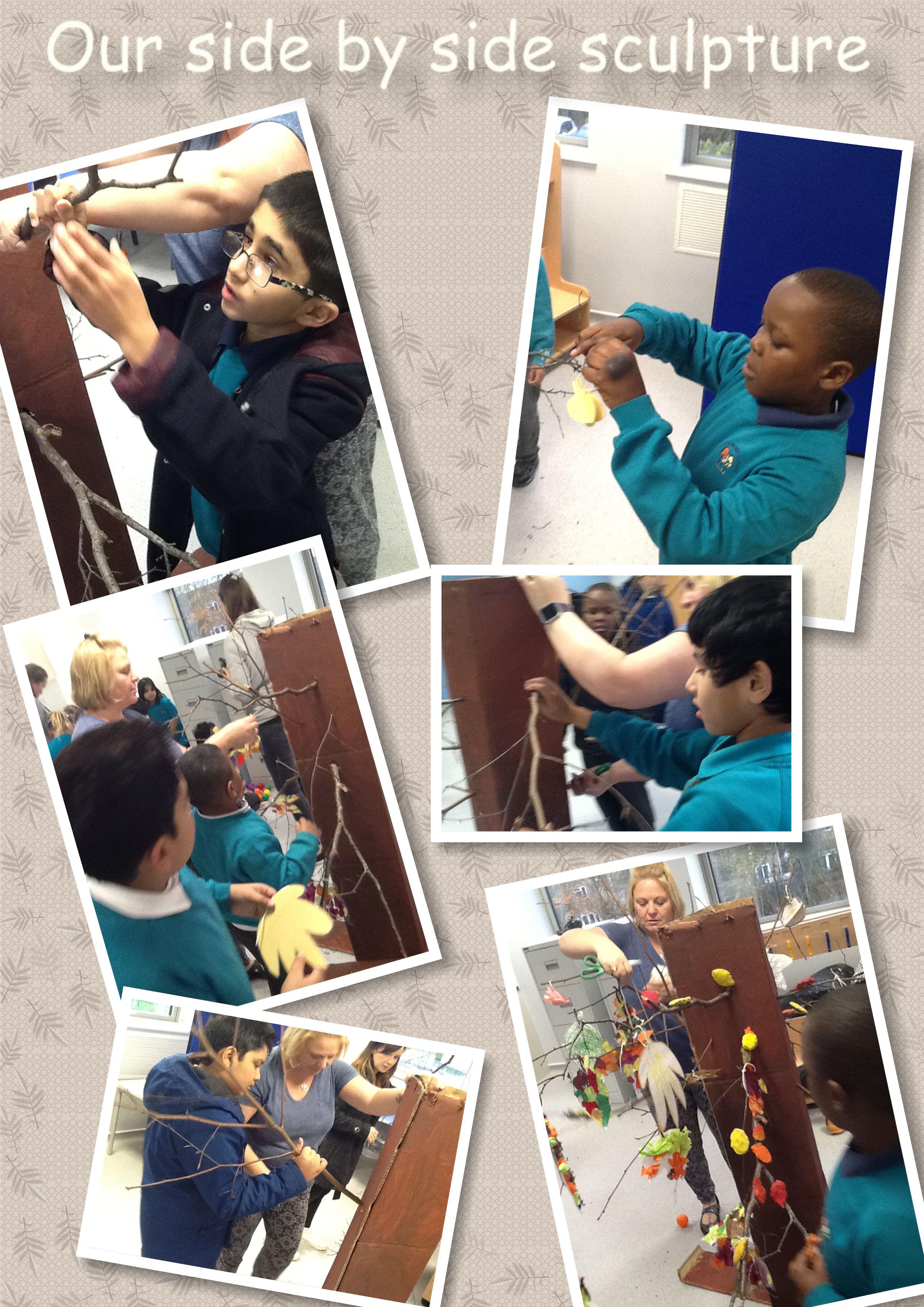 We collaborated with our buddy classes from East to make a tree sculpture. Green Class enjoyed making and designing some leaves and constructing the tree as a team over at East.