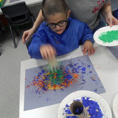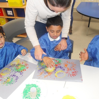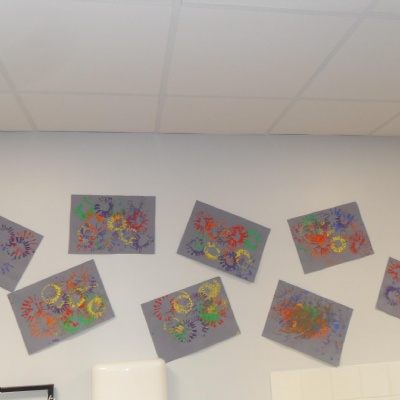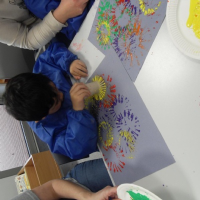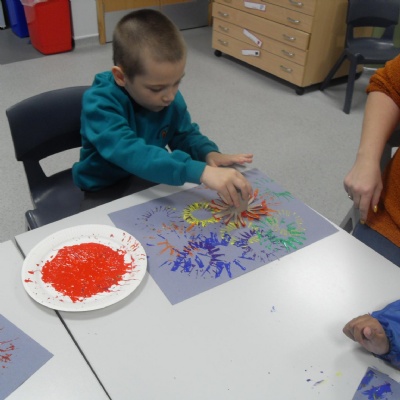 We used cardboard tubes with splayed bottoms to print firework paint pictures.
