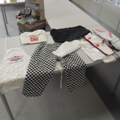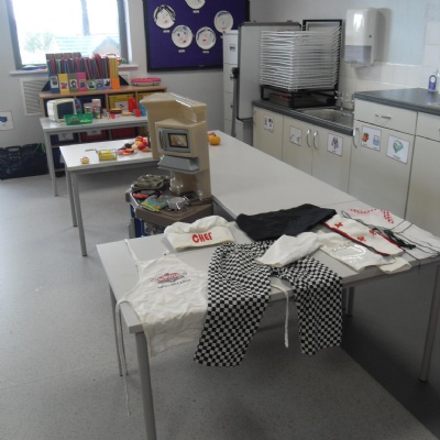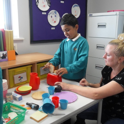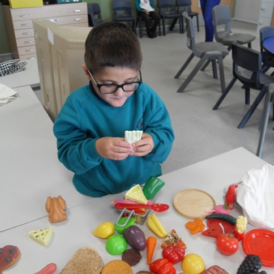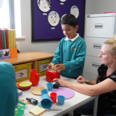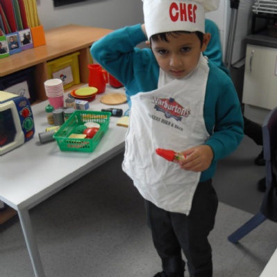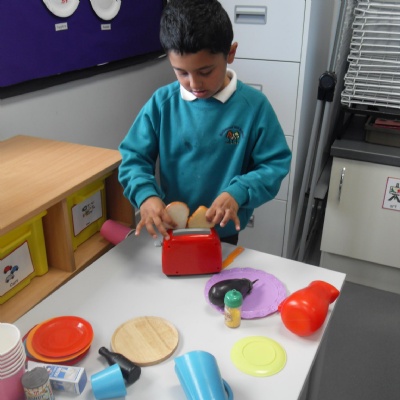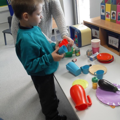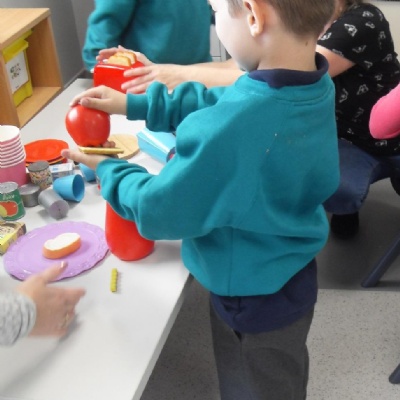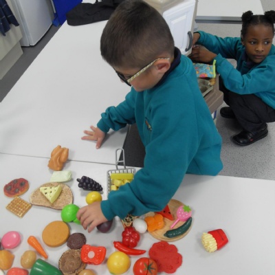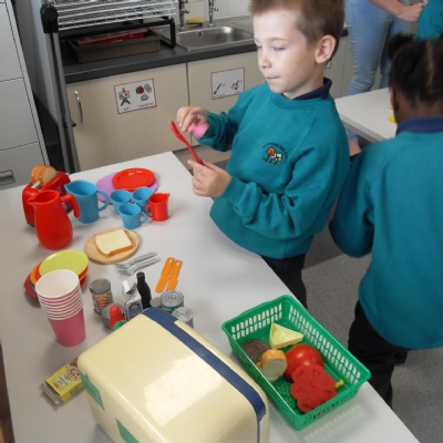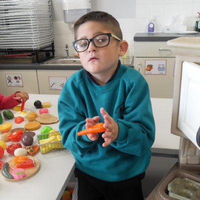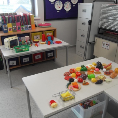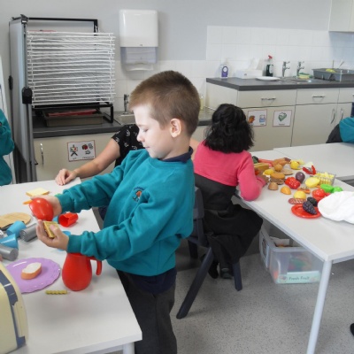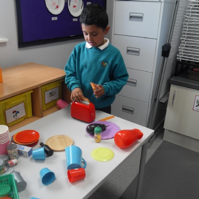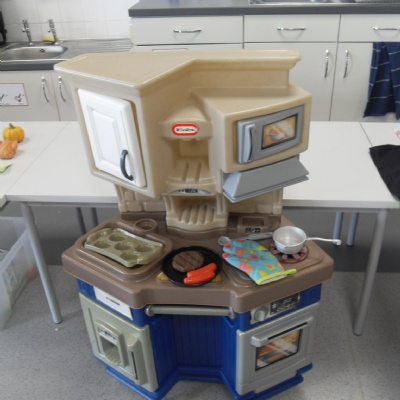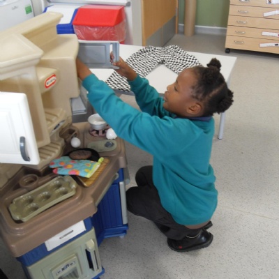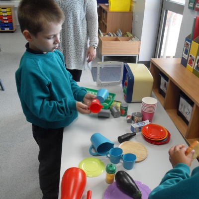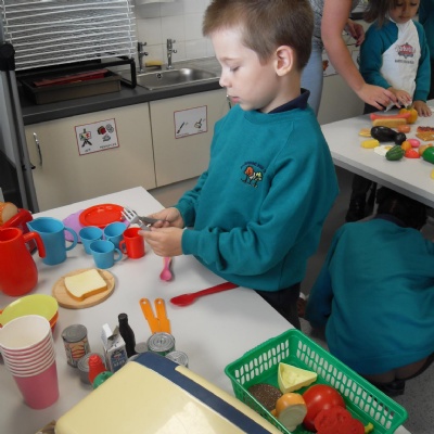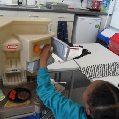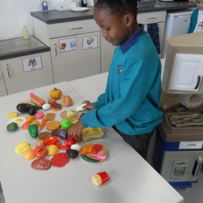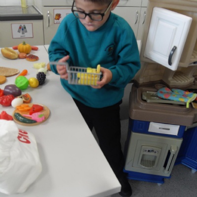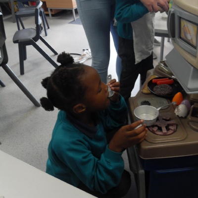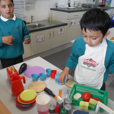 The children role-playing and interacting with the kitchen and food as part of topic work.