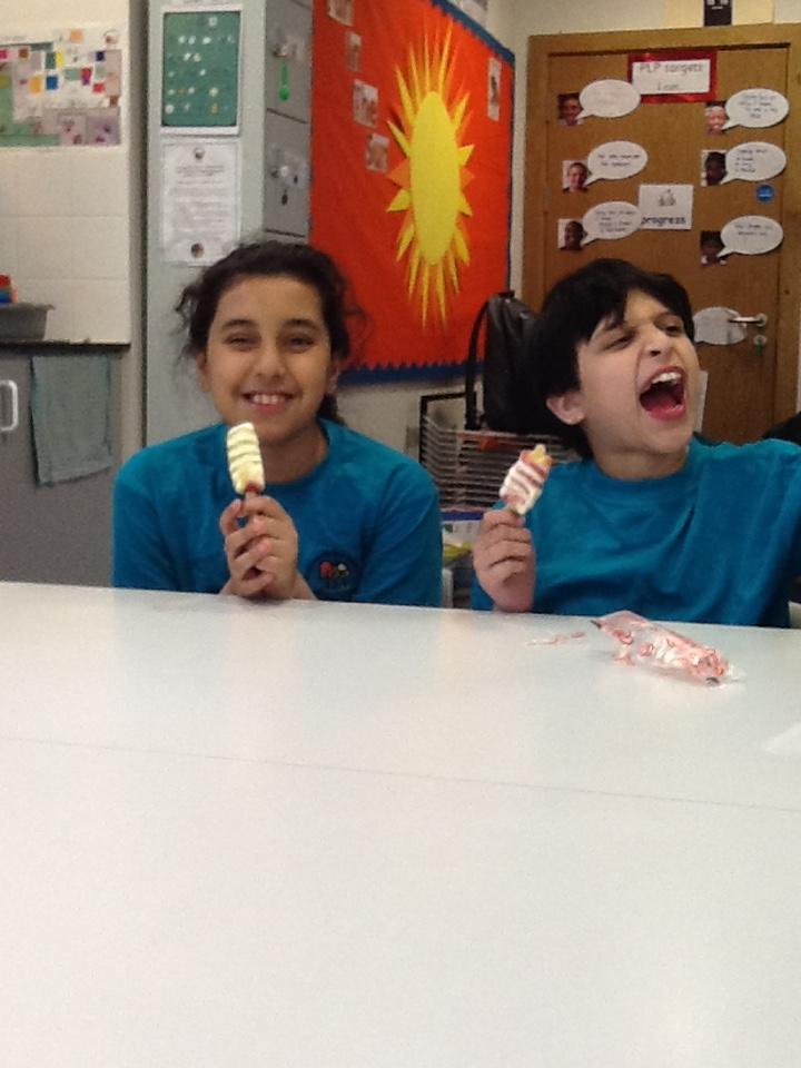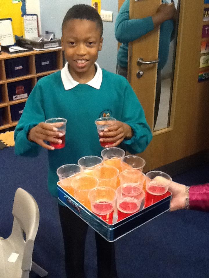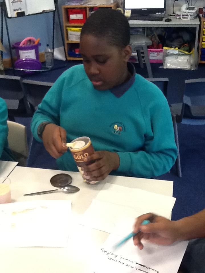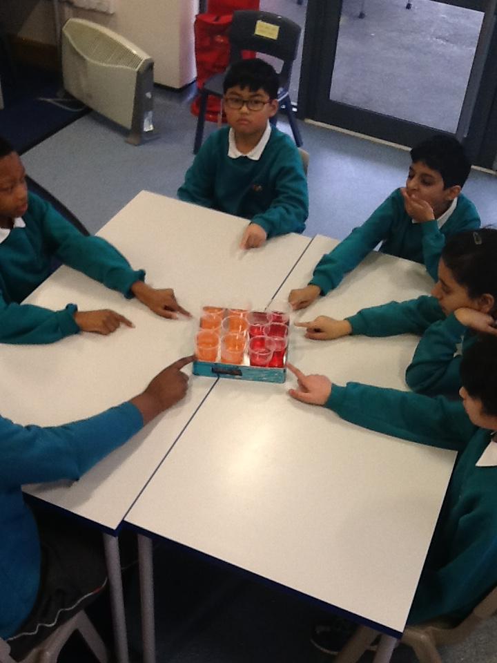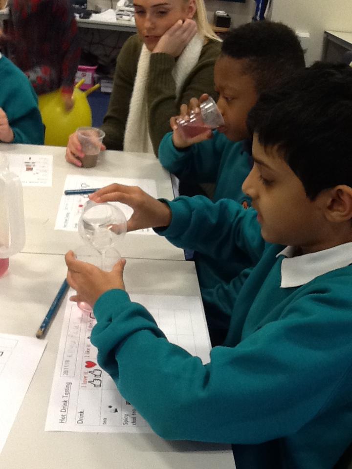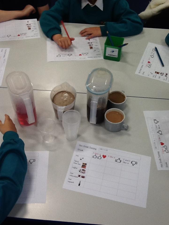 We have been warming ourselves up with some 'hot drink tasting'. We tasted: tea, spicy chai tea, coffee, hot chocolate and hot blackcurrant squash. It made us feel warm when we drank them and the favourite drink was...hot chocolate!