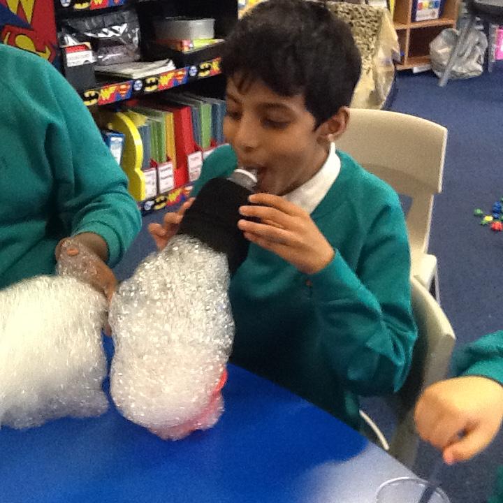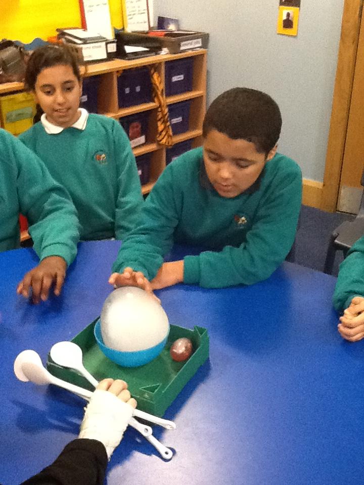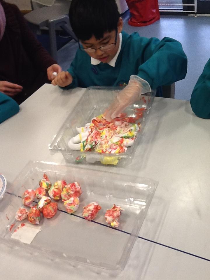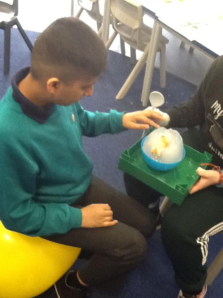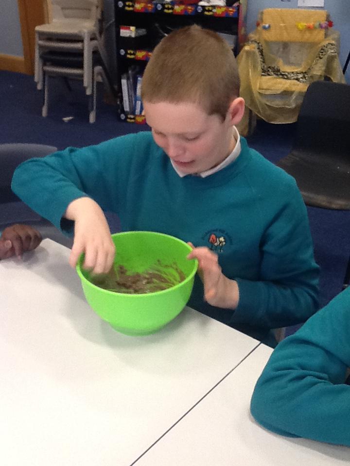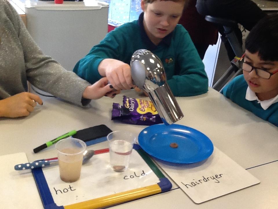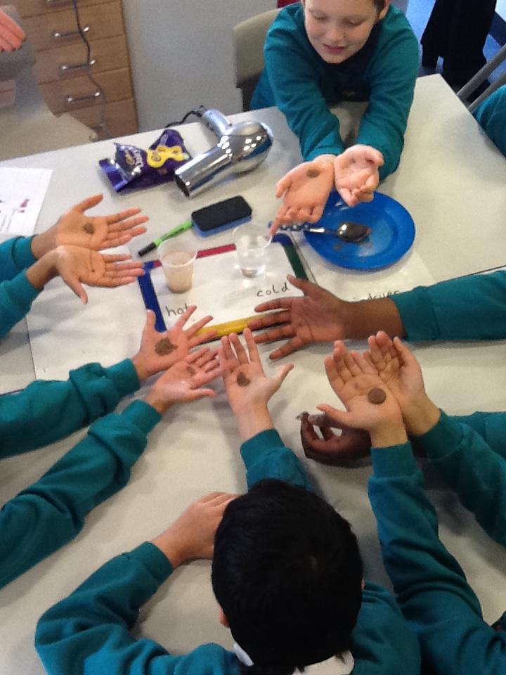 We have been investigating chocolate and what happens to it when put in cold and hot water, under a hot hair-dryer and wrapped inside warm hands! Lots of melted chocolate and sticky hands!