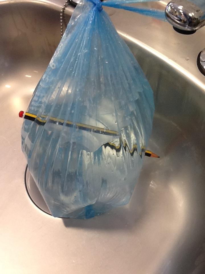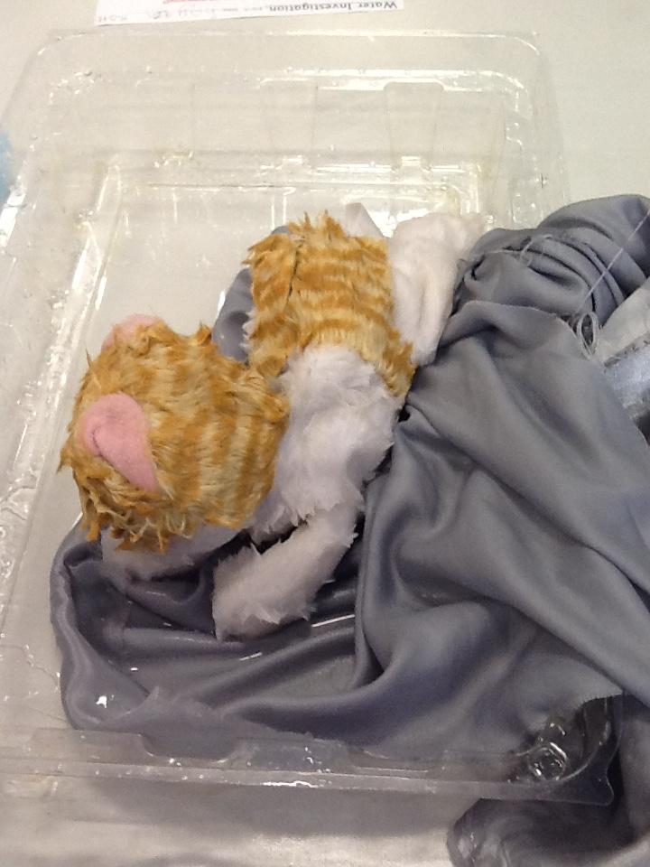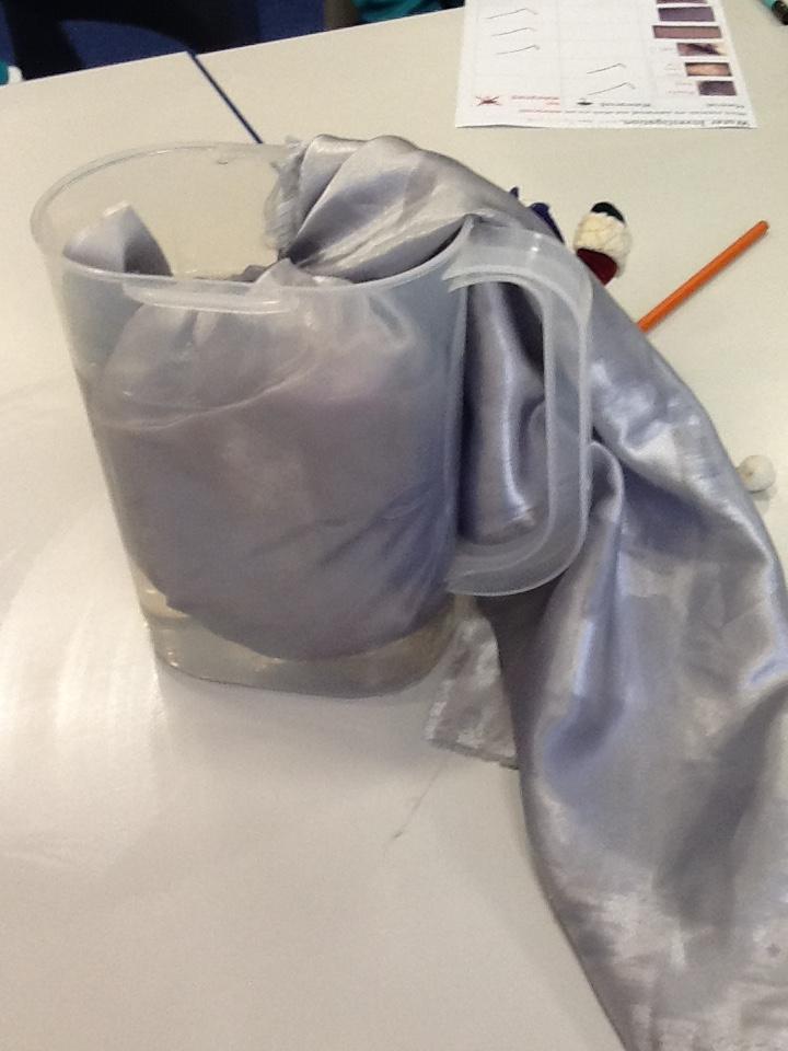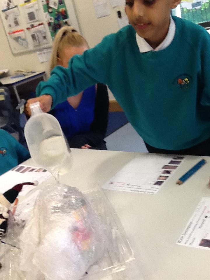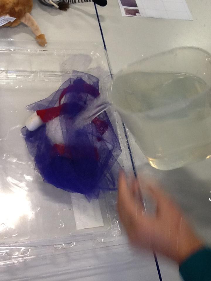 We put a teddy inside each material and poured water over the top.