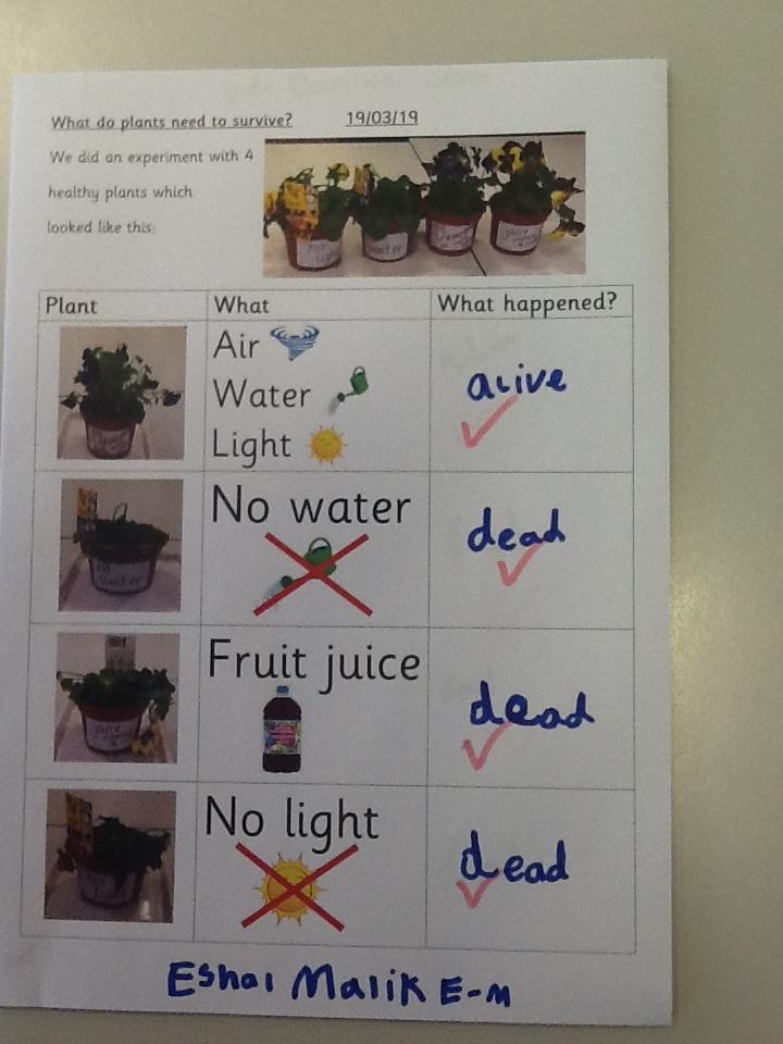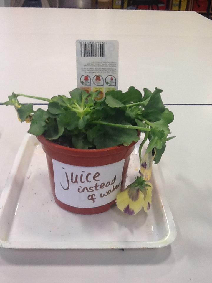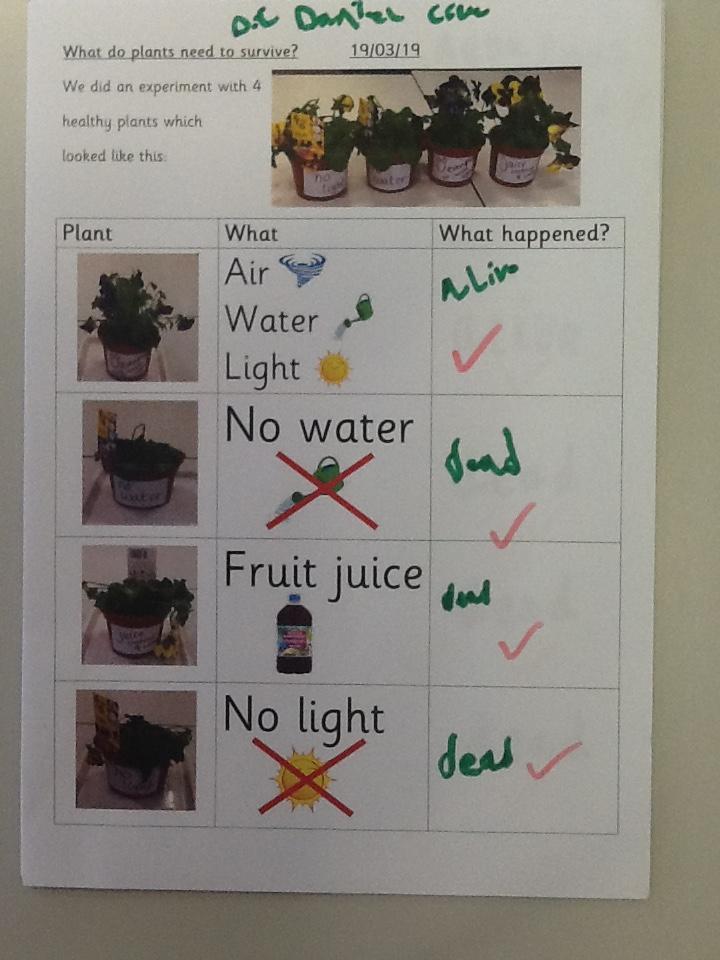 We did an experiment with four plants - one had water, air and light, one had no light, one had no water and one had juice instead of water...here are our results.