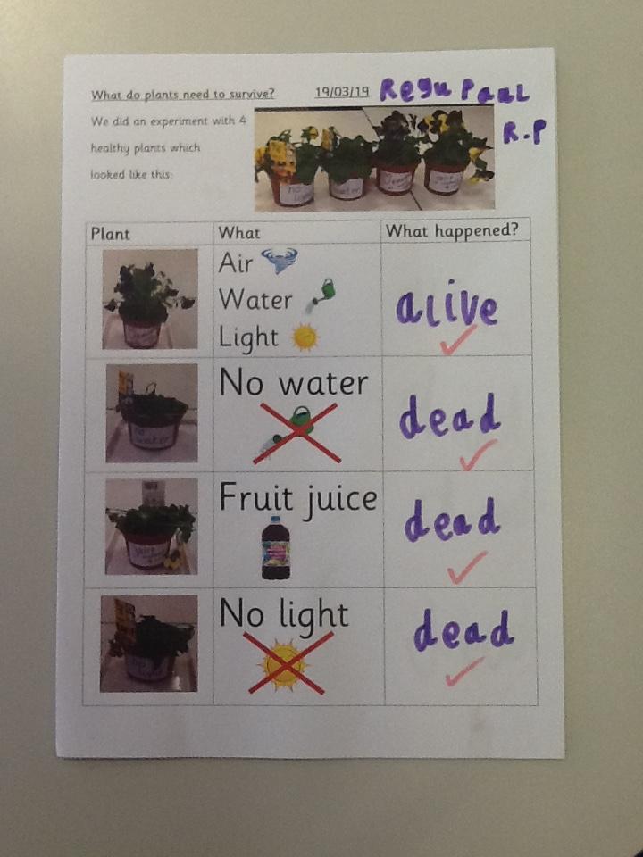 This week in science we have been investigating what plants need to survive.