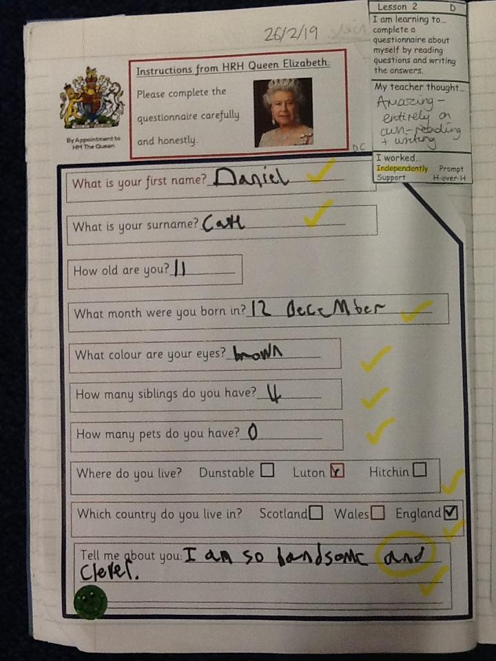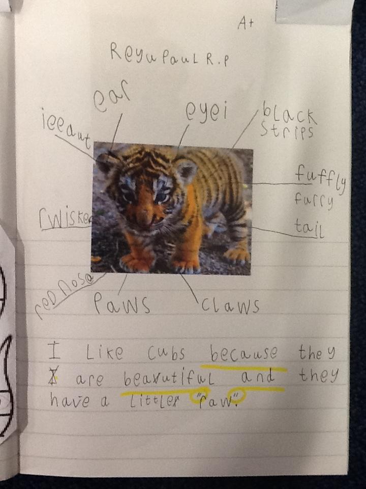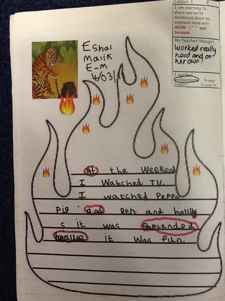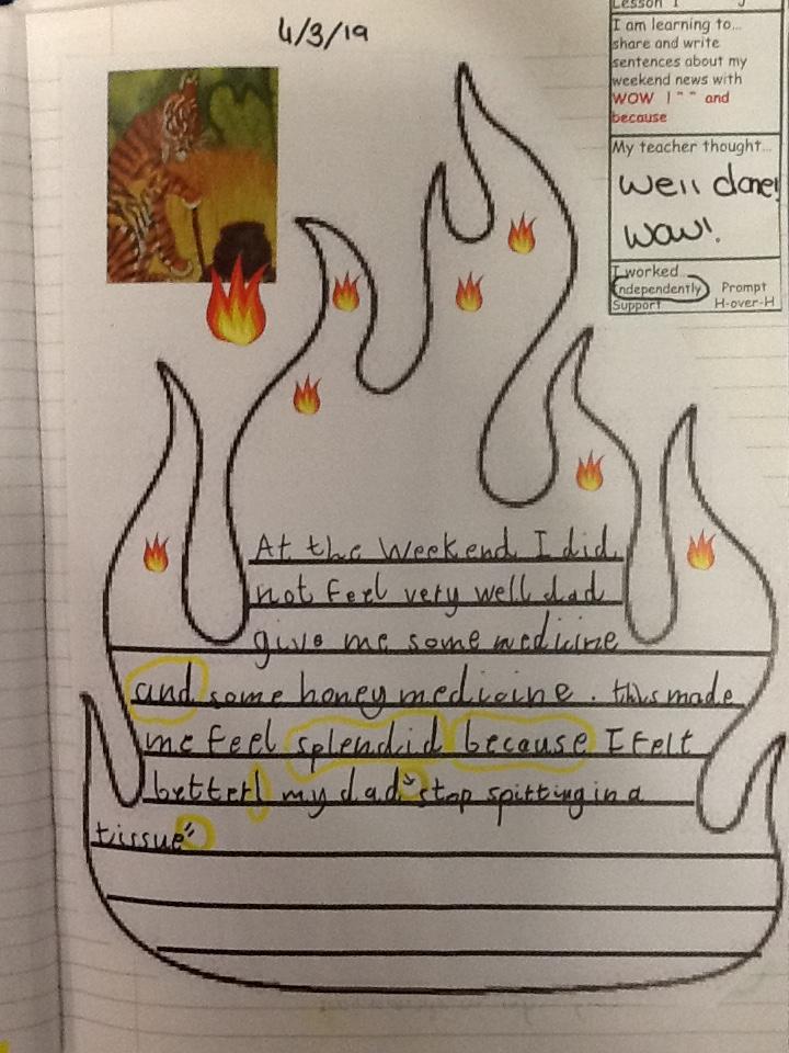 Here is some of the children's AMAZING literacy work from this week (a theme of our story The Tiger Child, our topic Great Britain and PLP targets of asking questions). Every week the children write their weekend news with a checklist of features to include, such as the WOW word of the week. The children spend time with their 'magic pen' finding and circling their WOW words, and, because, certain sounds in words ! ? and " " .