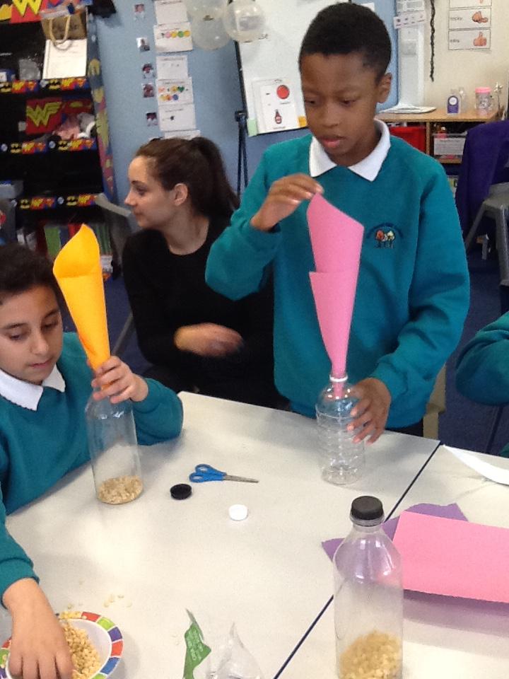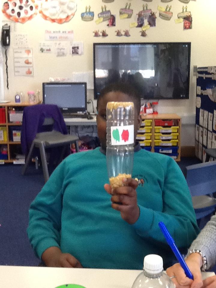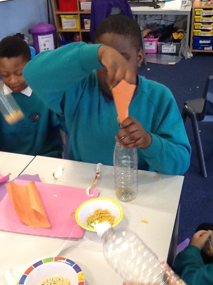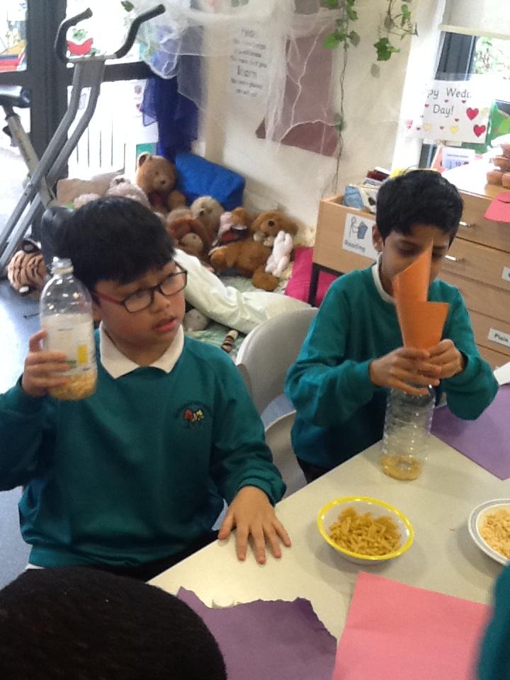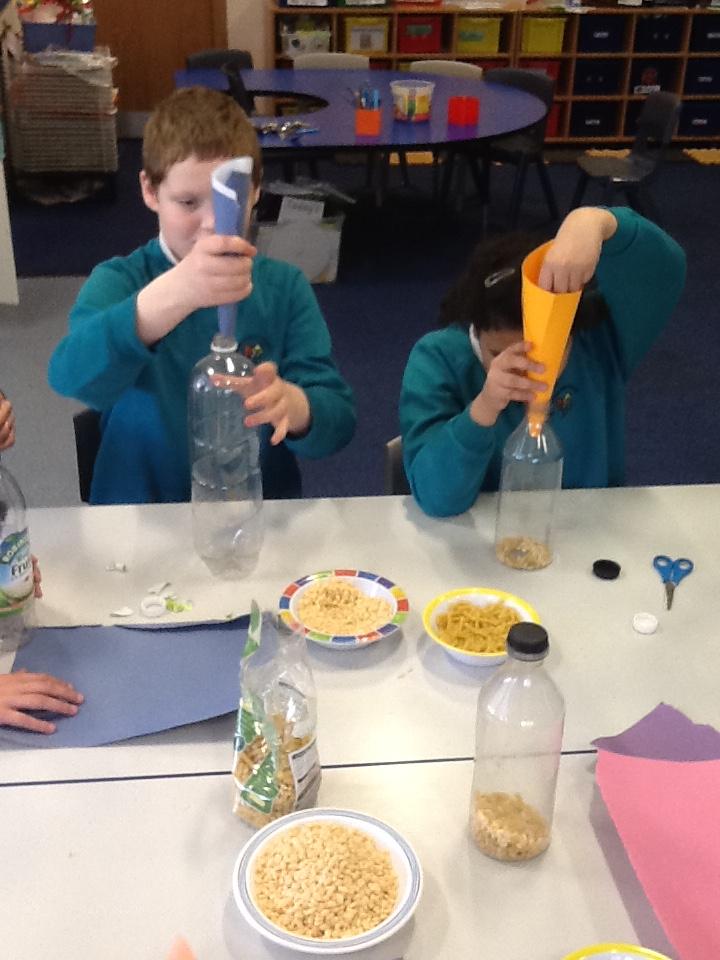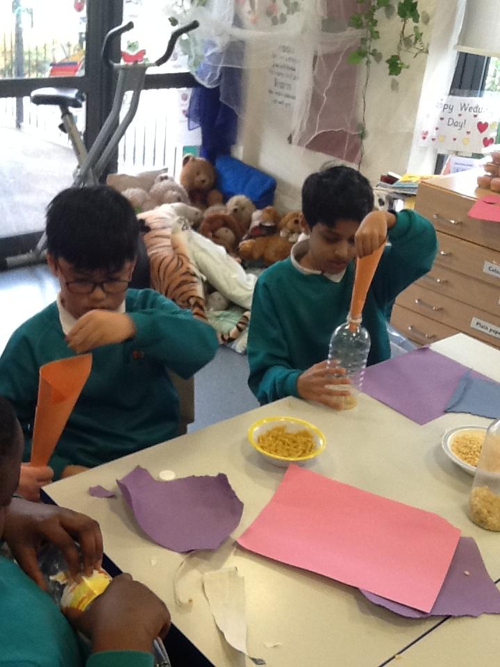 In science we have been making rain shakers and exploring how to make the rain sound loud and quiet. We experimented with different materials - pasta and rice pops to see what different sounds they would make inside the rain shaker.